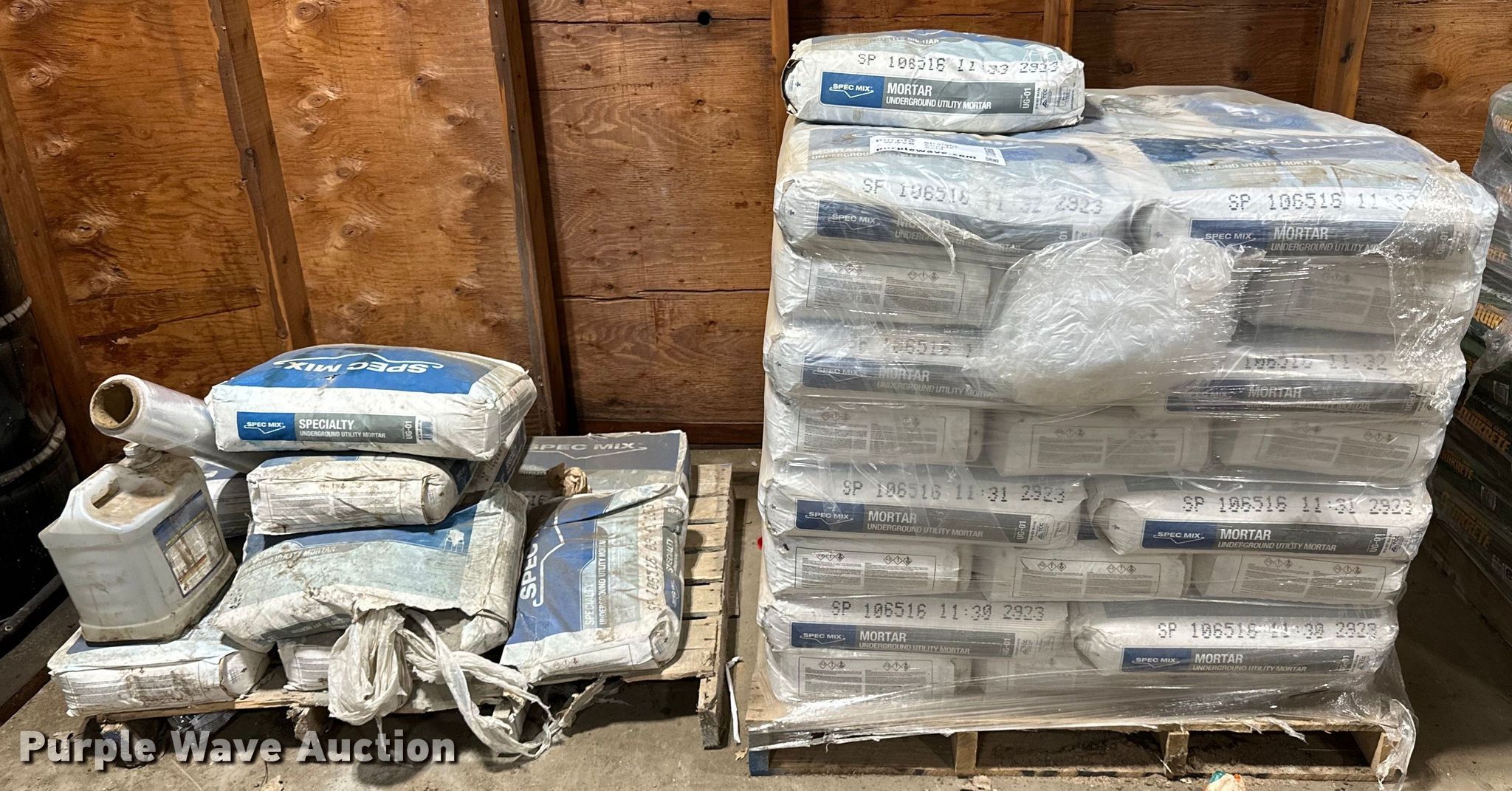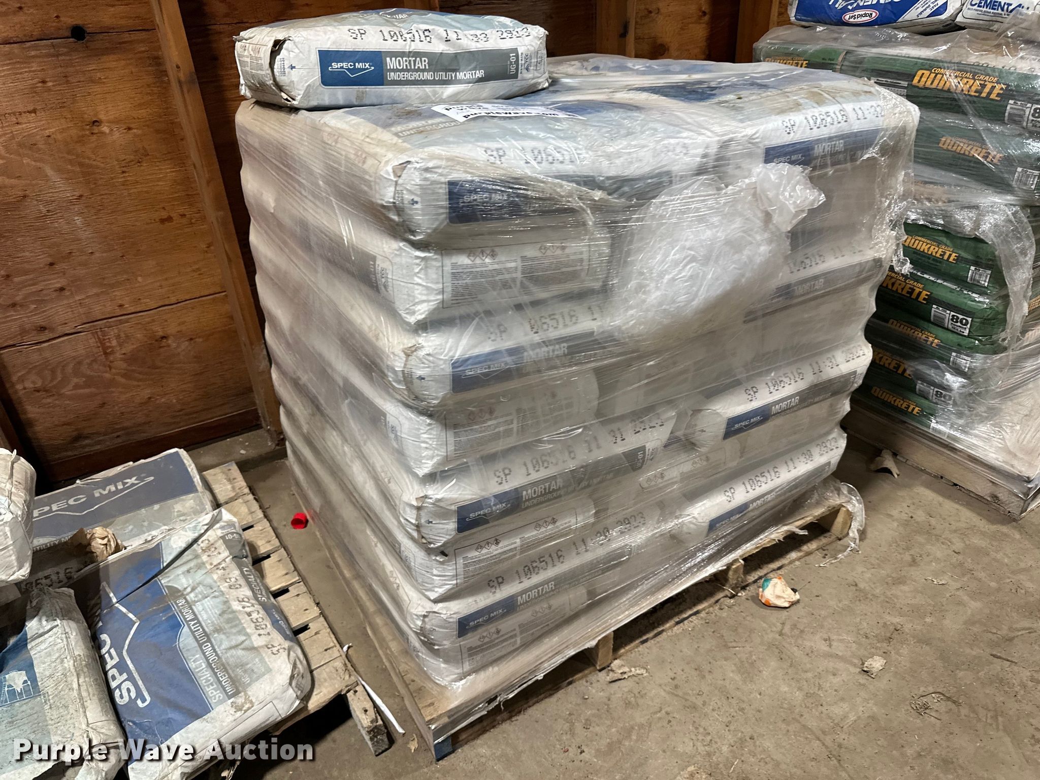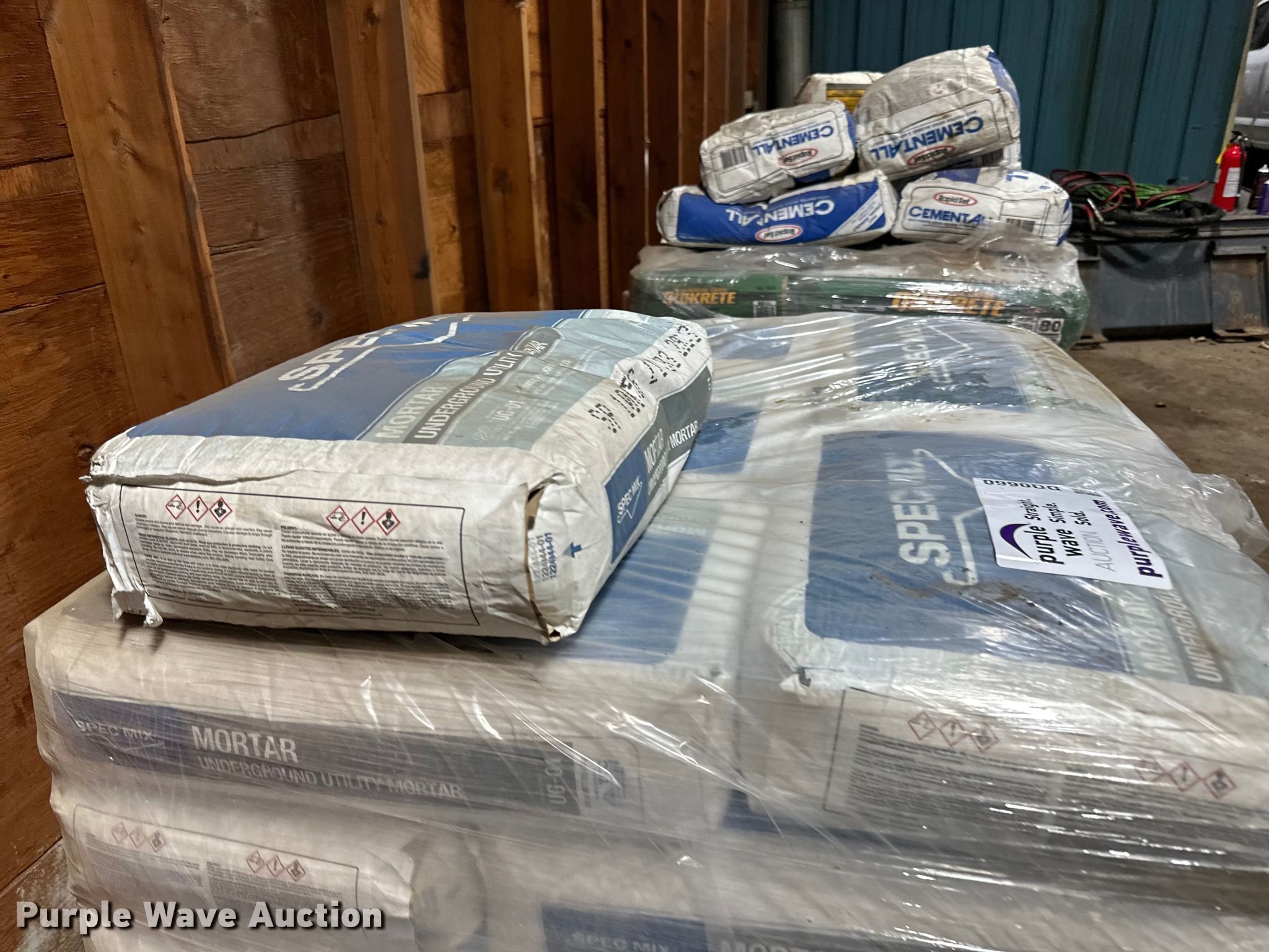 Approximately 57 bags of Spec Mix mortar mix. T.A. Schifsky & Sons, Inc - Open Inspection April 6, 10, and 13. 6077 Lake Elmo Avenue North. Stillwater, MN 55082