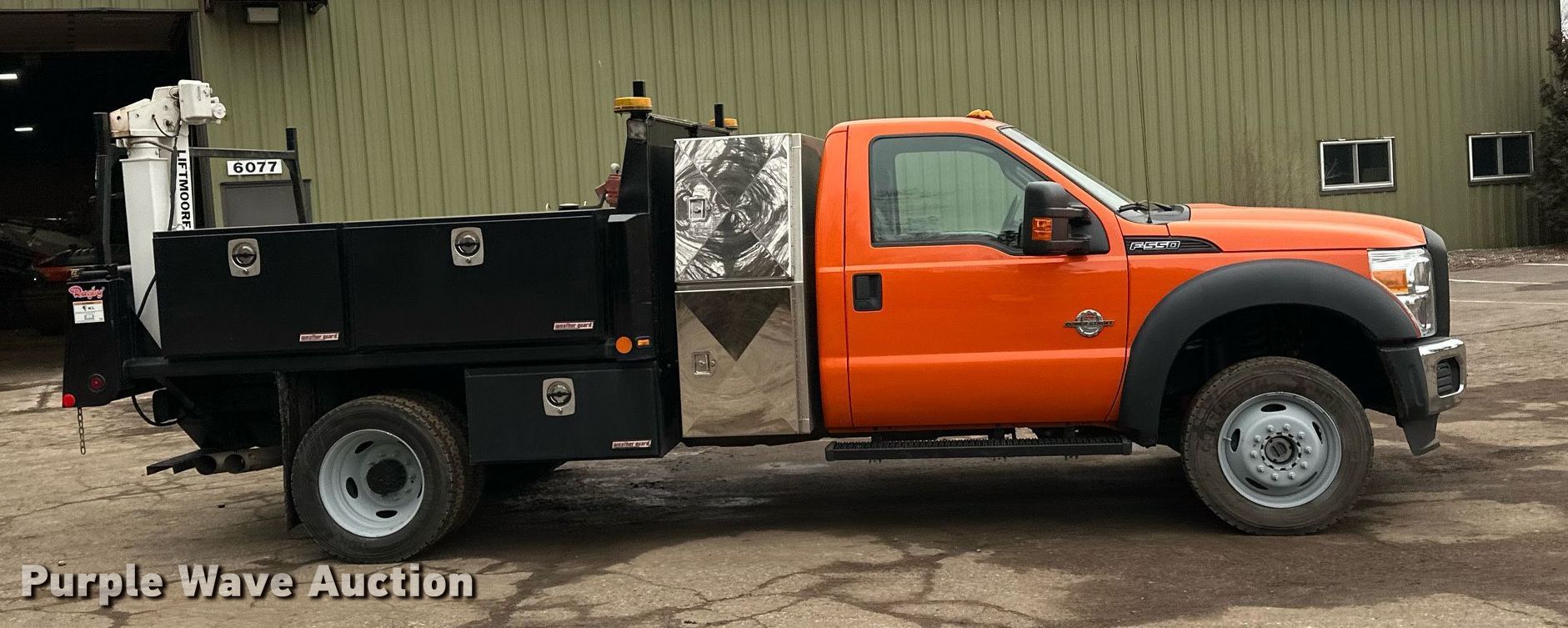 2016 Ford F550 flatbed truck. Miles: 77,013 on odometer, VIN: 1FDUF5HTXGEC18239. Engine Displacement: 6.7L V8 OHV, Cylinders: 8, Fuel type: Diesel. Transmission Automatic, Four wheel drive. Interior AC, Heat, Power windows, Power locks, Cruise control. Features Flatbed 9' 6" L x 8' W, Crane Lift Moore L21, Maximum boom length: 7' Maximum lift capacity: 2,000 lbs, Auxiliary fuel tank Pump GPM: 20.. Tires Size: 225/70R19.5. Notes Non-operational crane. Minnesota title. T.A. Schifsky & Sons, Inc - Open Inspection April 6, 10, and 13. 6077 Lake Elmo Avenue North. Stillwater, MN 55082
