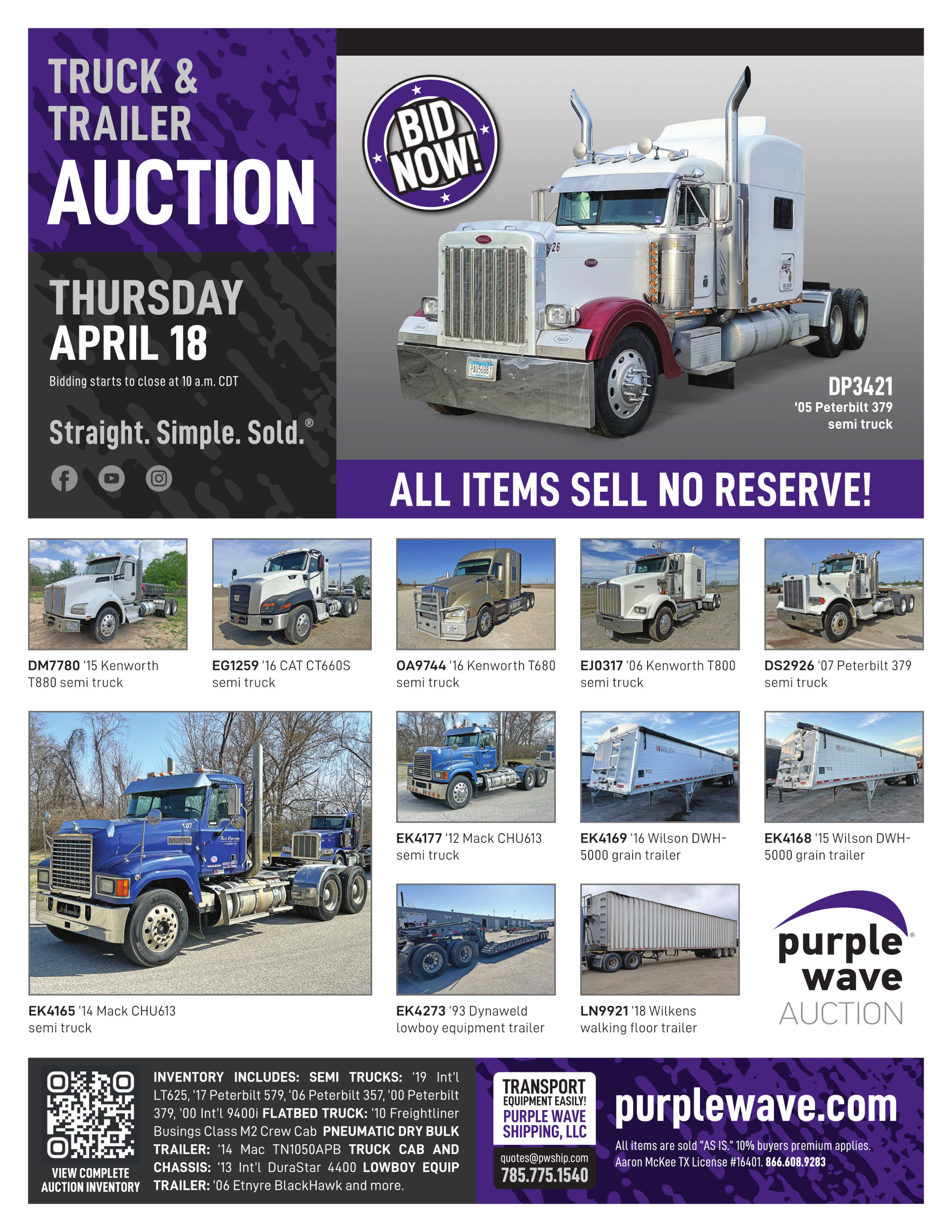 This auction is conducted by Purple Wave, Inc., whose home office is 825 Levee Drive, Manhattan, Kansas. Aaron McKee, Texas auctioneer license # 16401, operates Purple Wave, Inc. Complaints against us may be directed to the Texas Department of Licensing and Regulation, P.O. Box 12157, Austin, Texas 78711, (512) 463-6599. For additional required information, see the attached document.