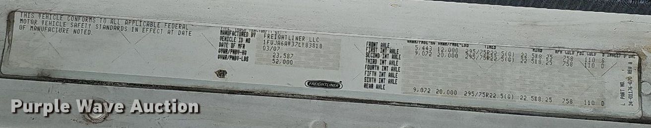 Purple Wave is selling a used Truck Tractor in Nebraska. This item is a 2007 Freightliner Columbia 120 semi truck with the following: Miles: 67,030 on odometer, Actual mileage unknown, Hours: 1,458 on meter, Actual hours unknown, VIN: 1FUJA6AV37LY83818
