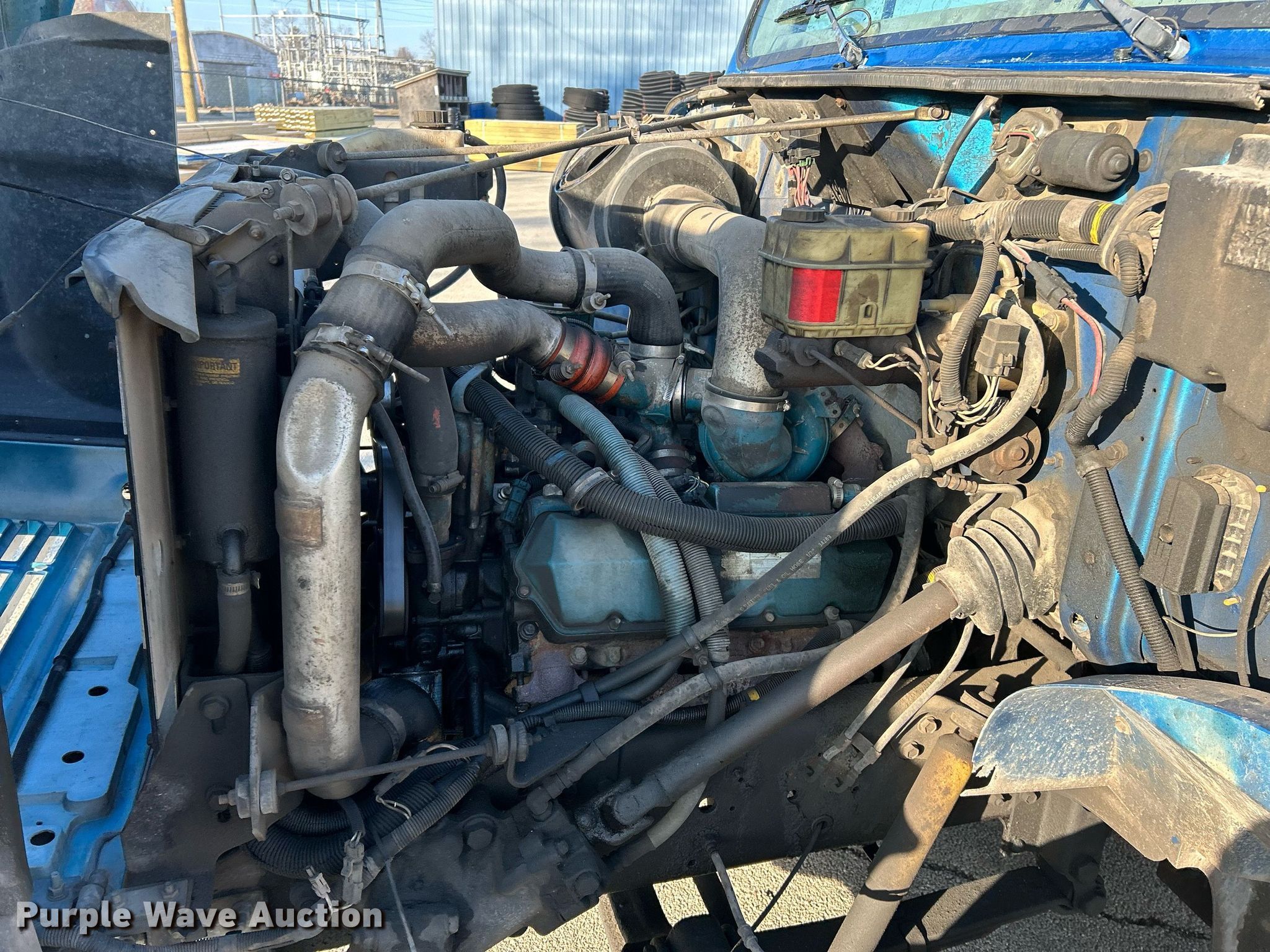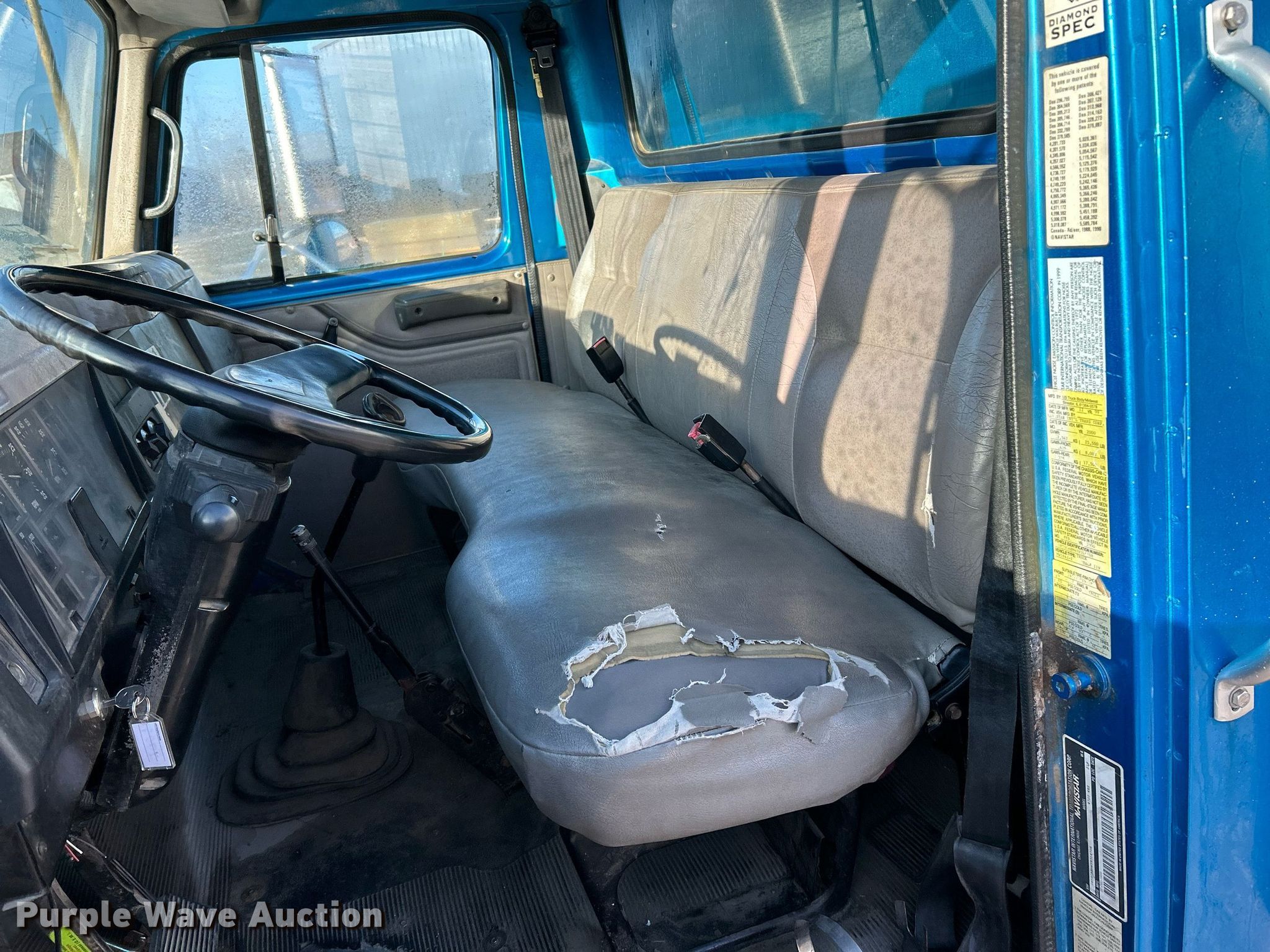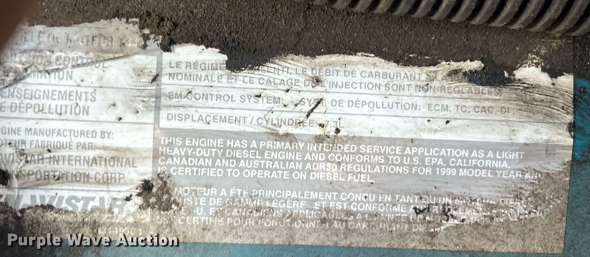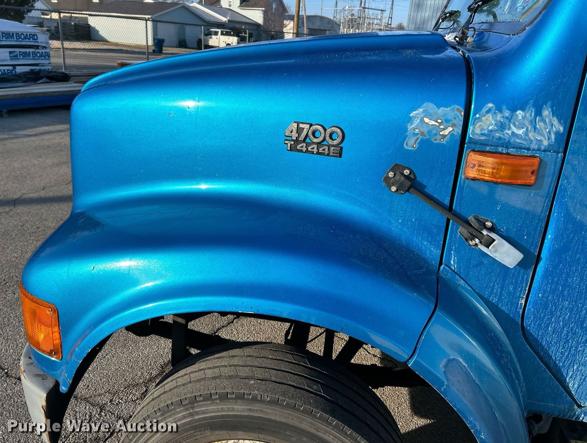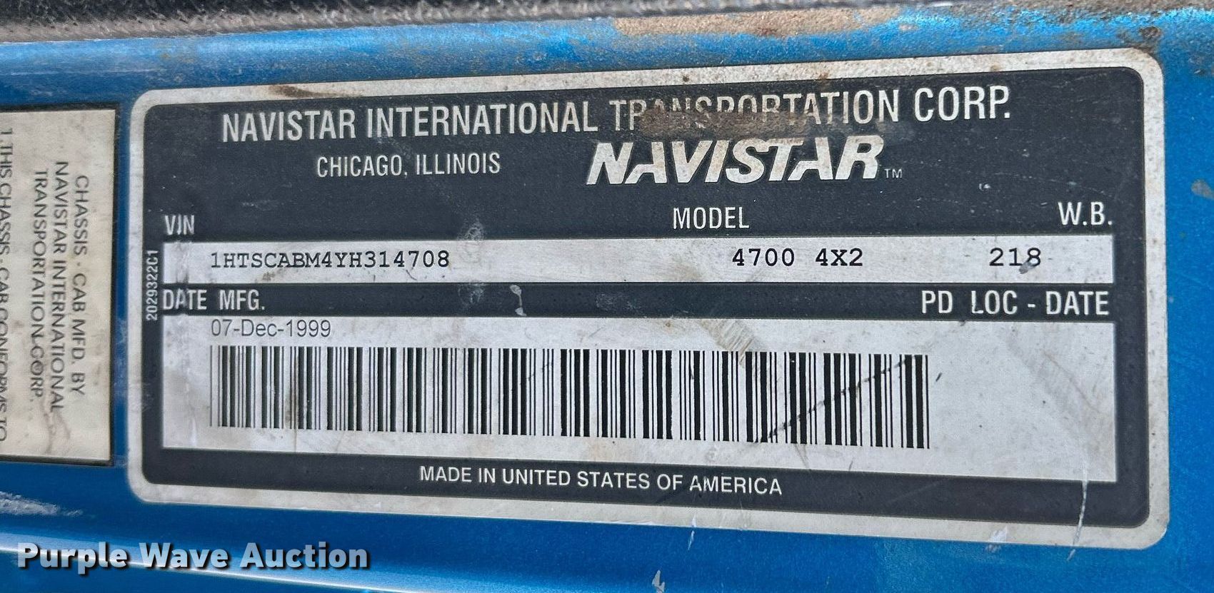 2000 International 4700 box truck. Miles: 229,431 on odometer, Hours: 10,177 on meter, VIN: 1HTSCABM4YH314708. Engine International, Displacement: 7.3L, Cylinders: 8, Fuel type: Diesel. Transmission International, Manual, Speed: 7. Chassis Axles: Single, Suspension: Spring, Brakes: Hydraulic, GVWR: 25,500 lbs, Wheelbase: 218". Interior Heat, Cruise control. Features Box bed 20' L x 93" W x 102" H, Floor: Wood, Slider ramp Width: 24".. Tires Size: 245/70R19.5. Notes Dash warning indicator: Check engine, Dash warning indicator: Warn engine, Frame issues, rusted and cracked. Illinois title. R.P. Lumber Co., Inc.. Chatham, IL 62629