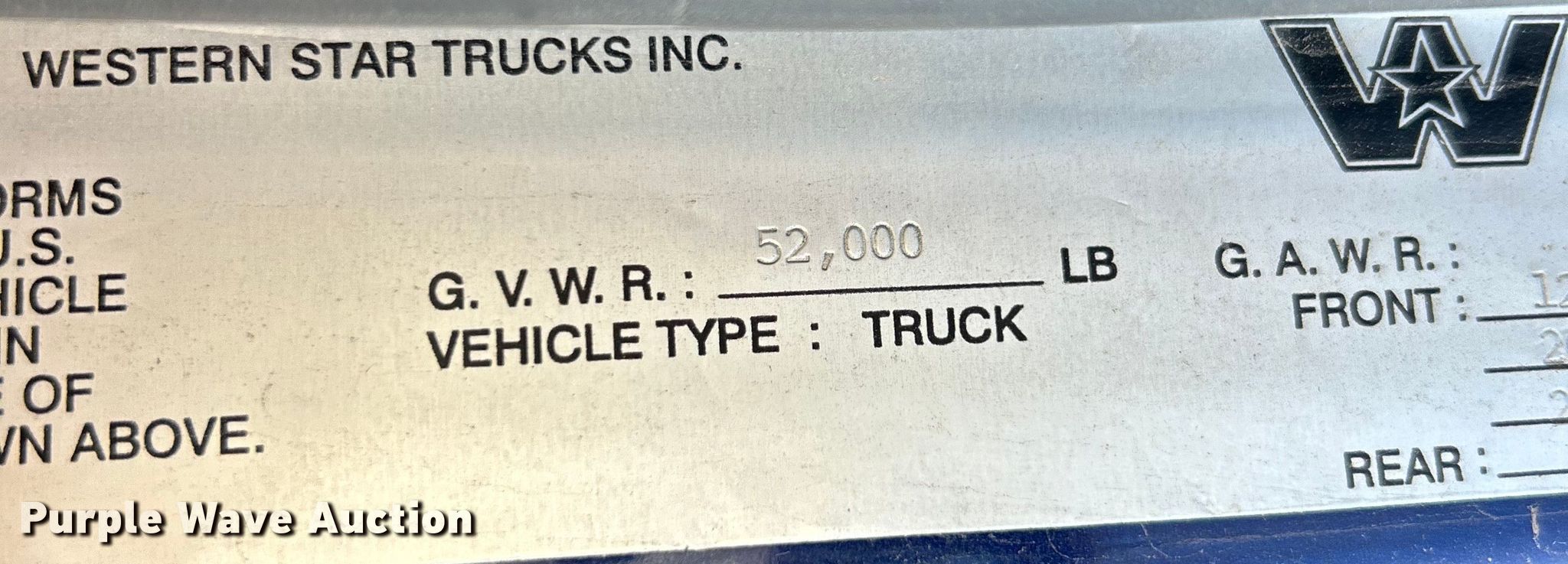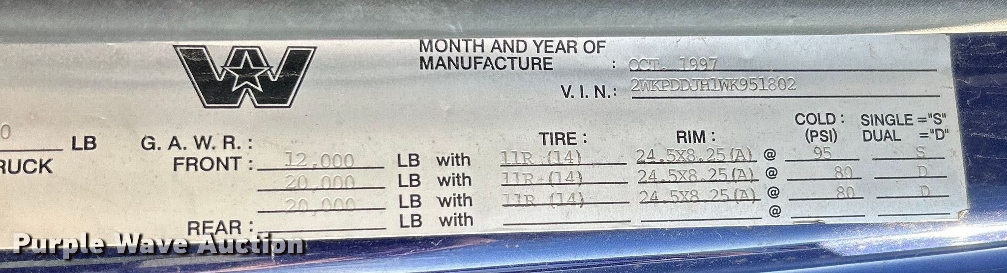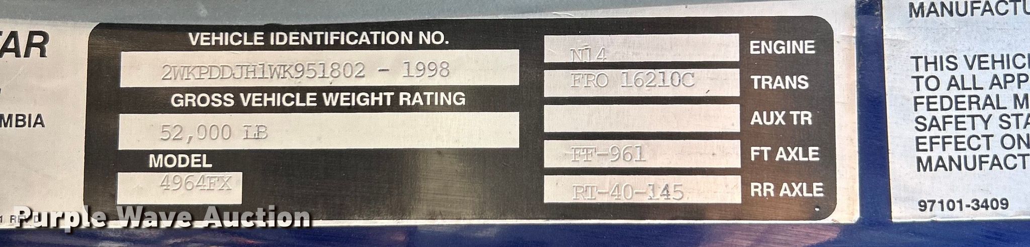 Purple Wave is selling a used Truck Tractor in Missouri. This item is a 1998 Western Star 4964FX semi truck with the following: Miles: 463,519 on odometer, VIN: 2WKPDDJH1WK951802