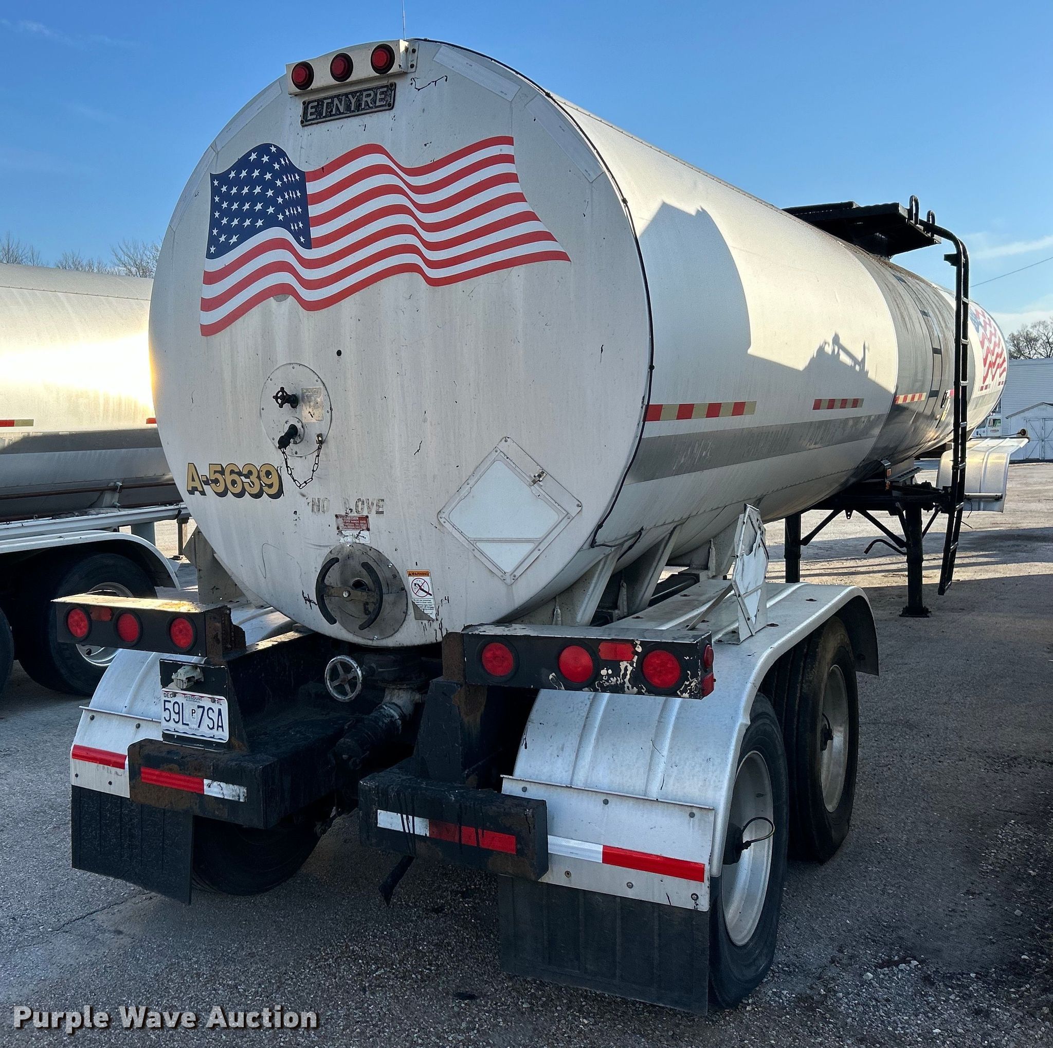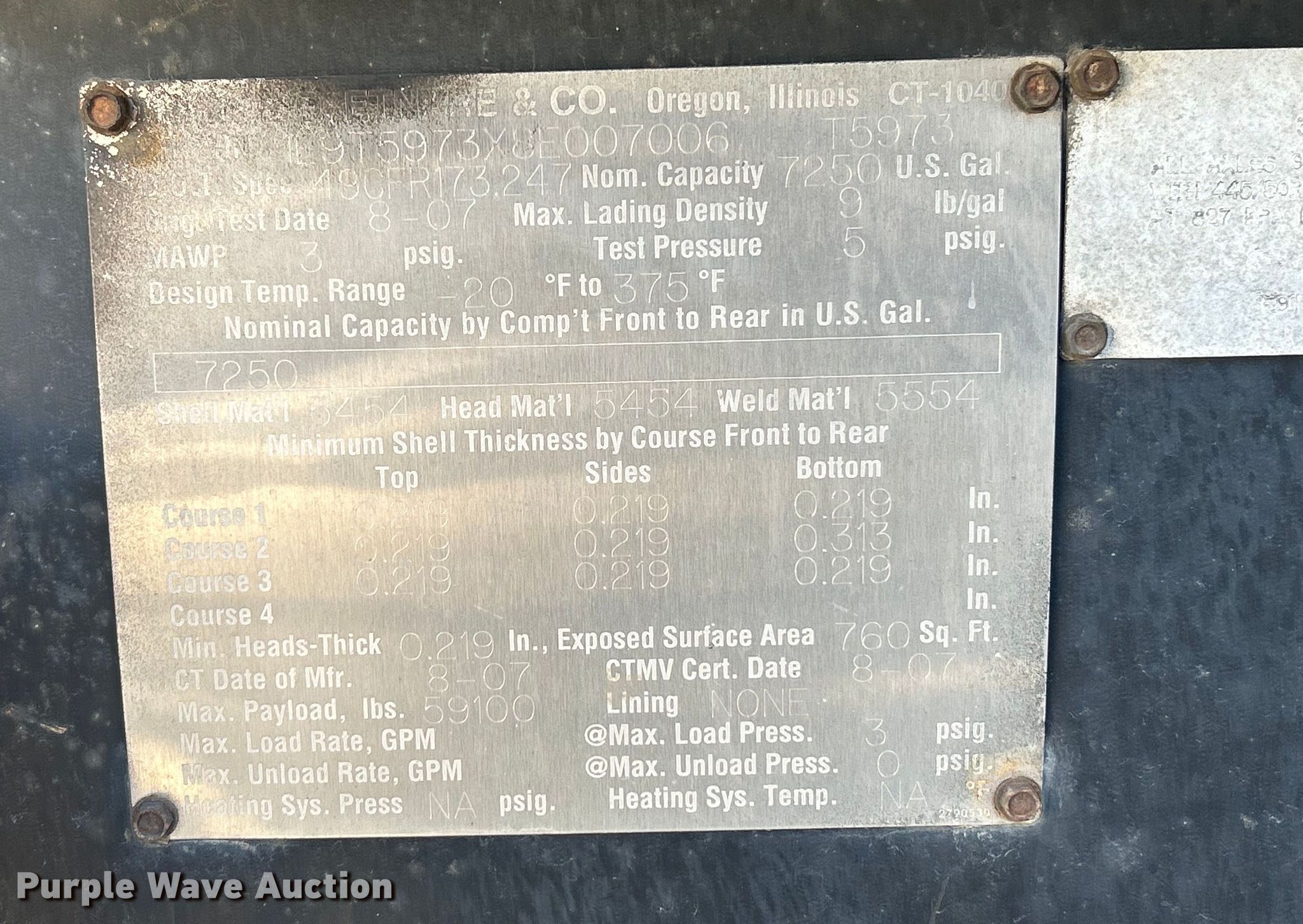 2008 Etnyre T5973 tank trailer. VIN: 1E9T5973X8E007006. Dimensions Overall: 41' L x 96" W. Features Tank type: Aluminum Capacity: 7,250 gallons, No. of manways/manholes: 1 Width: 20", Outlet size: 4.5". Chassis Landing gear: Dual, Suspension: Air, Brakes: Air, Axles: Tandem, GVWR: 68,000 lbs, GAWR: 20,000 lbs. Tires Aluminum wheels, Size: 445/50R22.5. Missouri title. Title distribution may be delayed up to 14 days from verification of funds. Fuel Carriers Inc. Retirement Auction. St. Charles, MO 63301