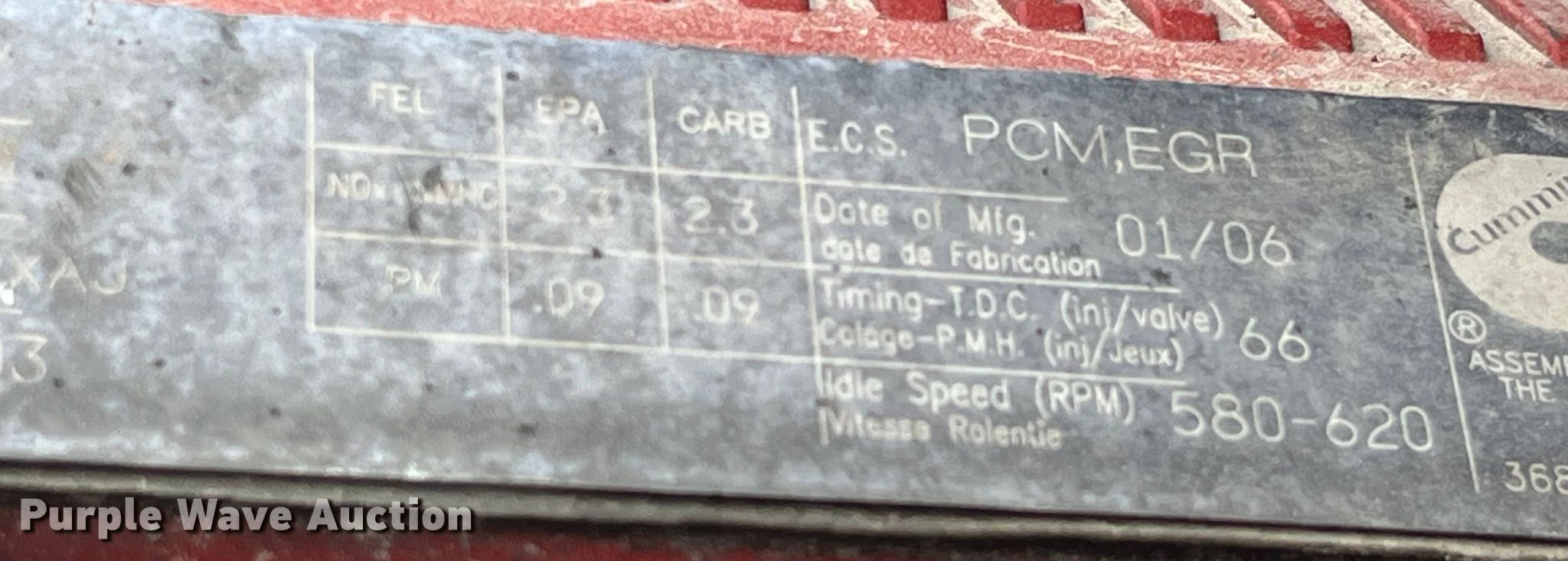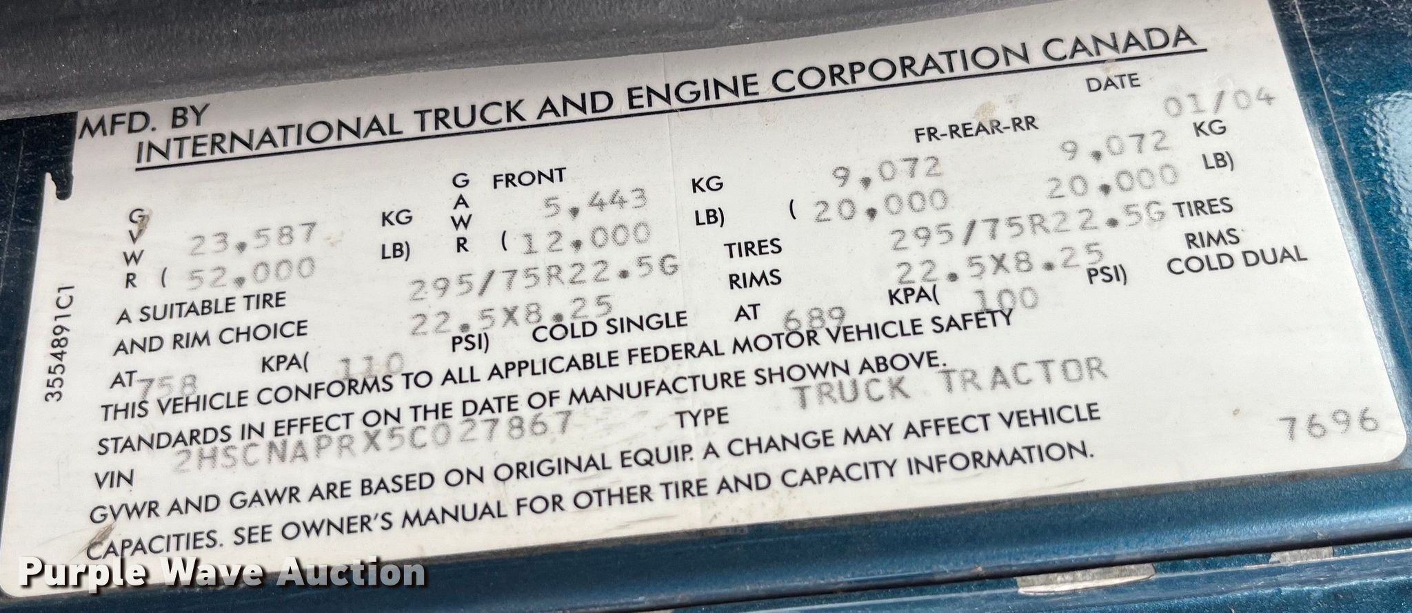 2005 International 9400i semi truck. Miles: Unknown, VIN: 2HSCNAPRX5C027867. Engine Cummins ISX450, Displacement: 15.0L, Cylinders: 6, Fuel type: Diesel, Engine brake. Transmission Eaton Fuller, Manual, Speed: 13. Chassis Axles: Tandem, Differential lock: Inter-axle, Suspension: Air Dump valves, Brakes: Air, GVWR: 52,000 lbs FAWR: 12,000 lbs, IAWR: 20,000 lbs, RAWR: 20,000 lbs, Wheelbase: 222". Interior AC, heat, Heated mirrors, Power windows, power locks, Cruise control, Air ride cab, Sleeper Sleeper length: 48", Beds: Single, Rear climate control. Features Deck plate: Aluminum, Fifth wheel type: Air operated, sliding, Fuel tank: Dual. Tires Front: 11R22.5, Rear: 445/50R22.5. Notes Windshield chipped or cracked, Parts missing and damaged, Unit must be towed or hauled, Non-operational unit. Illinois title. Mileage has not been verified. Odometer discrepancy will be marked on the title. Title has a lien that will be released following the close of the auction. Title distribution may be delayed up to 30 days from verification of funds. Zac Pruett Inc.. 27957 380th Street. New Salem, IL 62357