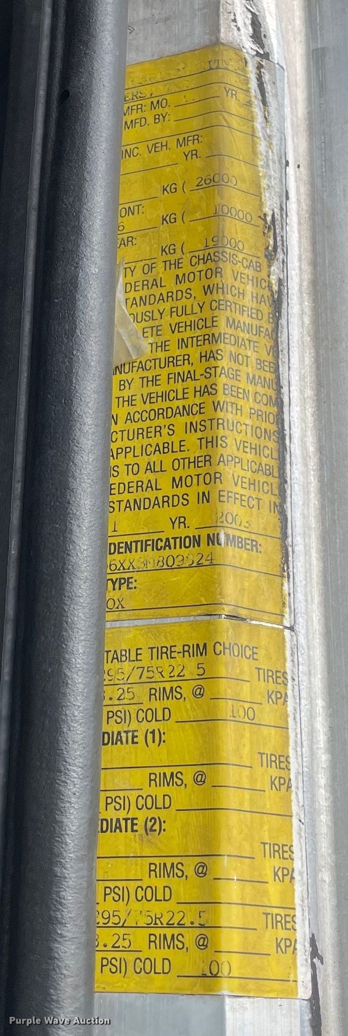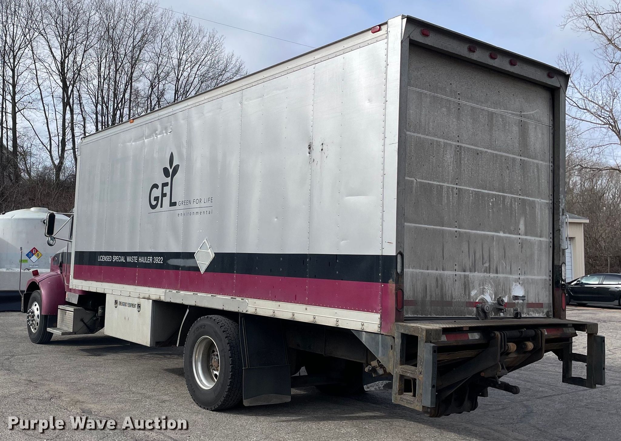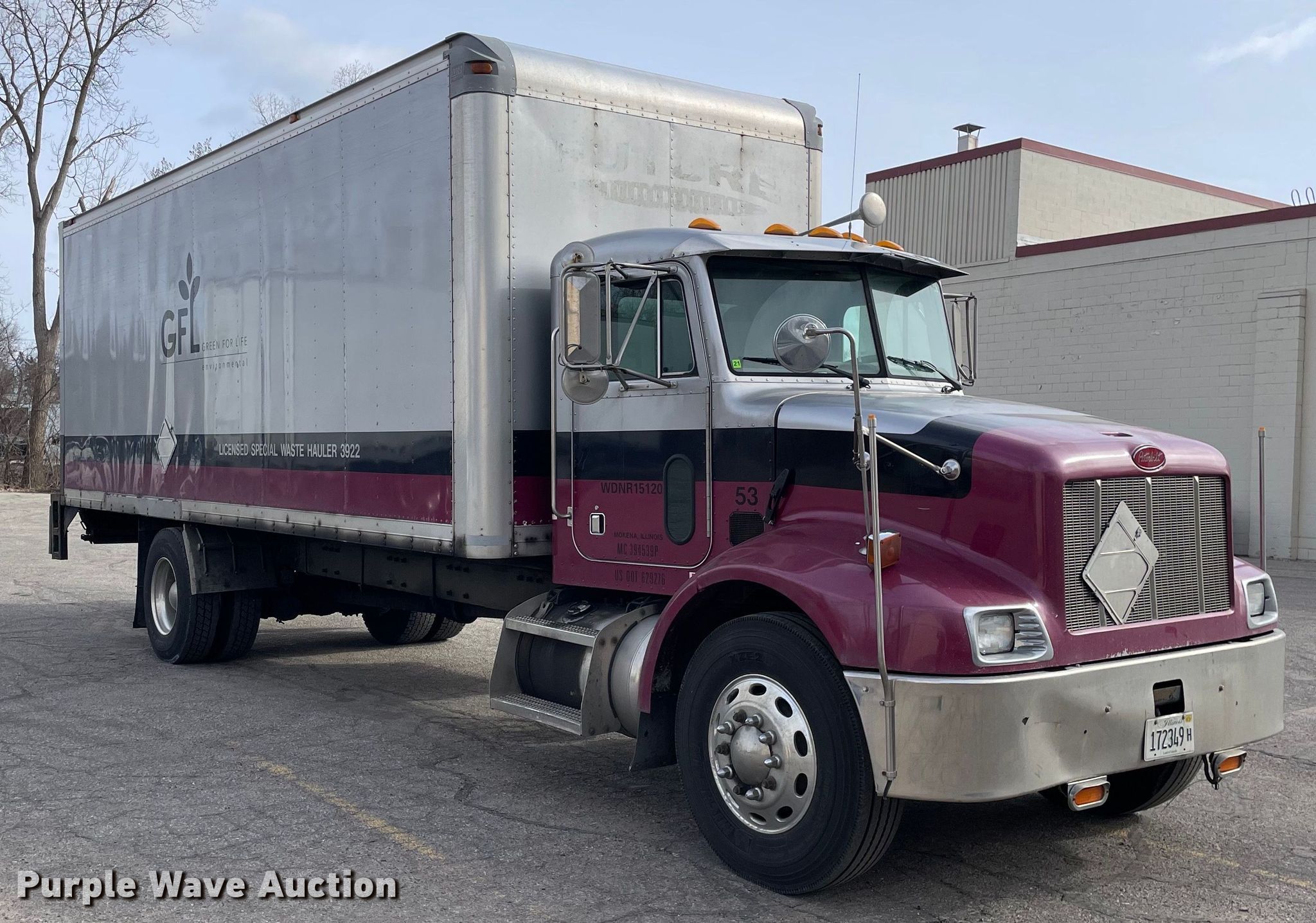 2003 Peterbilt 330 box truck. Miles: 684,029 on odometer, VIN: 2NPNHD6XX3M809824, Unit #: 1853. Engine Caterpillar 3126E, Displacement: 7.2L, Cylinders: 6, Fuel type: Diesel. Transmission Eaton Fuller Synchro 6, Manual, Speed: 6. Chassis Axles: Single, Suspension: Air, Brakes: Air, GVWR: 26,000 lbs. Interior AC, heat, Heated mirrors, Cruise control. Features Box bed Morgan GVSD09724FT, Serial: 1WI03VB28301001, 24' L x 96" W x 96" H, Floor: Wood, End gate lift Maxon 264346.. Tires Size: 11R22.5. Notes Engine recently repaired, Injectors need replaced, Non-operational tachometer. View repairs. Illinois title. GFL Environmental Inc. Grand Rapids, MI 49505