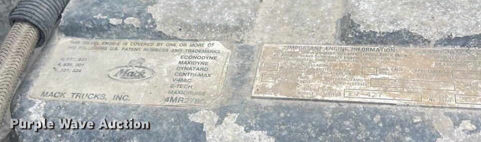 2003 Mack CH613 semi truck. Miles: 532,518 on odometer, Hours: 24,701 on meter, VIN: 1M1AA18Y23W152932. Engine Mack, Displacement: 12.0L, Cylinders: 6, Fuel type: Diesel. Transmission Eaton Fuller, Manual, Speed: 13. Chassis Axles: Tandem, Differential lock: Inter-axle, Suspension: Air Dump valves, Brakes: Air, PTO. Interior AC, Heat, Heated mirrors, Cruise control, Air ride cab. Features Deck plate: Steel, Fifth wheel type: Air operated, Sliding, Fuel tank: Dual. Tires Size: 11R24.5. Notes Windshield chipped or cracked. Oklahoma title. Title distribution may be delayed up to 14 days from verification of funds. 15107 North 137th East Avenue. Collinsville, OK 74021