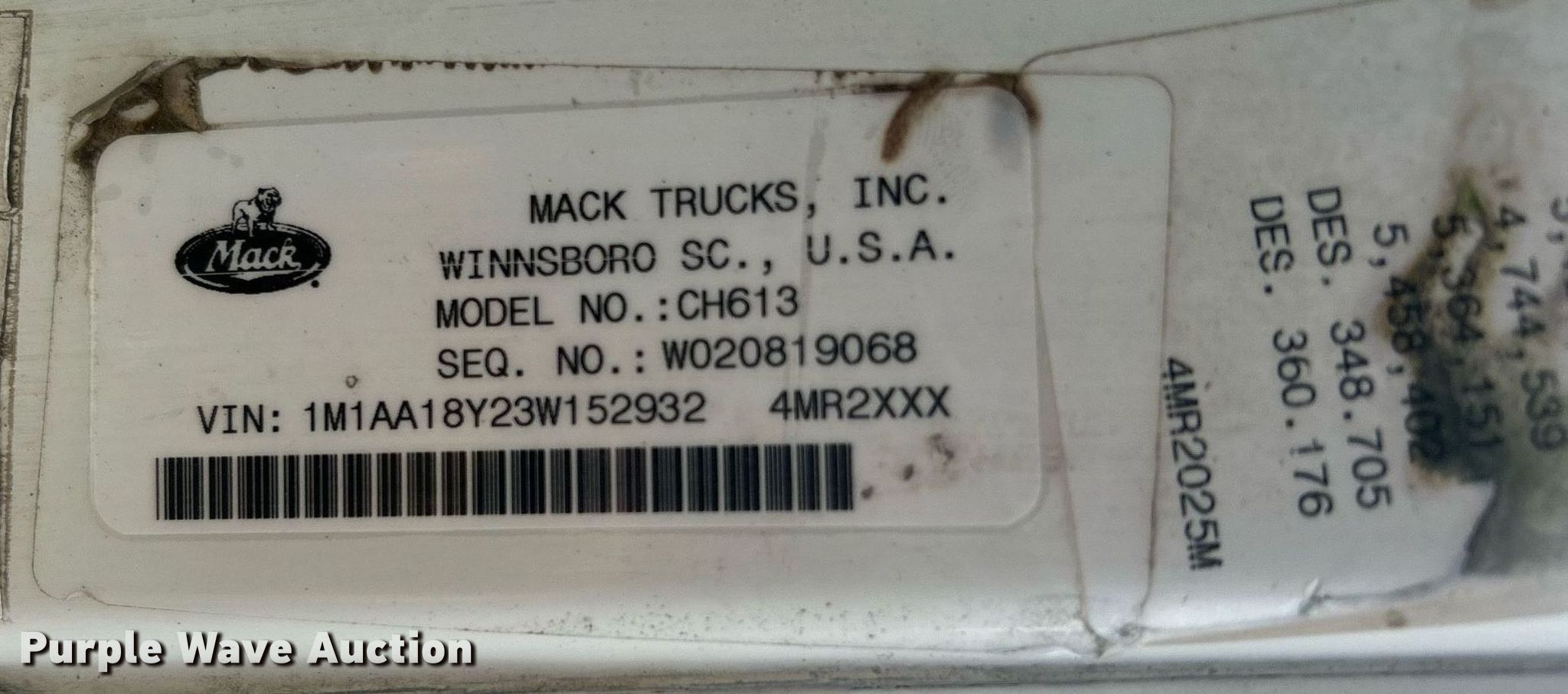 Purple Wave is selling a used Truck Tractor in Oklahoma. This item is a 2003 Mack CH613 semi truck with the following: Miles: 532,518 on odometer, Hours: 24,701 on meter, VIN: 1M1AA18Y23W152932