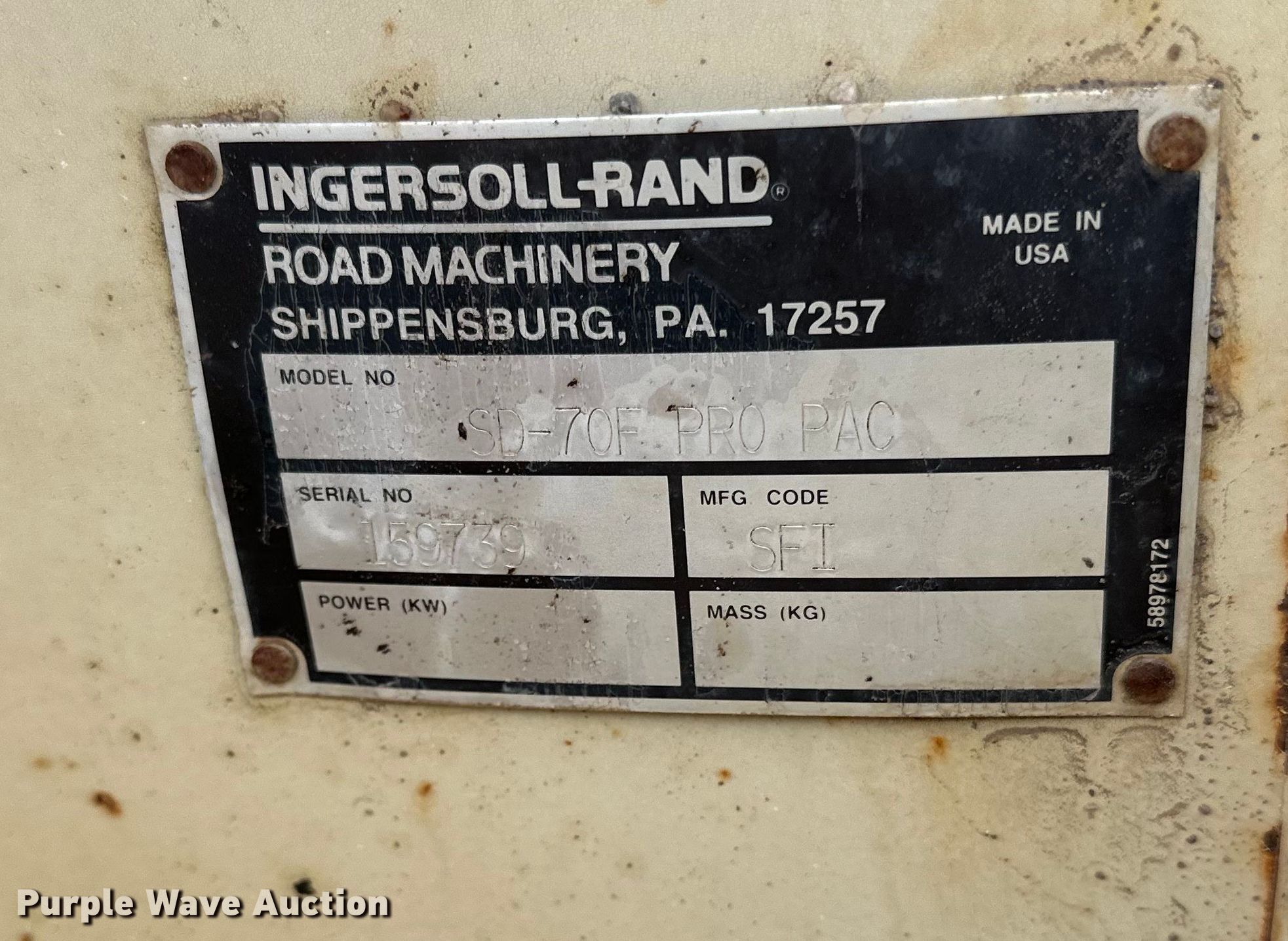 1999 Ingersoll Rand SD-70F Pro Pac single drum vibratory roller. Hours: 7,616 on meter, Serial: 159739. Engine Cummins B3.9C, Serial: 45850733, Displacement: 3.9L, Cylinders: 4, Fuel type: Diesel. Transmission Hydrostatic. Features Drum: Padfoot, Vibratory system: Single, Front drum Width: 65", Diameter: 54", Rear drum, Drum scrapers: Front. Tires Size: 14.9-24. Turner Bros Inc. - Open inspection April 13 and April 18. 12540 Nevada Ave S. Savage, MN 55378