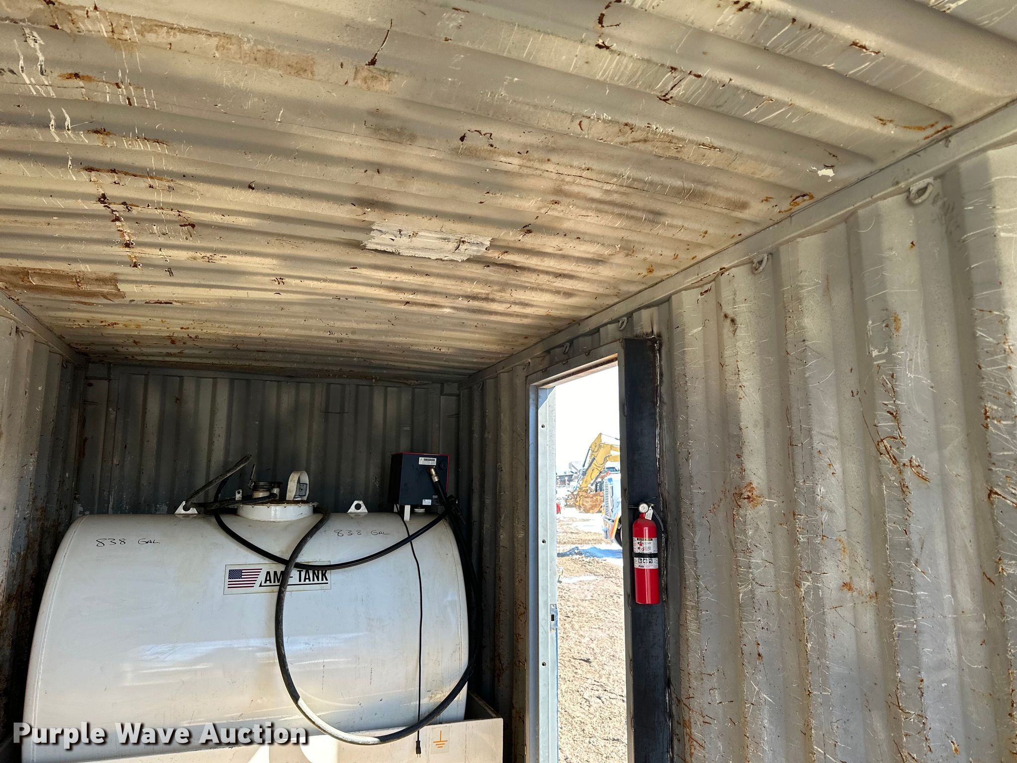 Shipping container with fuel tank. Fuel tank AM Tank, Capacity: 838 gal, Piusi Cube 56 pump Volts: 120. Notes Previously used as job storage. Turner Bros Inc. - Open inspection April 13 and April 18. 12540 Nevada Ave S. Savage, MN 55378