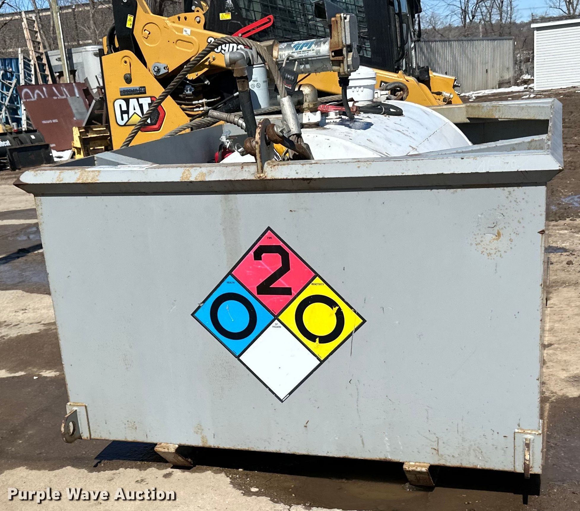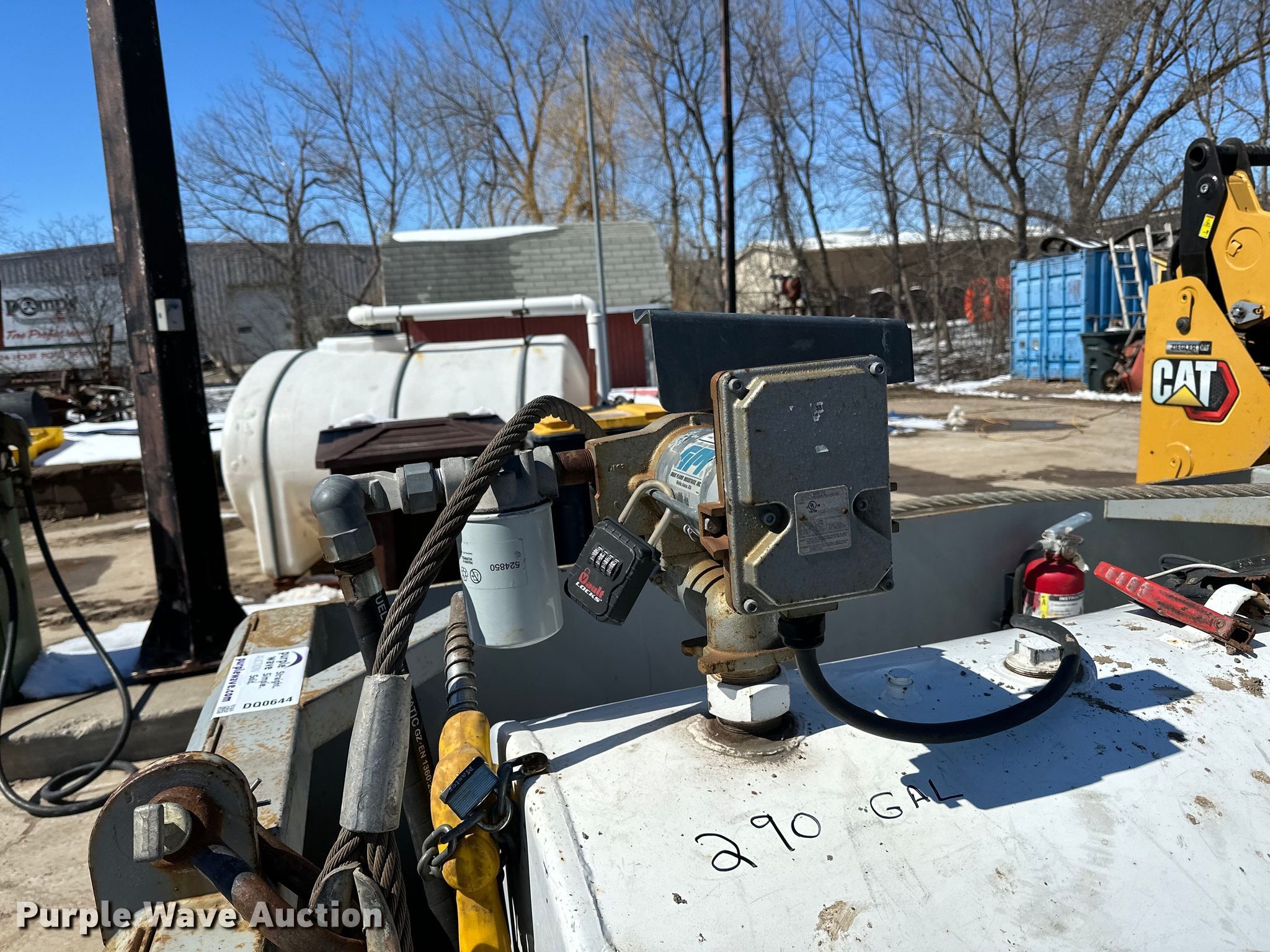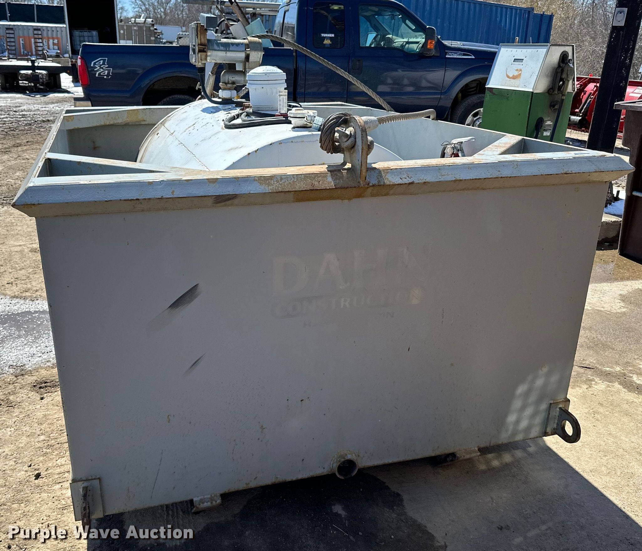 Fuel tank. Dimensions: 7' 3" L X 5' 4" W X 4' 8" H, Fuel type: Diesel, GPI pump Volts: 12, Secondary containment. Turner Bros Inc. - Open inspection April 13 and April 18. 12540 Nevada Ave S. Savage, MN 55378