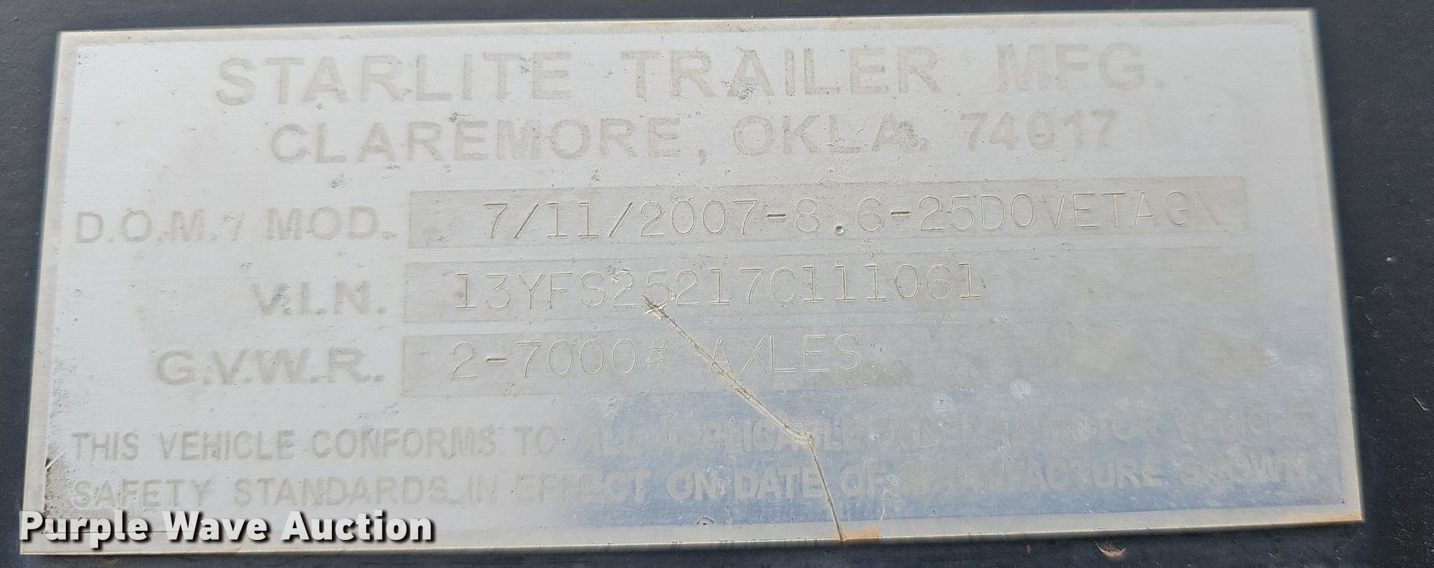 Purple Wave is selling a used Equip. Trailer in Kansas. This item is a 2007 Starlite 8625D0VETAGN equipment trailer with the following: VIN: 13YFS25217C111061, Unit #: 103