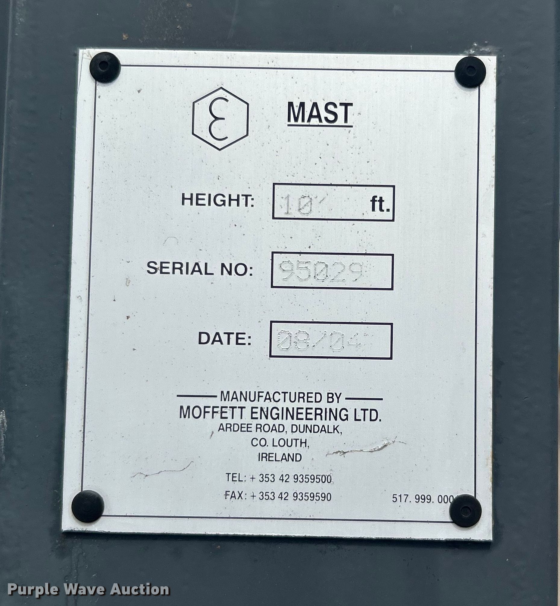 2004 Moffett M5500 forklift. Hours: 2,330 on meter, Serial: D220527. Engine Kubota V2203-ES, Displacement: 2.2L, Cylinders: 4, Fuel type: Diesel. Transmission Hydrostatic. Chassis Differential lock. Operators station Canopy. Features Maximum lift capacity: 5,500 lbs, Maximum lift height: 120", Mast stages: 2, Side shift, Mast tilt, Fork length: 45". Tires Size: 31x15.5-15 NHS. 15107 North 137th East Avenue. Collinsville, OK 74021