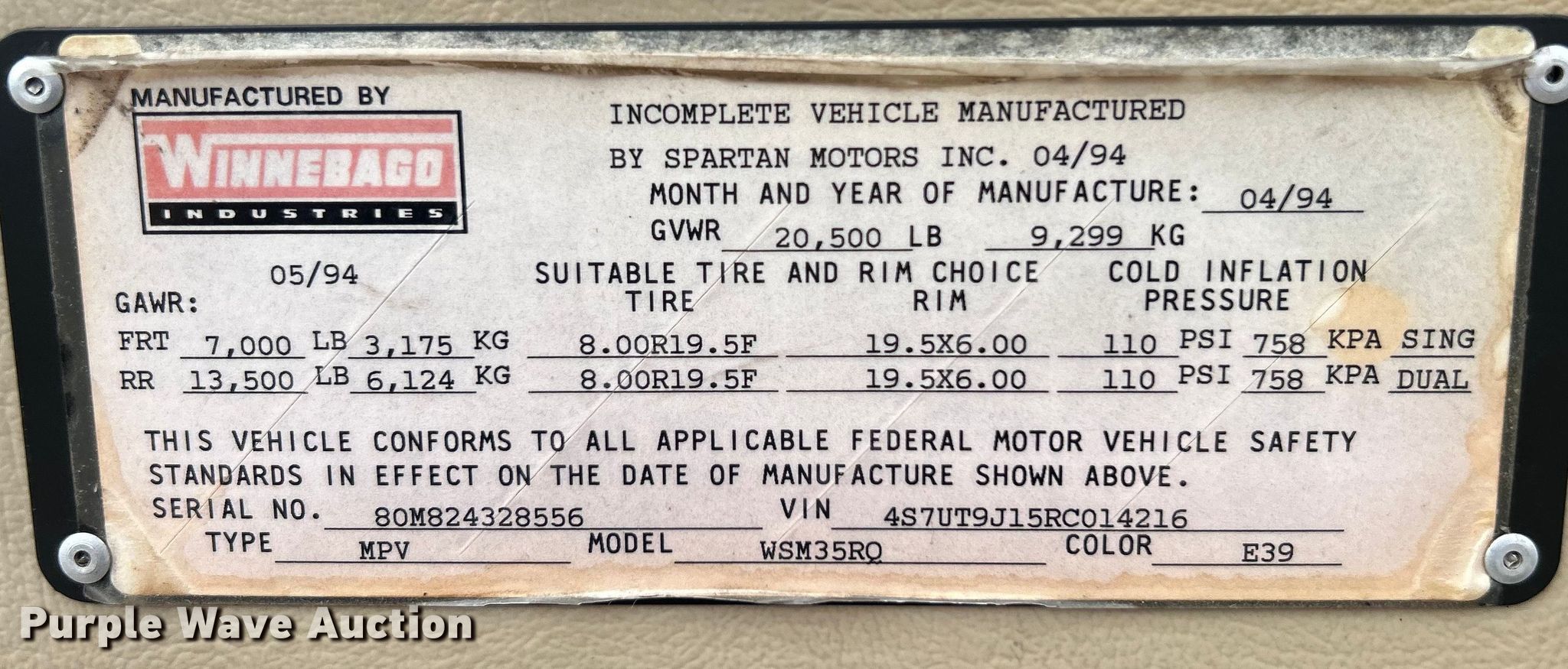Purple Wave is selling a used RV or Camper in Oklahoma. This item is a 1994 Winnebago Vectra RV with the following: Miles: 96,172 on odometer, Camper length: 35', VIN: 4S7UT9J15RC014216