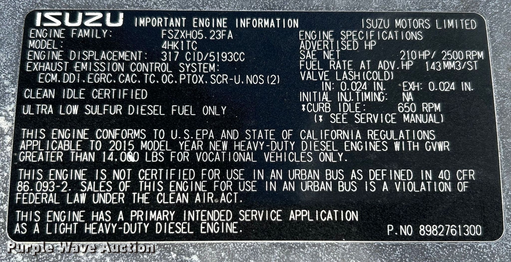 2016 Isuzu NPR box truck. Miles: 301,863 on odometer, VIN: JALE5W163G7300077. Engine Isuzu 4HK1TC, Displacement: 317 C.I.D., Cylinders: 4, Fuel type: Diesel, HP: 210. Transmission Automatic. Chassis Axles: Single, Suspension: Spring, Brakes: Hydraulic, GVWR: 19,500 lbs. Interior AC, Heat, Heated mirrors, Power windows, Power locks, Cruise control, Backup camera. Features Box bed US Truck Body, Serial: 1506-04343-1, 18' L x 102" W x 102" H, Floor: Wood, End gate lift Capacity: 2,500 lbs.. Tires Size: 225/70R19.5. Notes Dash warning indicator: Check engine, Windshield chipped or cracked. Oklahoma title. Title distribution may be delayed up to 14 days from verification of funds. 15107 North 137th East Avenue. Collinsville, OK 74021