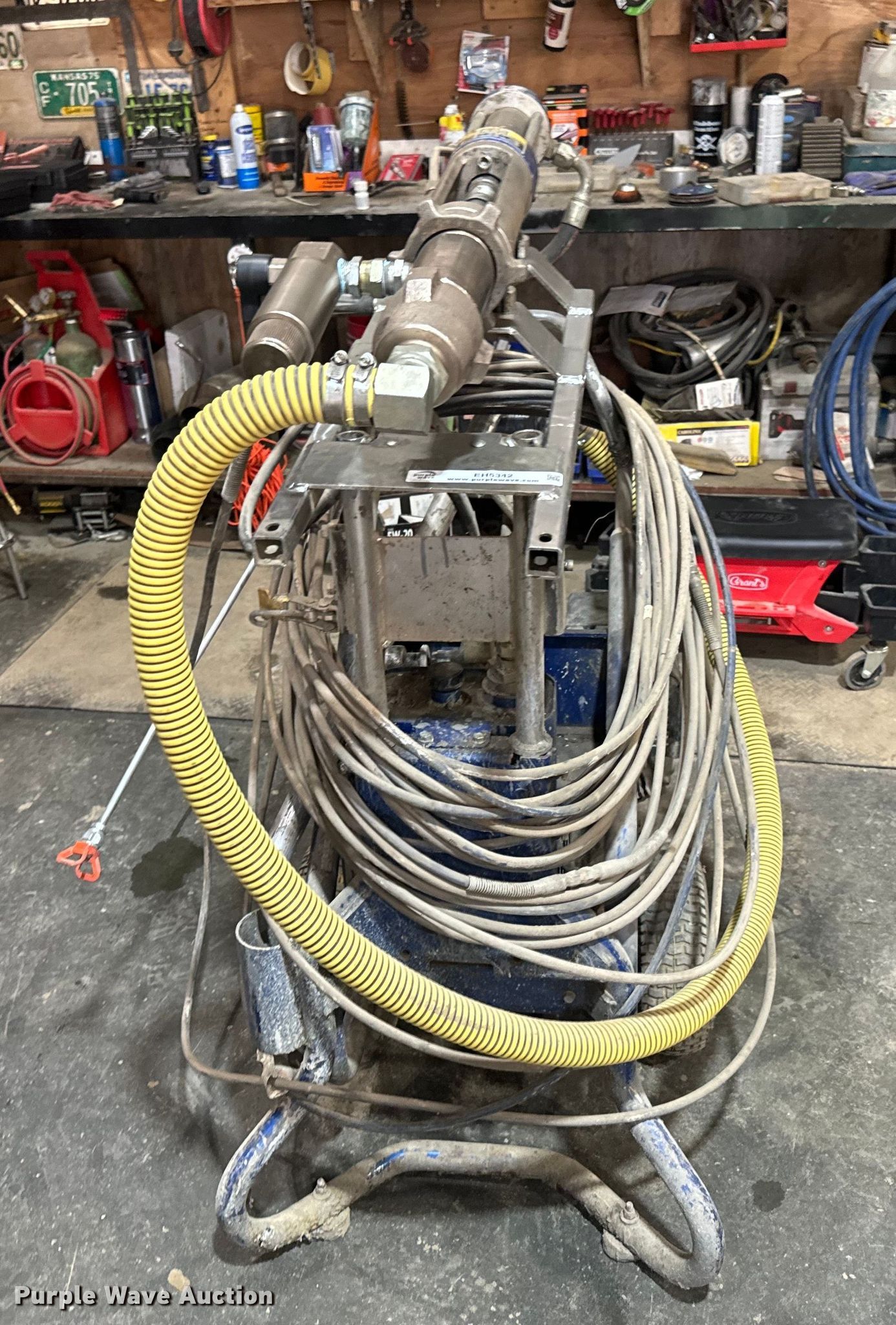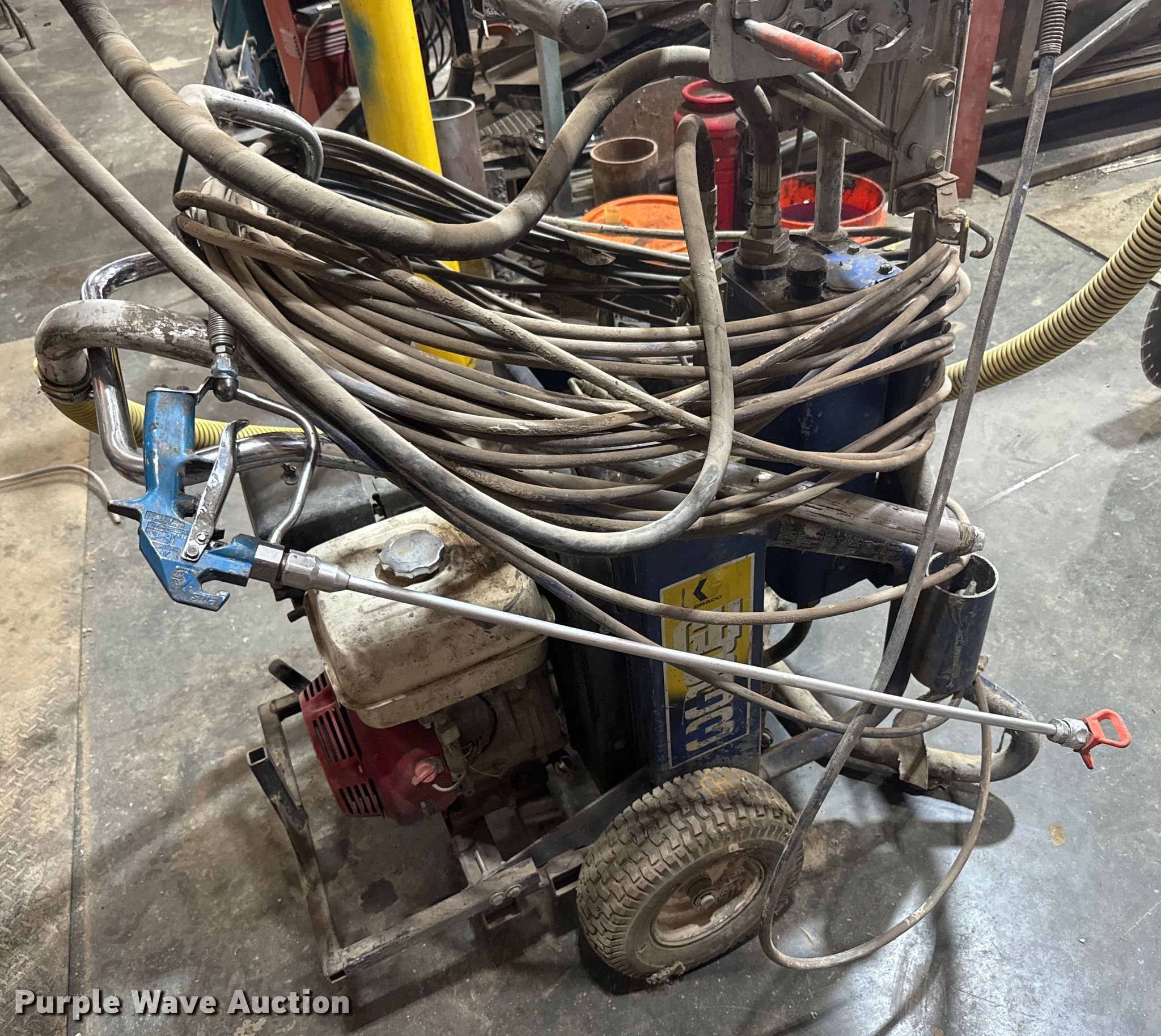 Purple Wave is selling a used Tools in Kansas. This item is a Graco GH833 gas hydraulic sprayer with the following: Honda engine, Cylinders: 1, 1.5" suction hose, Hydraulic reservoir capacity: 4 gallons, High pressure hose, Length: 50'