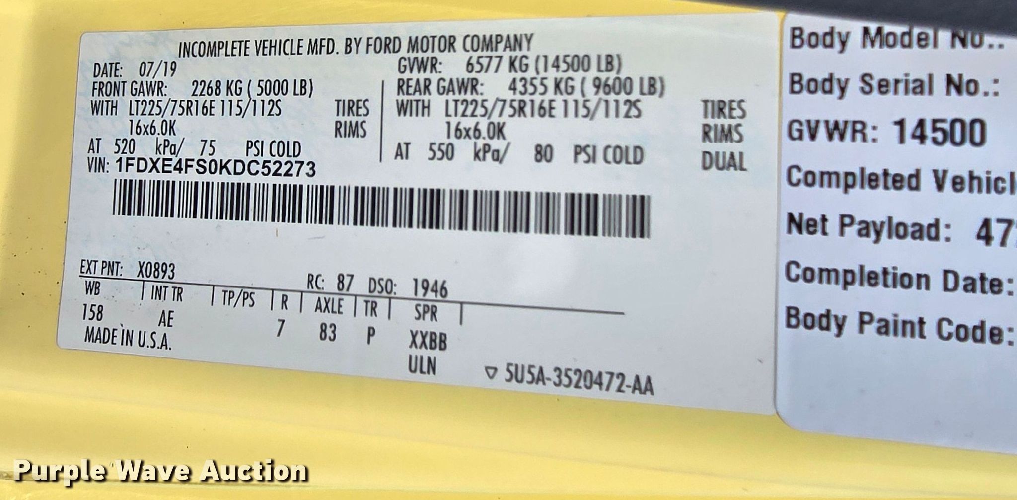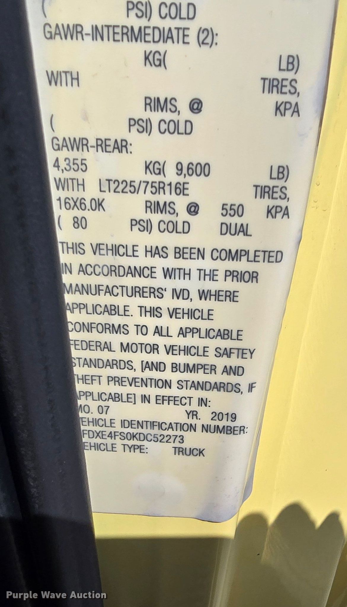 2019 Ford E450 refrigerated truck. Miles: 137,234 on odometer, VIN: 1FDXE4FS0KDC52273. Engine Displacement: 6.8L, Cylinders: 10, Fuel type: LPG. Transmission Automatic. Chassis Axles: Single, Suspension: Spring, Brakes: Hydraulic, GVWR: 14,500 lbs, Wheelbase: 158". Interior AC, Heat, Power windows, Power locks. Features Box bed Knapheide Cold Car, Serial: 48165, Floor: Aluminum, Refrigeration unit, Backup camera. Tires Size: LT225/75R16. Oklahoma title. Title distribution may be delayed up to 30 days from verification of funds. Collinsville, OK 74021