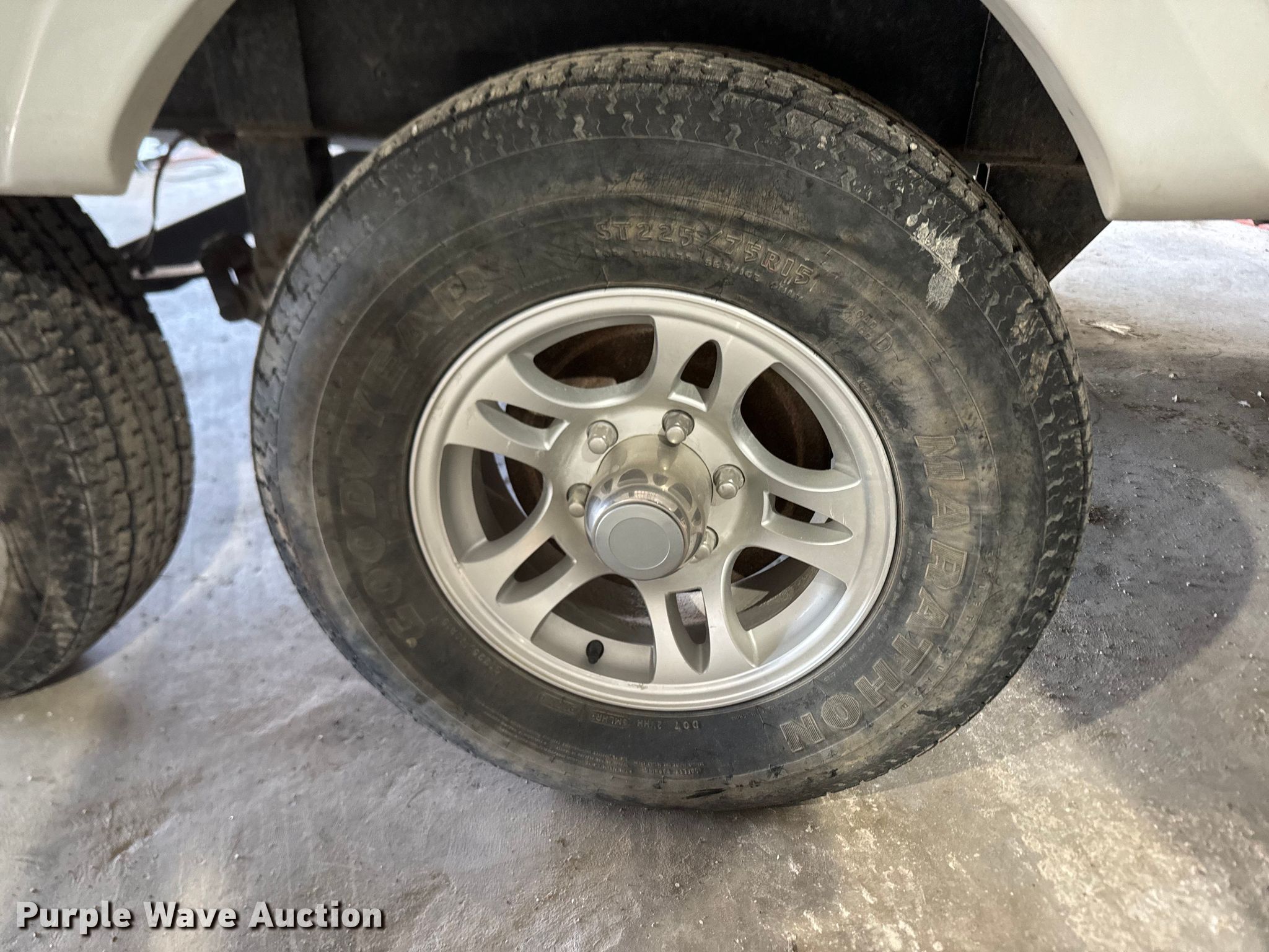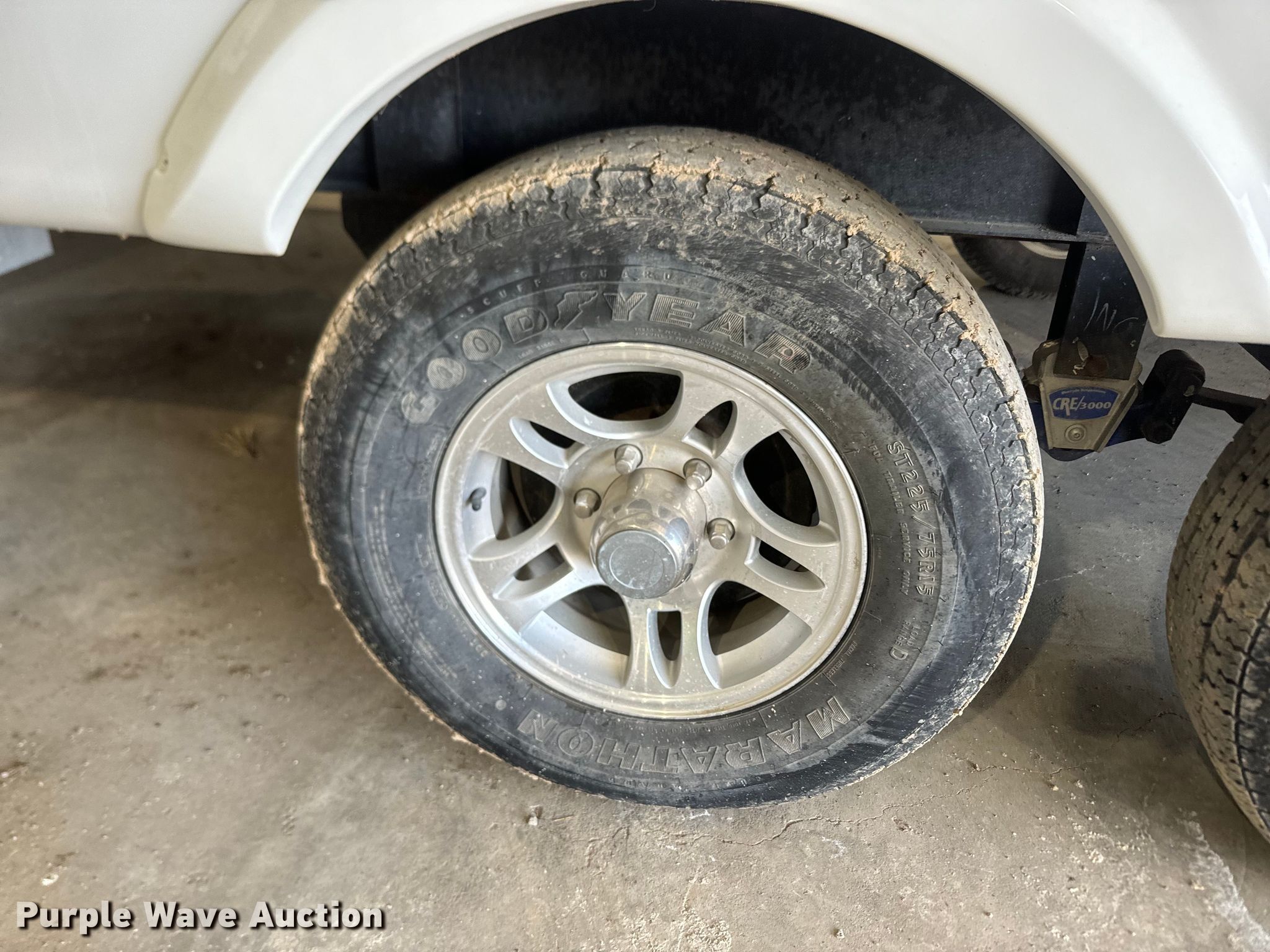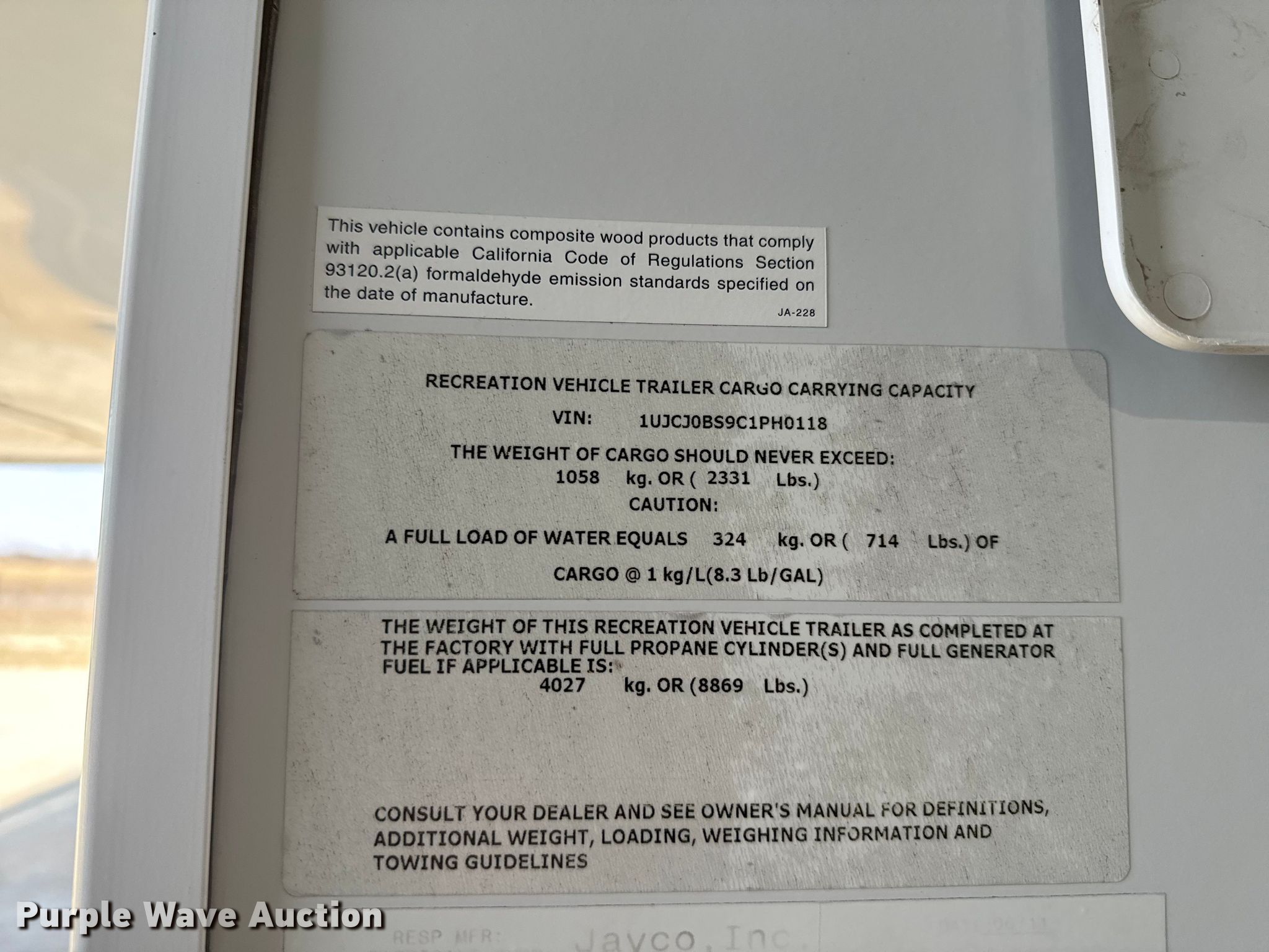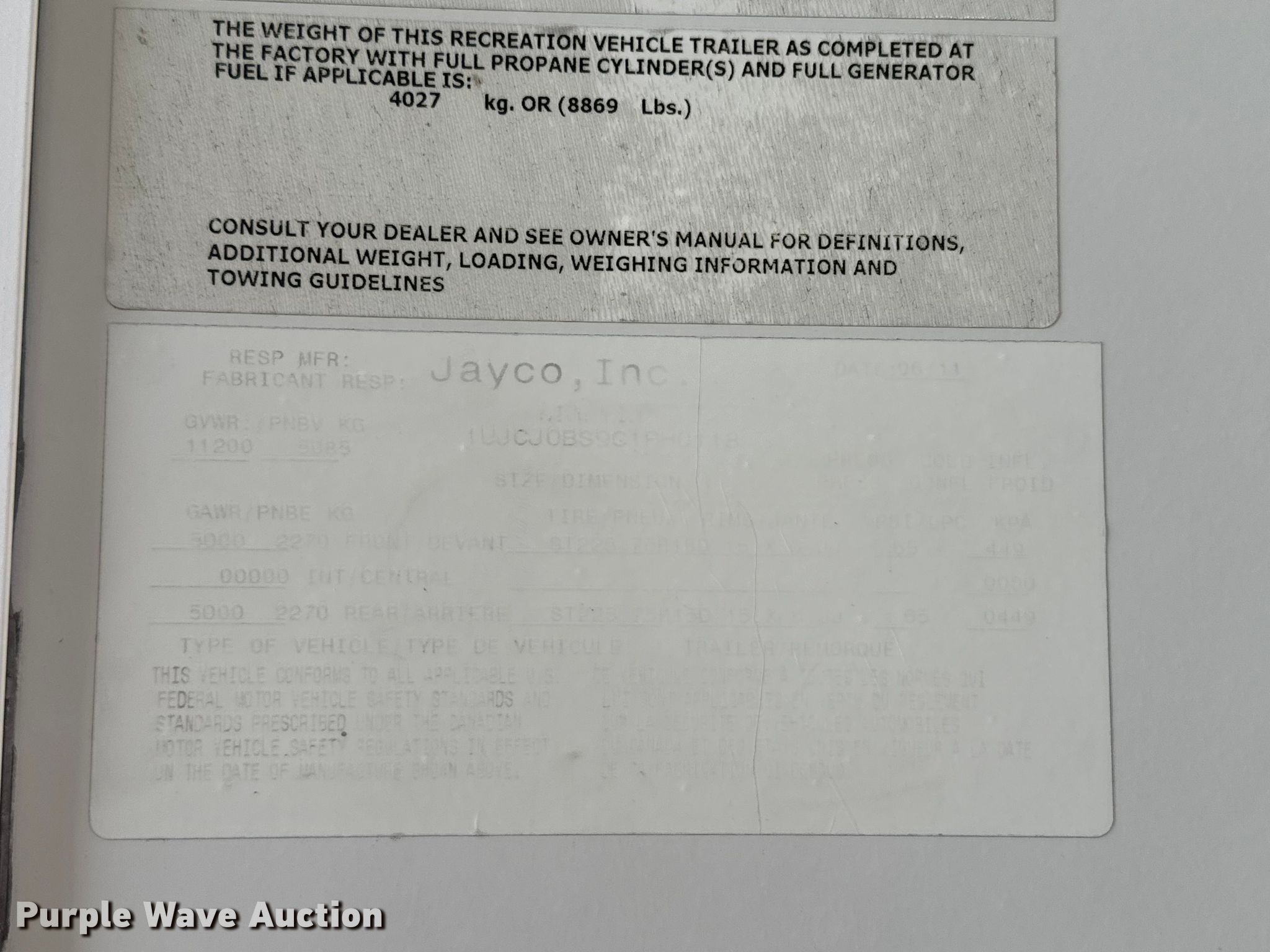 2012 Jayco Eagle camper. Camper length: 32', VIN: 1UJCJ0BS9C1PH0118. Chassis Axles: Tandem, Suspension: Spring, Brakes: Electric, GVWR: 11,200 lbs, GAWR: 5,000 lbs. Interior Kitchen: Sink, Refrigerator, Freezer, Microwave, Oven, Stove: Propane, Living room: Table, Couch, Bathroom, Beds: 5 Bed type: Queen, TVs: 1, Heater, AC units: 1. Features Slide outs: 2, Awnings: 1 Awning type: Electric, Hitch included. Tires Size: 225/75R15. Notes Dead battery. Kansas title. Versa Air Services. 301 West 205th Street. Scranton, KS 66537