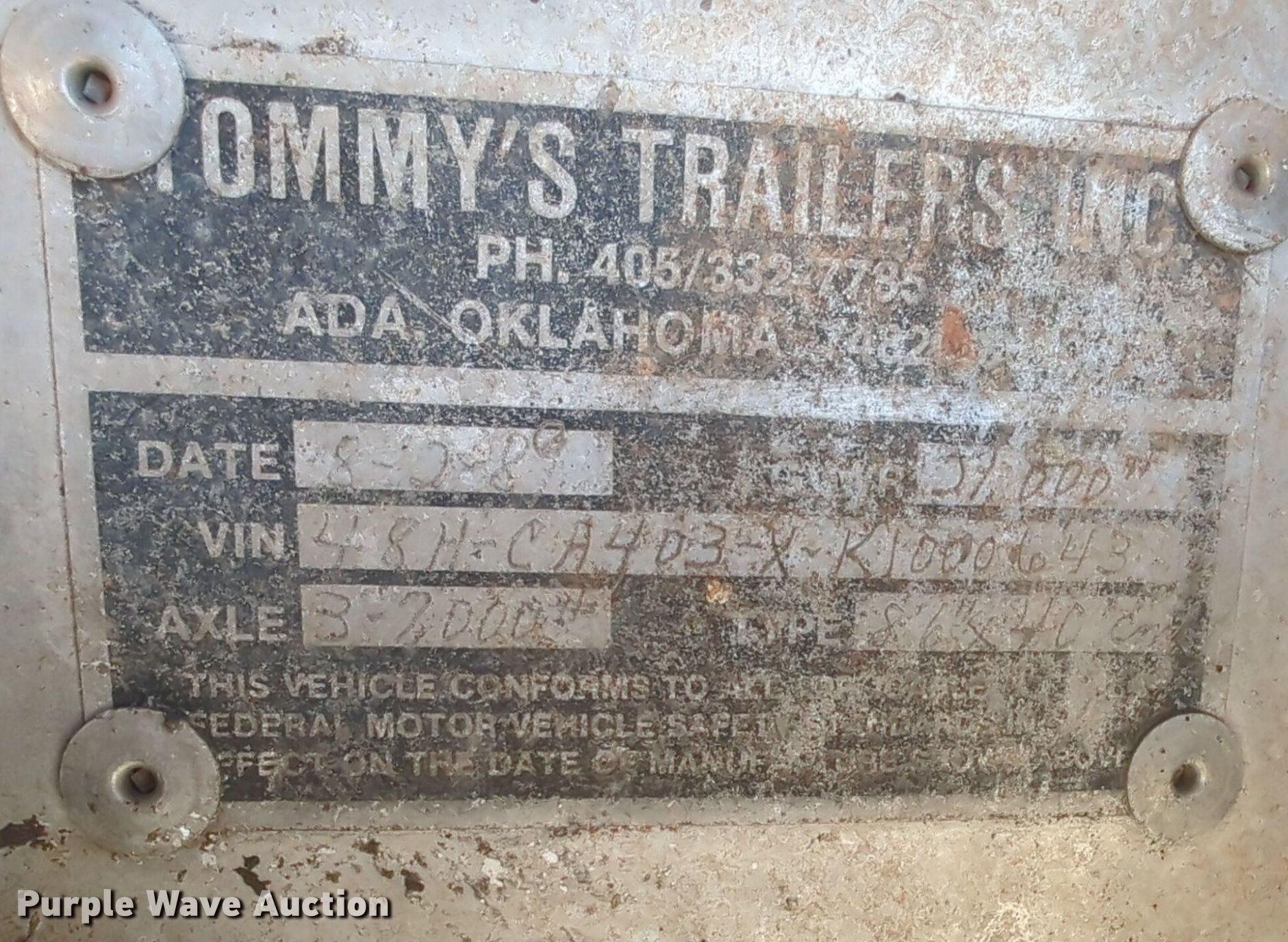 Purple Wave is selling a used Car Carrier in Oklahoma. This item is a 1989 Shop built enclosed car carrier with the following: VIN: 48HCA403XK1000643