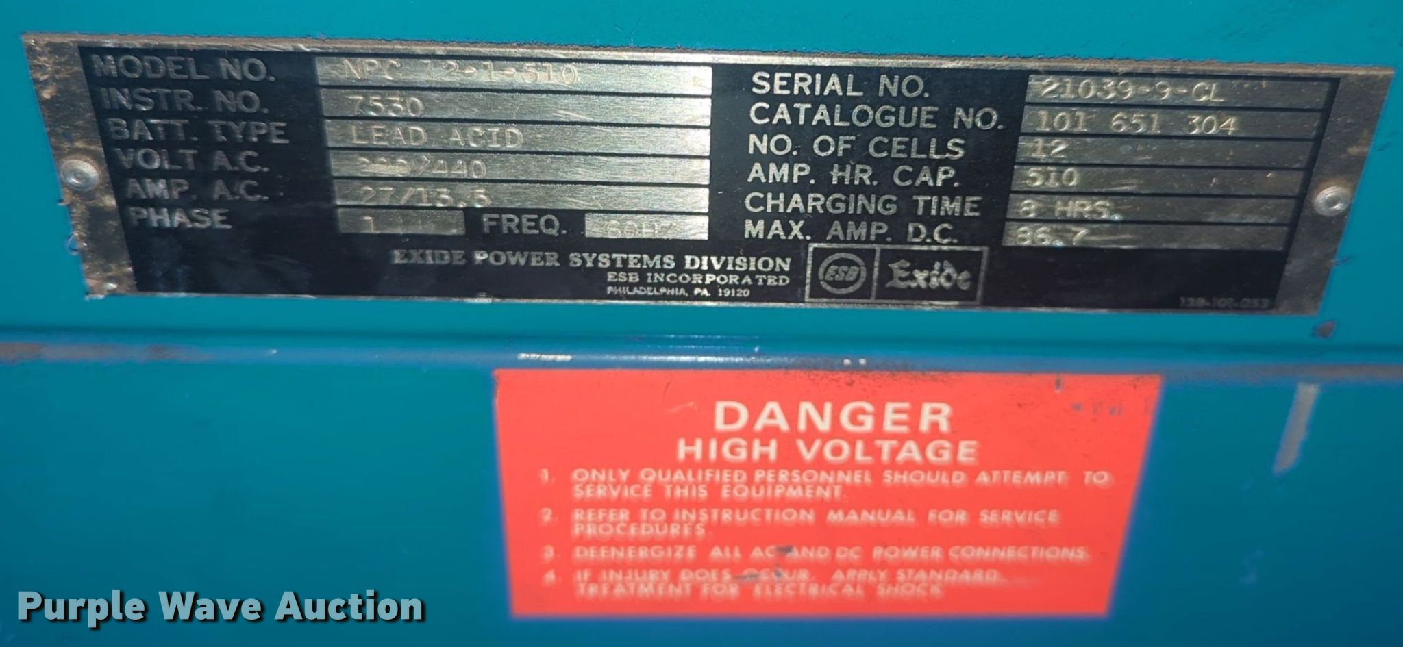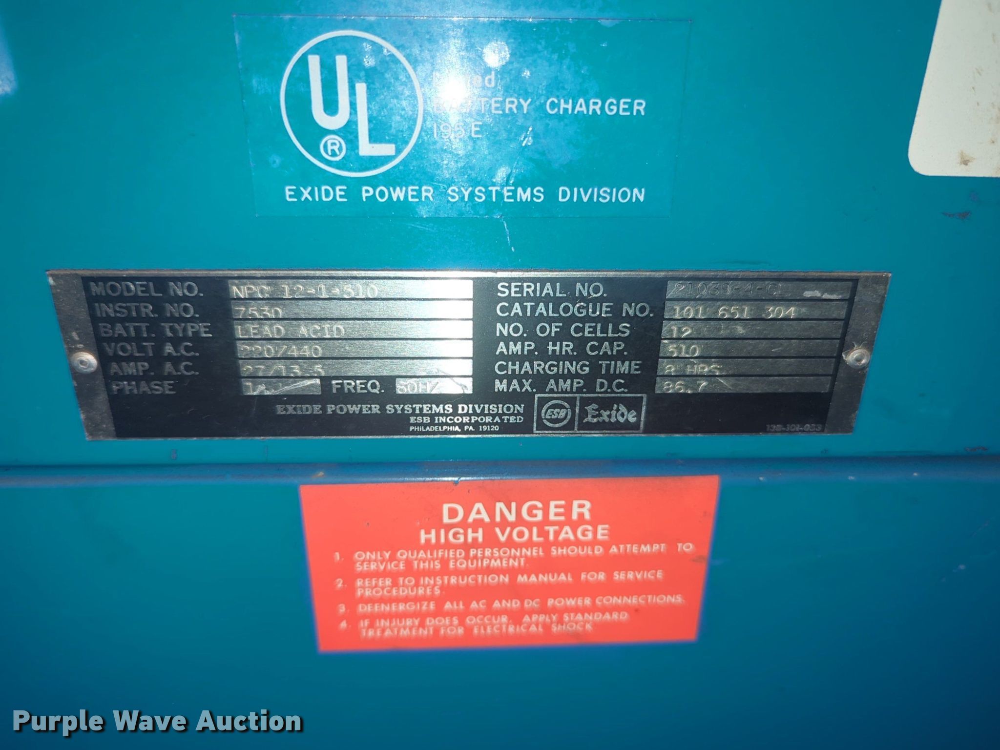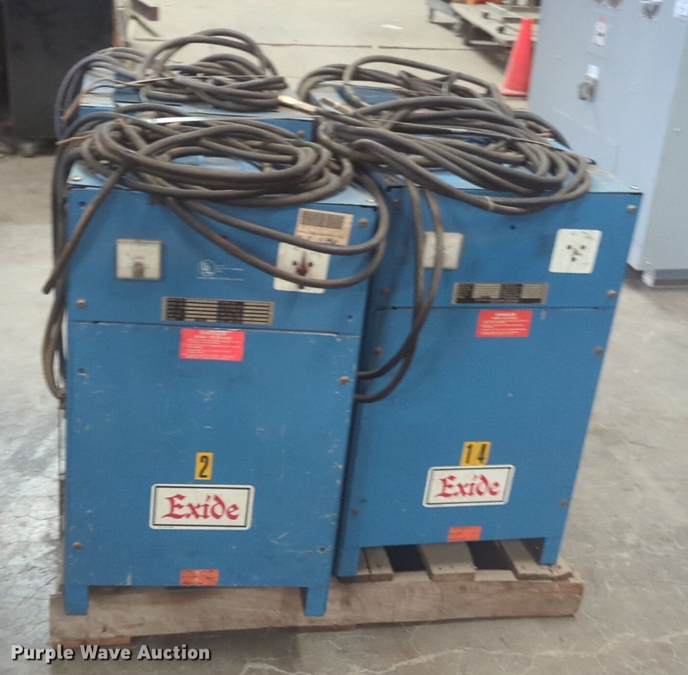 Purple Wave is selling a used Forklift Attach. in Oklahoma. This item is a (4) Exide forklift chargers with the following: Volts: 220/440