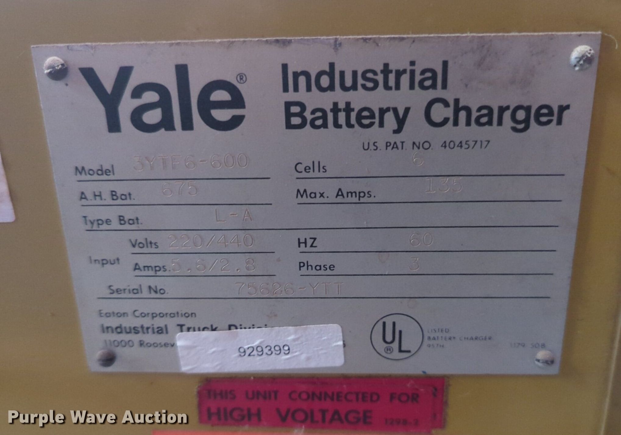 Purple Wave is selling a used Forklift Attach. in Oklahoma. This item is a (4) forklift chargers with the following: Hertner, Volts: 220, Phase: Single, C&D, Volts: 208/240/480, Phase: Single, Hobart, Volts: 208/240/480, Phase: Single, Yale, Volts: 240/480, Phase: Three