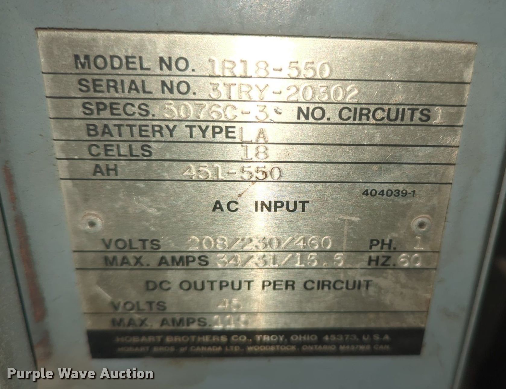 (2) forklift chargers. Hobart Volts: 208/230/460, Phase: Single. ARS America, Inc.. 200 NE 48th St. Oklahoma City, OK 73105