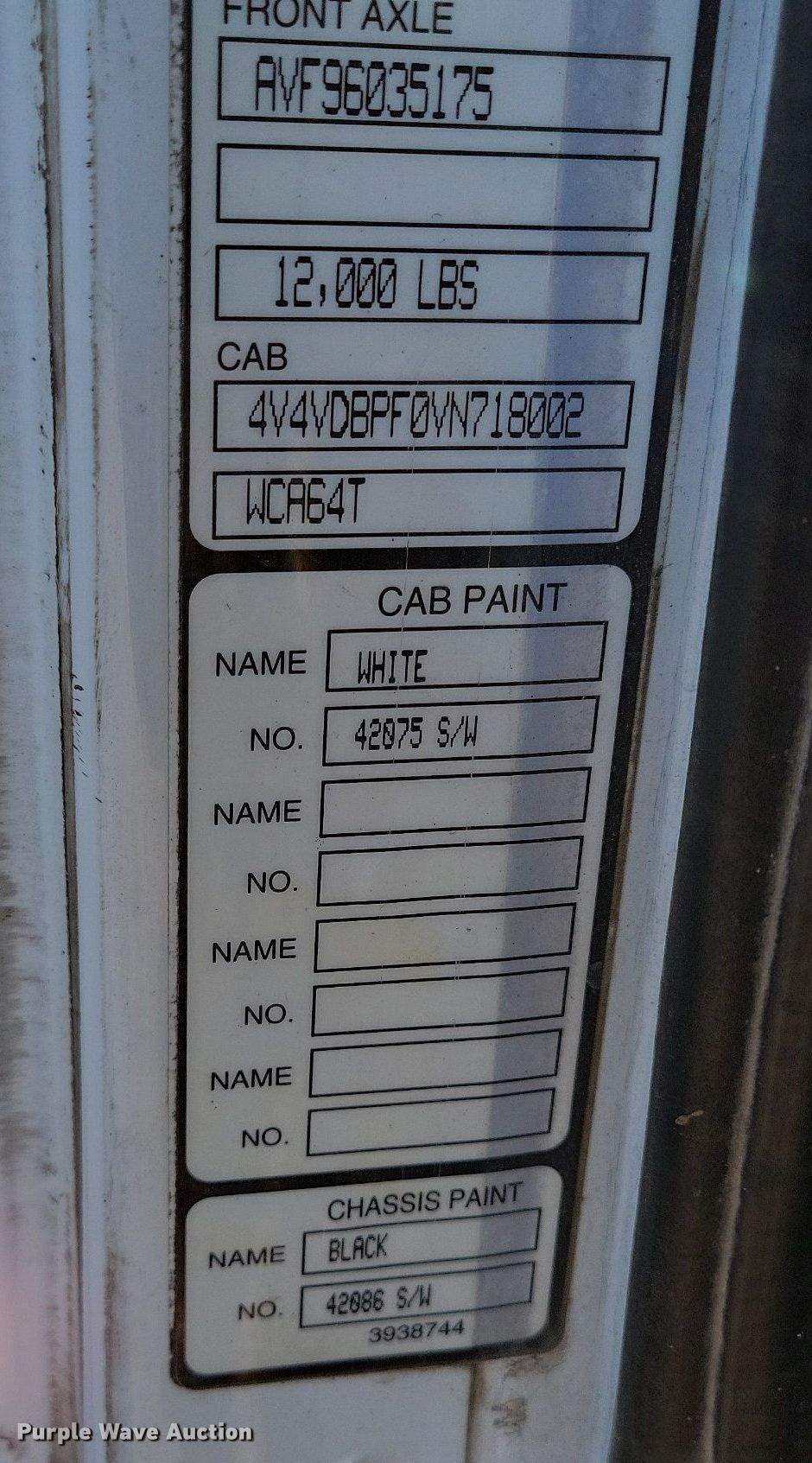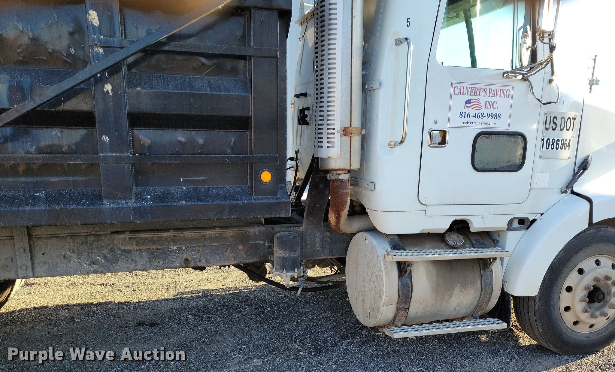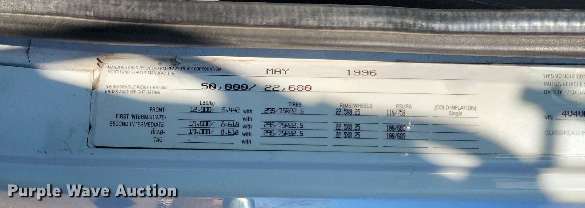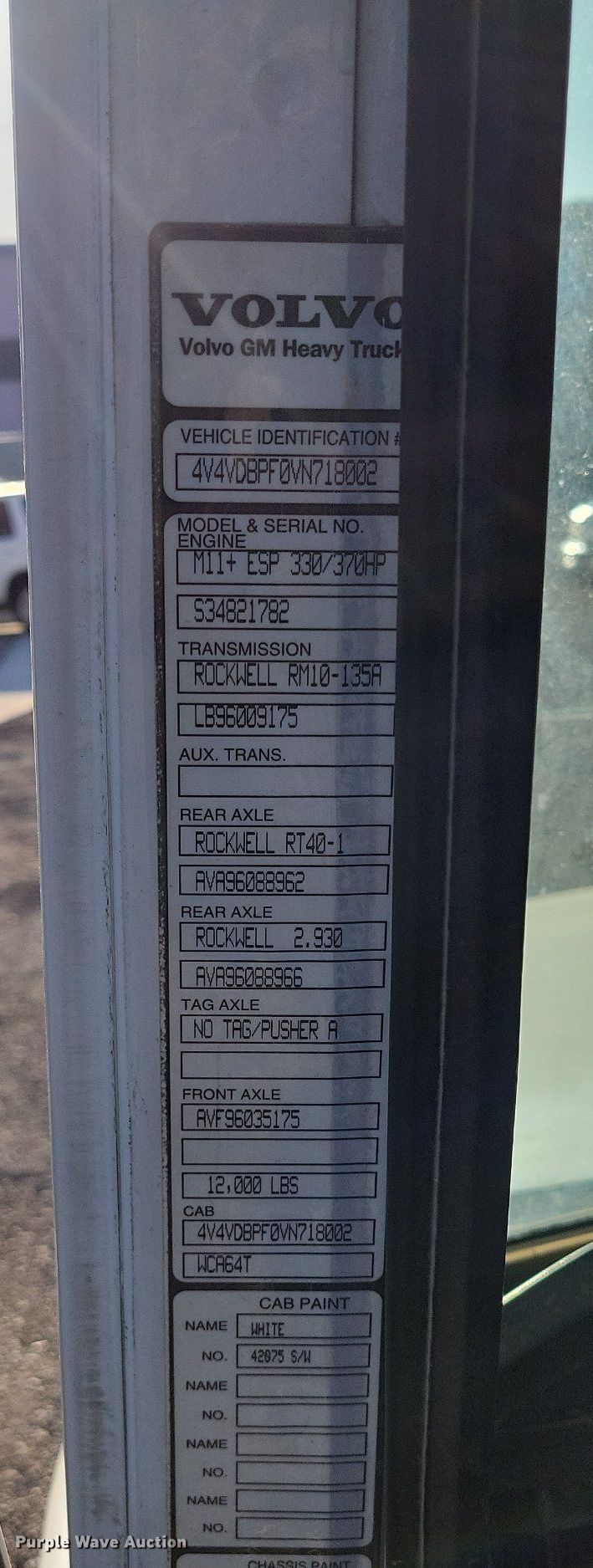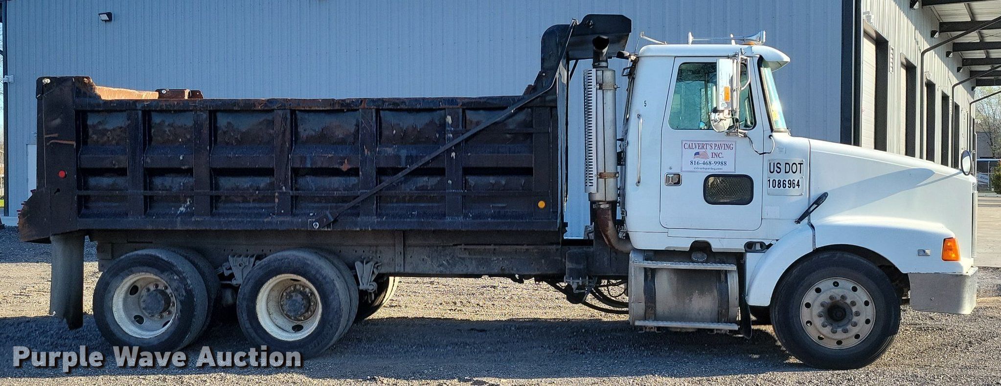 1997 Volvo WCA dump truck. Miles: 32,921 on odometer, VIN: 4V4VDBPF0VN718002. Engine Cummins M11, Serial: S34821782, Displacement: 10.8L, Cylinders: 6, Fuel type: Diesel. Transmission Rockwell RM10-135A, Manual, Speed: 10. Chassis Axles: Tandem, Differential lock: Full, Suspension: Spring, Brakes: Air, PTO, GVWR: 50,000 lbs FAWR: 12,000 lbs, IAWR: 19,000 lbs, RAWR: 19,000 lbs. Interior Heat, Heated mirrors, Cruise control. Features Dump bed Bed type: Steel, Roll tarp, Ram: Single, End gate: Air operated. Tires Size: 295/75R22.5. Missouri title. Title distribution may be delayed up to 14 days from verification of funds. Calvert's Paving Inc.. 6500 East 35th Terrace. Kansas City, MO 64129