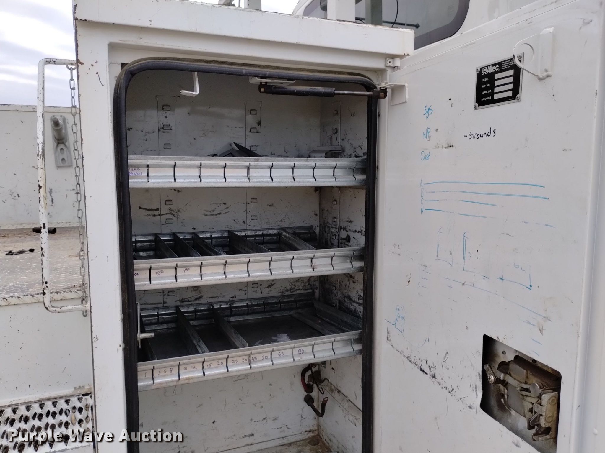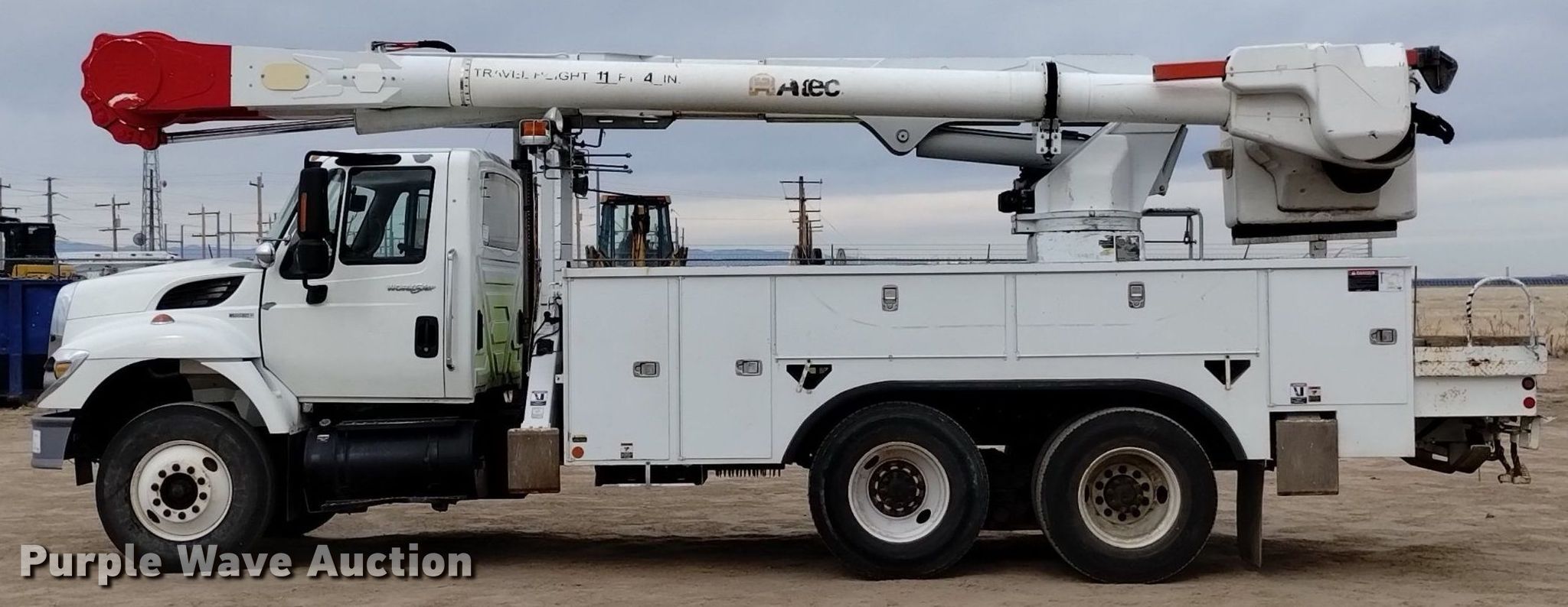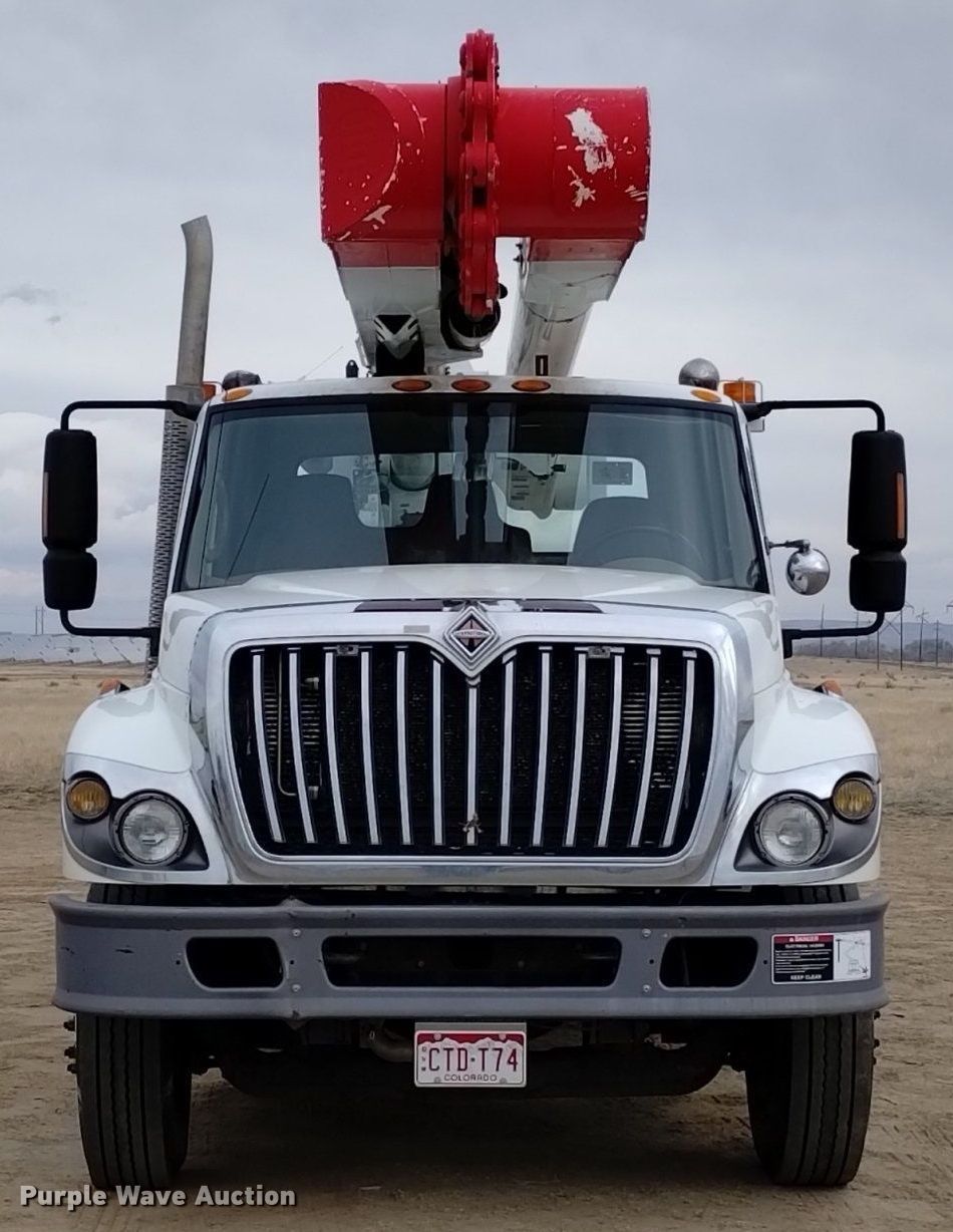 2010 International WorkStar 7400 bucket truck. Miles: 107,822 on odometer, Hours: 13,749 on meter, VIN: 1HTWGAAR0AJ220634. Engine International MaxxForce, Displacement: 7.6L, Cylinders: 6, Fuel type: Diesel. Transmission Allison, Automatic. Chassis Axles: Tandem, Suspension: Spring, Brakes: Air, PTO, Wet kit, GVWR: 54,000 lbs. Interior AC, Heat, Cruise control, Backup camera. Features Bed Altec, 19' 5" L x 95" W, Boom 2009 Altec AM55, Serial: 0809DM2654, Maximum lift capacity: 700 lbs, Maximum lift height: 55', Boom type: Articulating, Insulated, Man basket, Boom controls Ground, Platform/ basket, Material handler, Certification valid through: 08/2024. Tires Size: 11R22.5. Colorado title. Conklin Powerline Services Inc. Pueblo, CO 81006