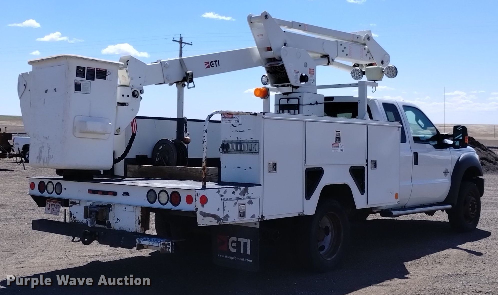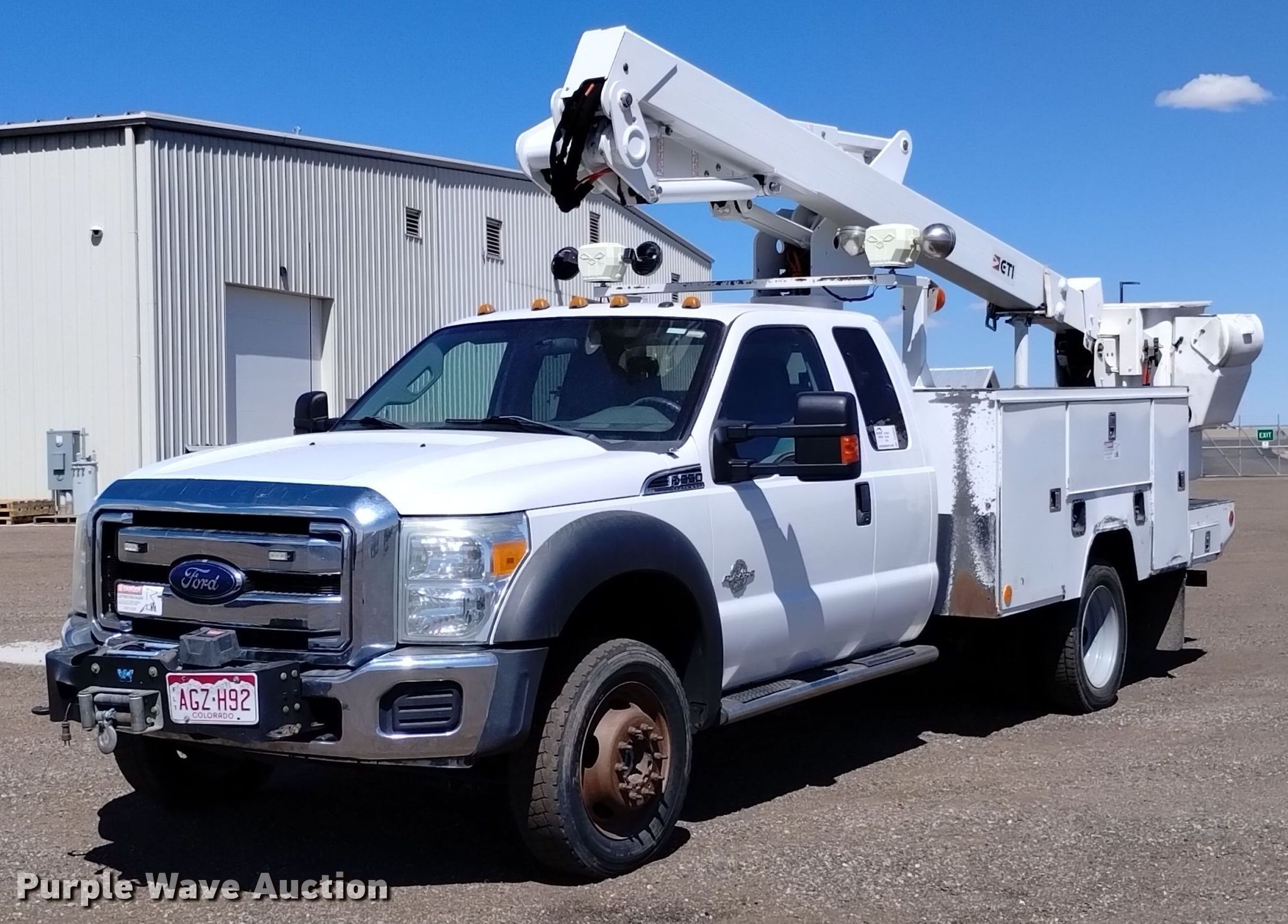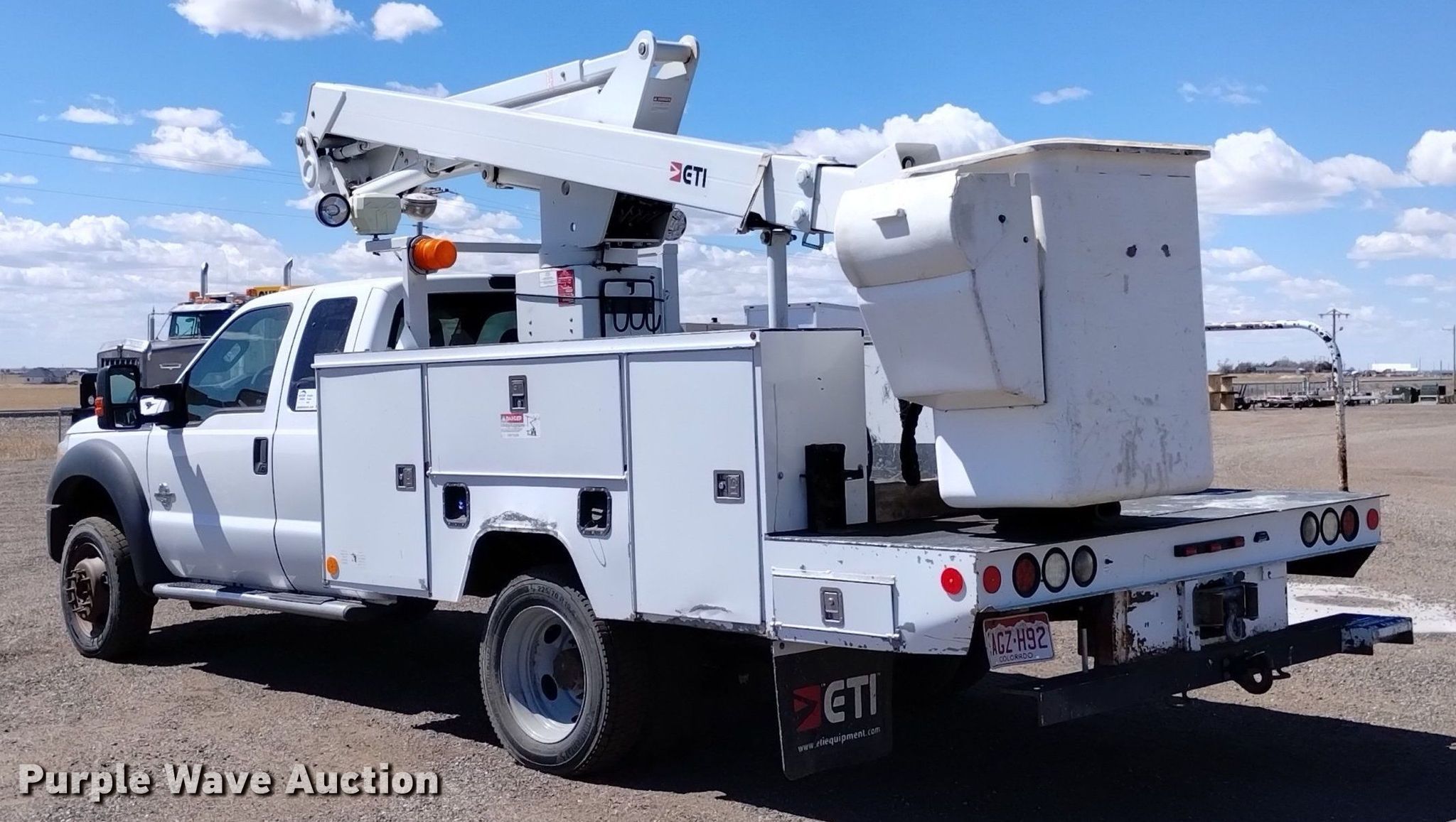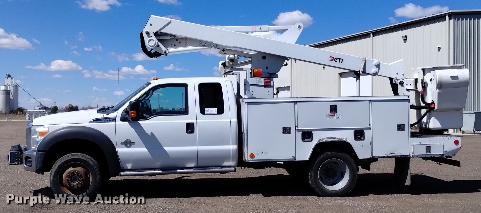 2015 Ford F550 bucket truck. Miles: 231,100 on odometer, VIN: 1FD0X5HT1FEA84246. Engine Displacement: 6.7L V8 OHV, Cylinders: 8, Fuel type: Diesel. Transmission Automatic. Chassis Four wheel drive, Axles: Single, Suspension: Spring, Brakes: Hydraulic, PTO, GVWR: 19,500 lbs. Interior AC, Heat, Heated mirrors, Power windows, Power locks, Cruise control, Auxiliary controls, Brake controller. Features Bed ETI, 12' L x 96" W, Boom 2014 ETI ETC37IH, Maximum lift capacity: 350 lbs, Maximum lift height: 37', Boom type: Articulating, Insulated, Telescopic, Man basket, Boom controls Ground, Platform/ basket, Remote control, Certification valid through: 02/2025, Front winch, Rear winch. Tires Size: 225/70R19.5. Notes Dash warning indicator: Check engine, Possible hydraulic leak, Rear seat missing. Colorado title. Title distribution may be delayed up to 14 days from verification of funds. Y-W Electric Association, Inc.. Akron, CO 80720