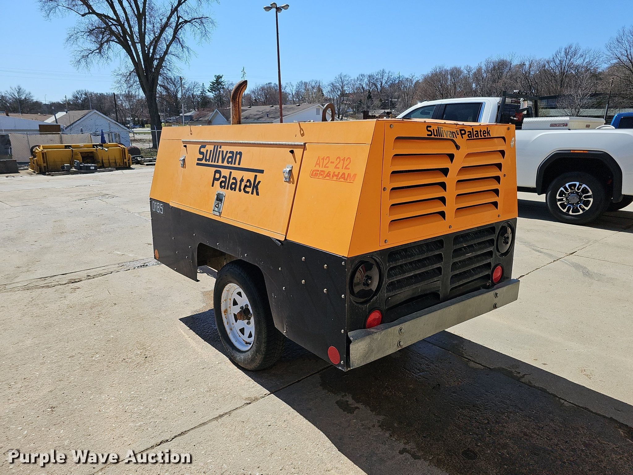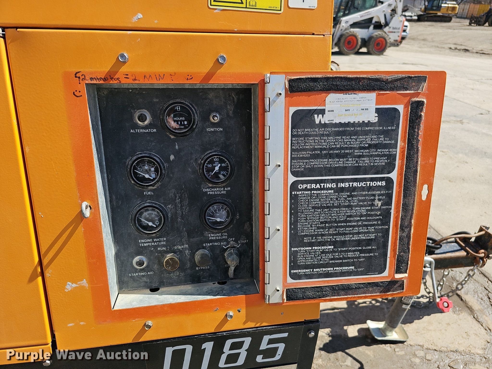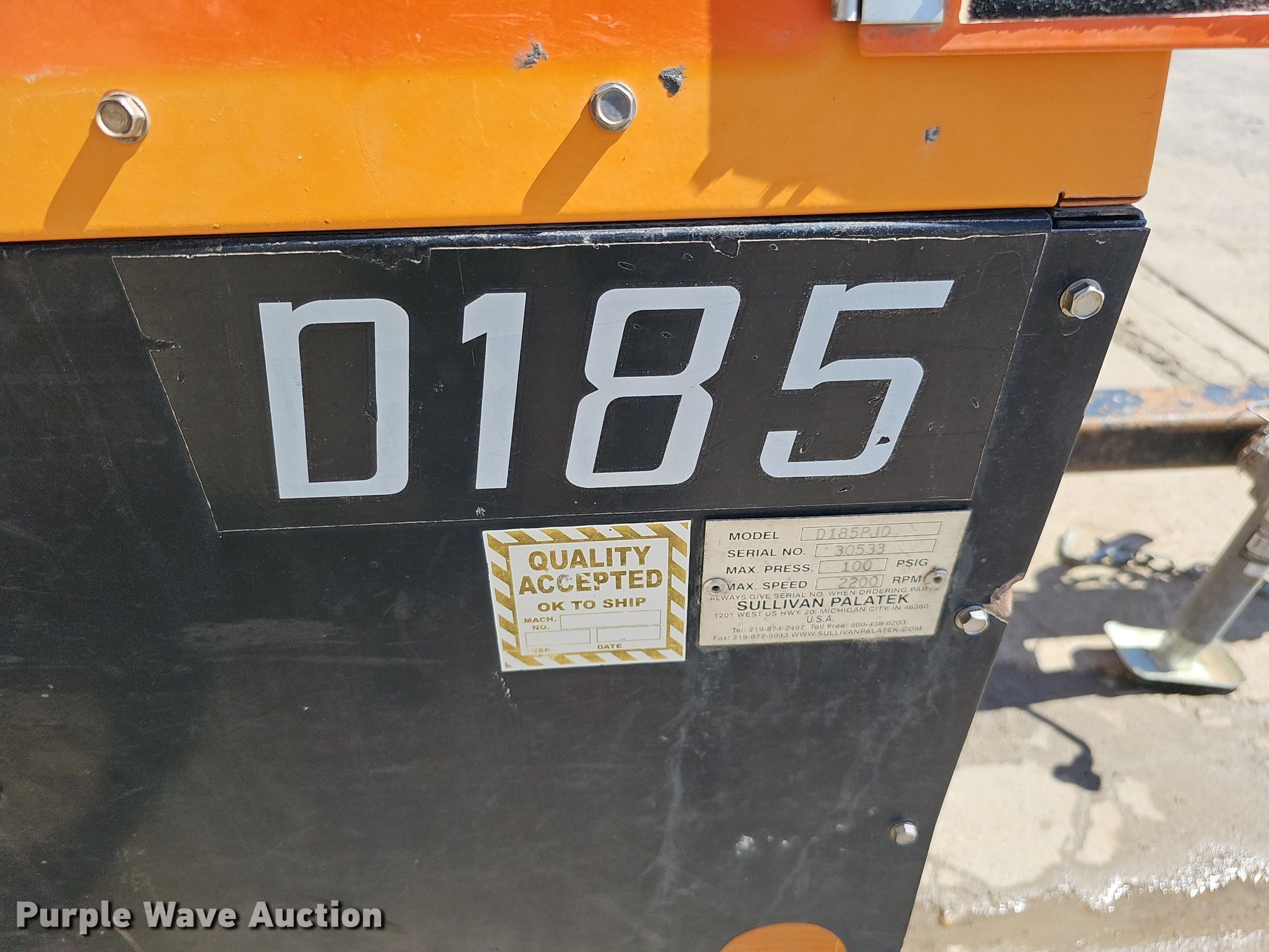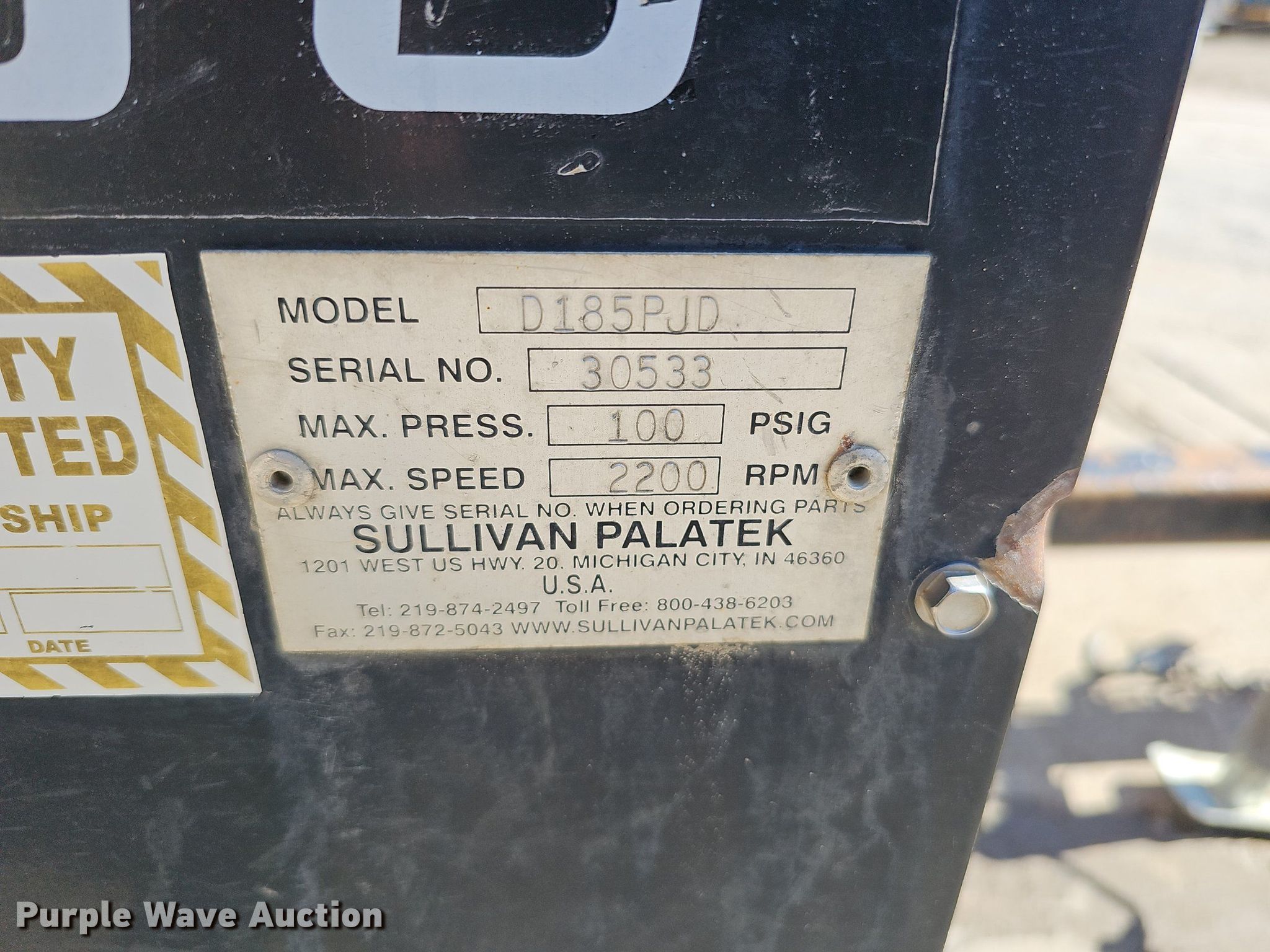 Purple Wave is selling a used Air Compressor in Nebraska. This item is a Sullivan Palatek D185PJD air compressor with the following: Hours: 896 on meter, Serial: 30533, Unit #: A12-212