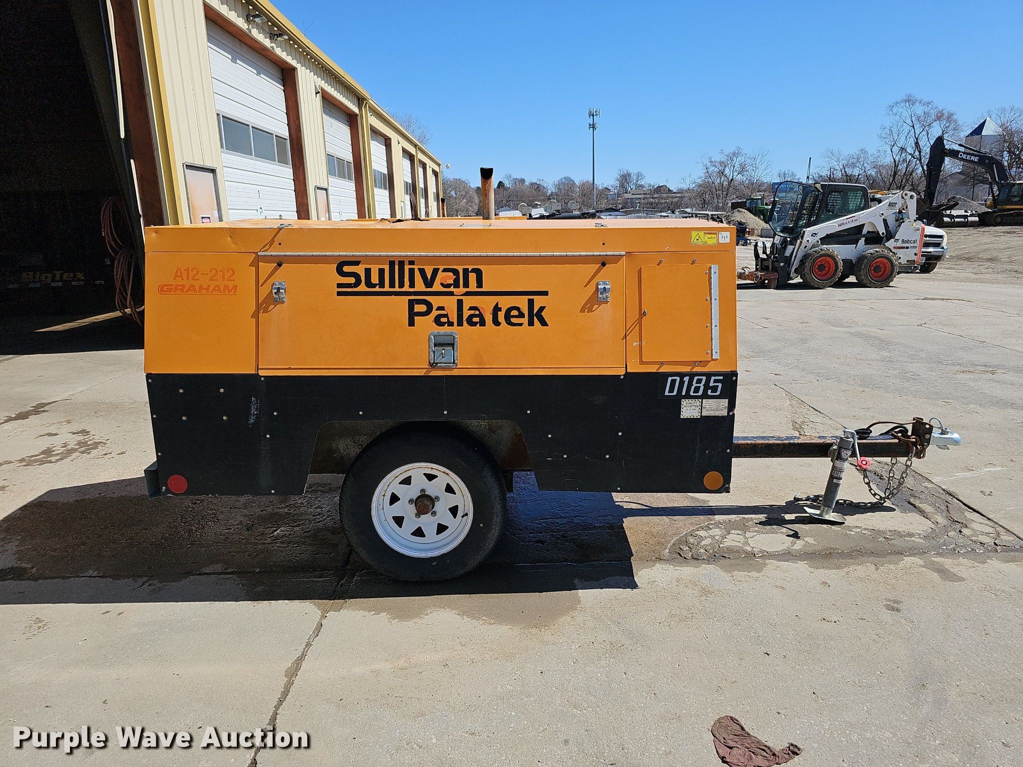 Sullivan Palatek D185PJD air compressor. Hours: 896 on meter, Serial: 30533, Unit #: A12-212. Engine John Deere 4024TF281A, Displacement: 2.4L, Cylinders: 4, Fuel type: Diesel. Features Air compressor CFM: 185, PSI: 100. Trailer 12' L x 55" W, Ball hitch size: 2", Suspension: Spring, Axles: Single, Tire size: ST205/75D15. Transfer of ownership documentation will be a bill of sale. Graham Construction, Inc.. 2209 N 88th St. Omaha, NE 68134