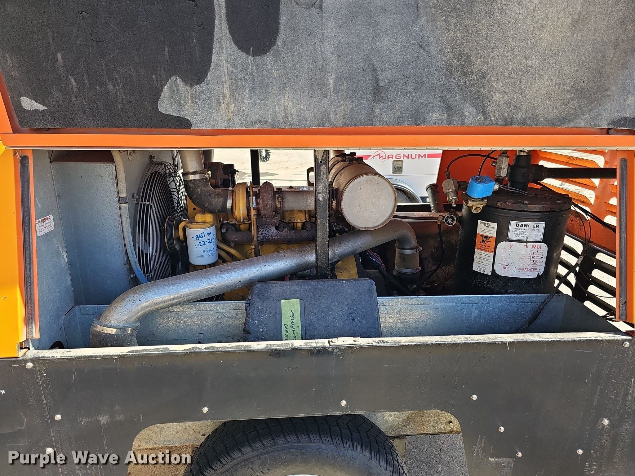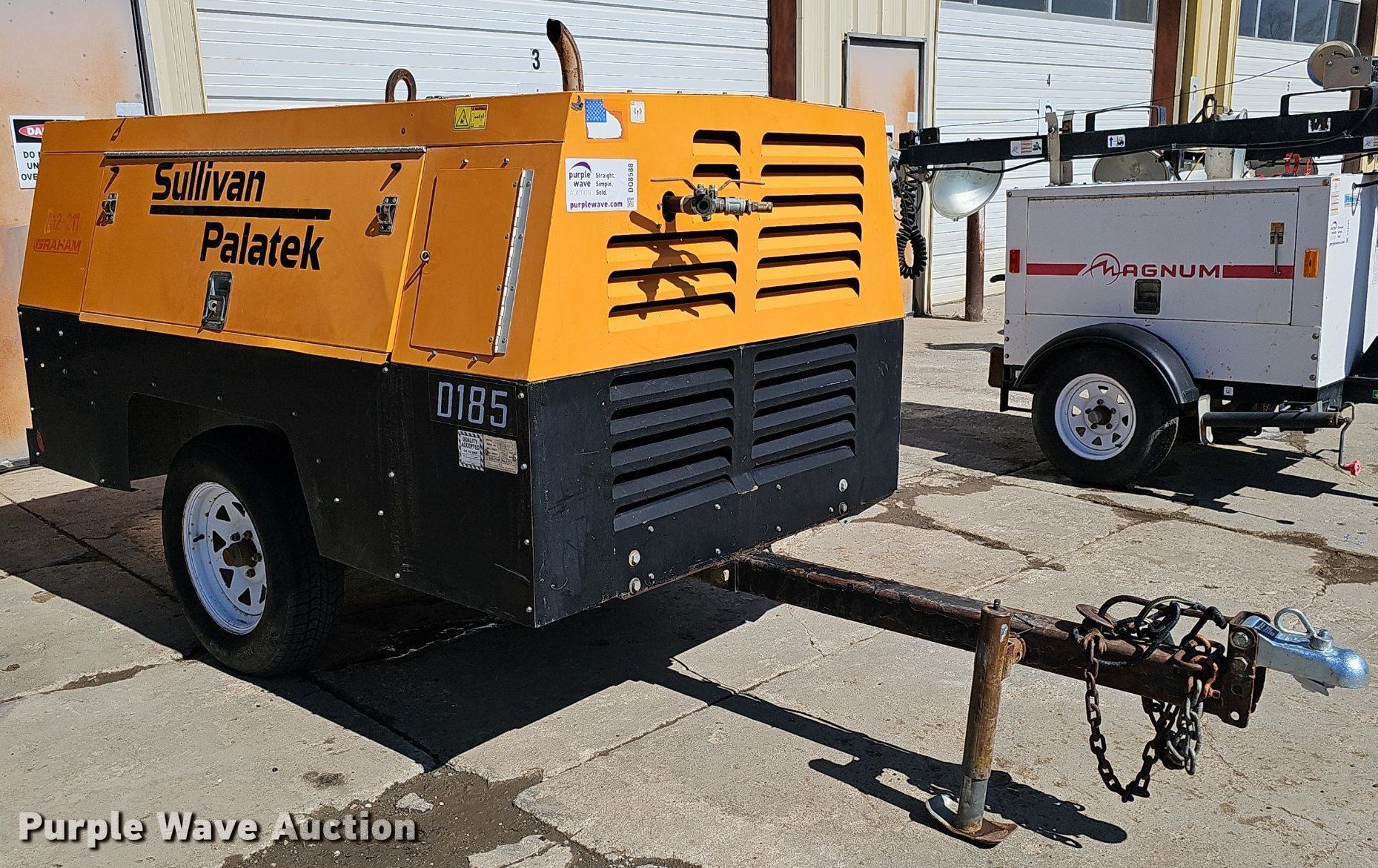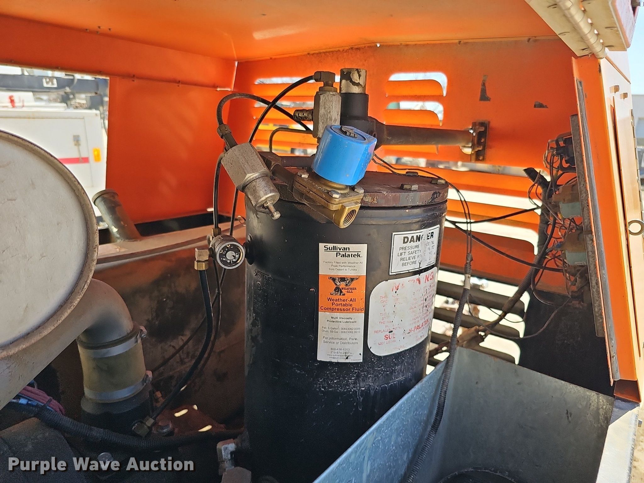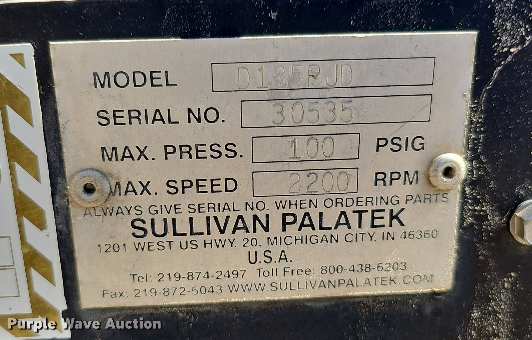 Purple Wave is selling a used Air Compressor in Nebraska. This item is a Sullivan Palatek D185PJD air compressor with the following: Hours: 1,012 on meter, Serial: 30535, Unit #: A12-211