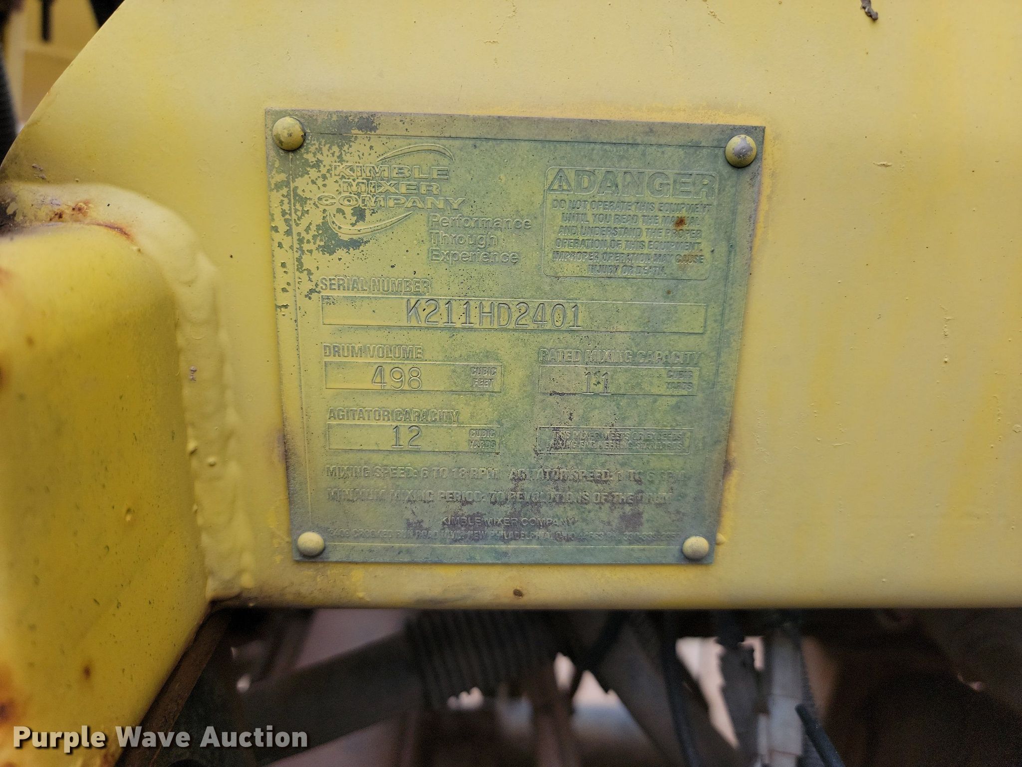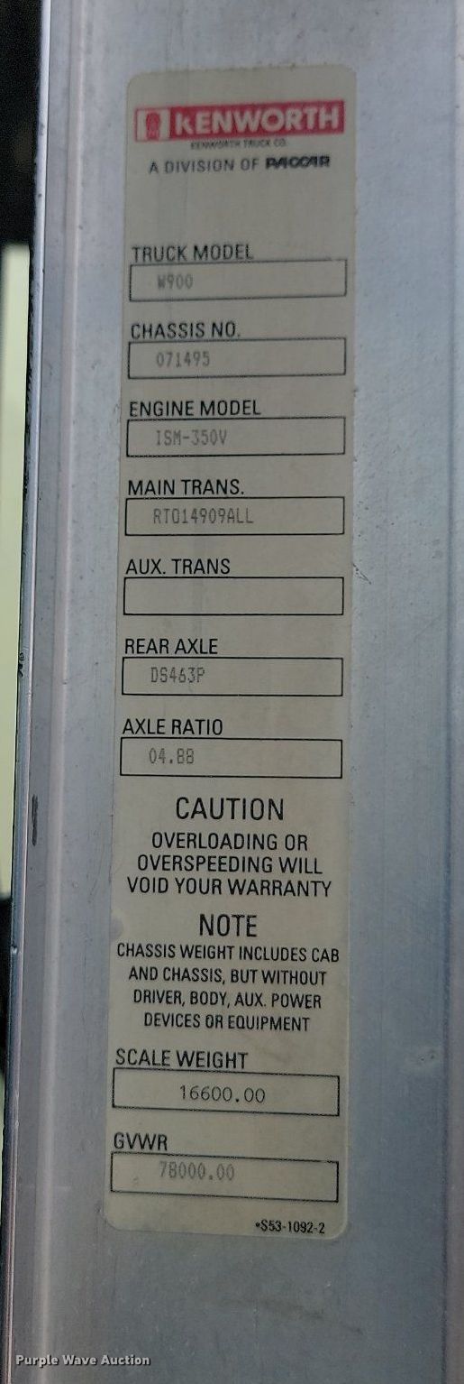 2004 Kenworth W900 ready mix truck. Miles: 224,623 on odometer, Hours: 5,651 on meter, VIN: 1NKWL0EX24J071495. Engine Cummins ISM, Displacement: 10.8L, Cylinders: 6, Fuel type: Diesel. Transmission Eaton Fuller, Manual, Speed: 11. Chassis Axles: 4, Pusher axle Steerable, Tag axle Steerable, Differential lock: Inter-axle, Suspension: Spring over walking beam, Brakes: Air, PTO, GVWR: 78,000 lbs FAWR: 23,000 lbs, IAWR: 23,000 lbs, RAWR: 23,000 lbs. Interior AC, Heat, Heated mirrors, Cruise control. Features Mixer Kimber K-2000, Serial: K211HD2401, Capacity: 11 cu.yd., Discharge: Rear, In-cab controls, Rear drum controls, Water tank capacity: 150 gallons, Chute Extensions: 3, Chute type: Aluminum.. Tires Front: 425/65R22.5, Rear: 11R22.5, Lift axle: 255/70R22.5. Notes Hour meter has been replaced. South Dakota title. Title distribution may be delayed up to 14 days from verification of funds. Knife River - Sweetman Const.. 1305 N Louise Ave. Sioux Falls, SD 57107