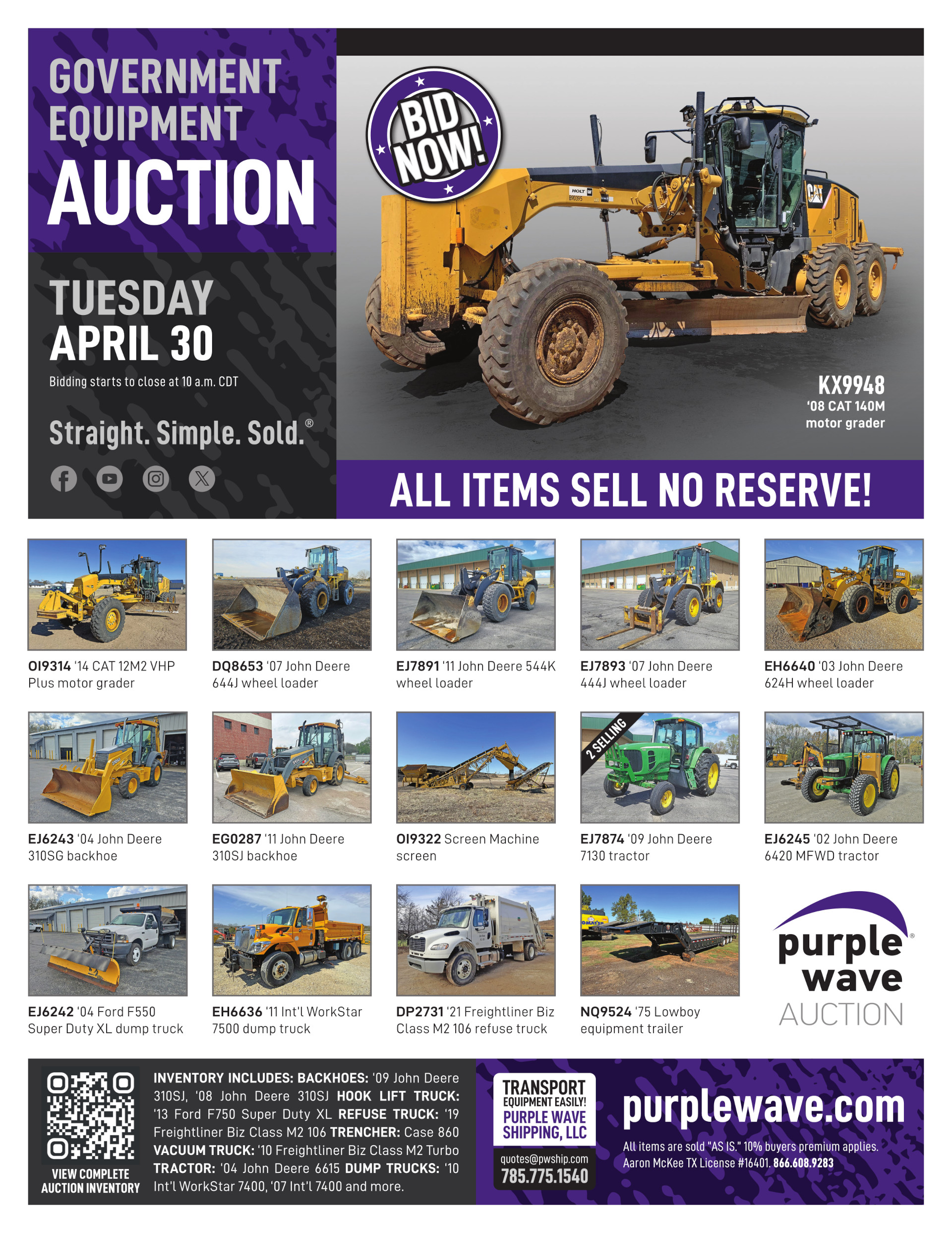 Purple Wave attempts to give its customers an industry leading experience by providing detailed equipment listings. Listings include written descriptions, photographs, location, and consignor information. Equipment descriptions are based on our direct observation and information provided by our selling customer. All information is intended to be as accurate as possible. However, we recommend customers inspect prior to bidding. Purple Wave listings are not intended to be substitutions for inspection. The details provided may differ on equipment based on information provided by the consignor. An error or omission in the listing will not change the results of the bid. It is the responsibility of the buyer to conduct any inspection and examination necessary to satisfy the buyer of all material facts before placing a bid.