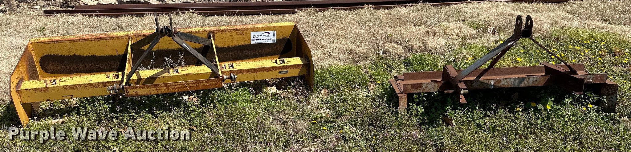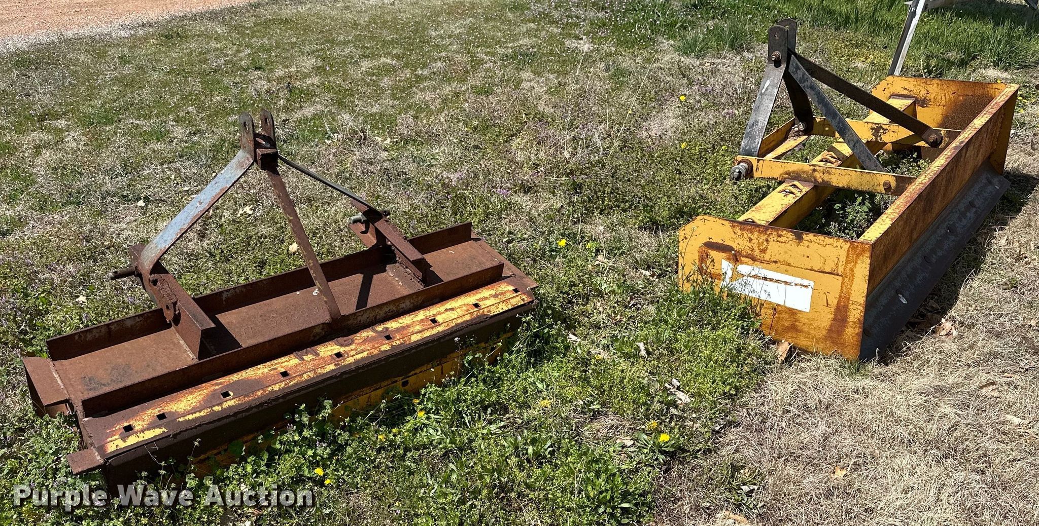 Purple Wave is selling a used Pull Type Scraper in Oklahoma. This item is a (2) box blades with the following: Hitch: Three point, Widths:, 73", 52"