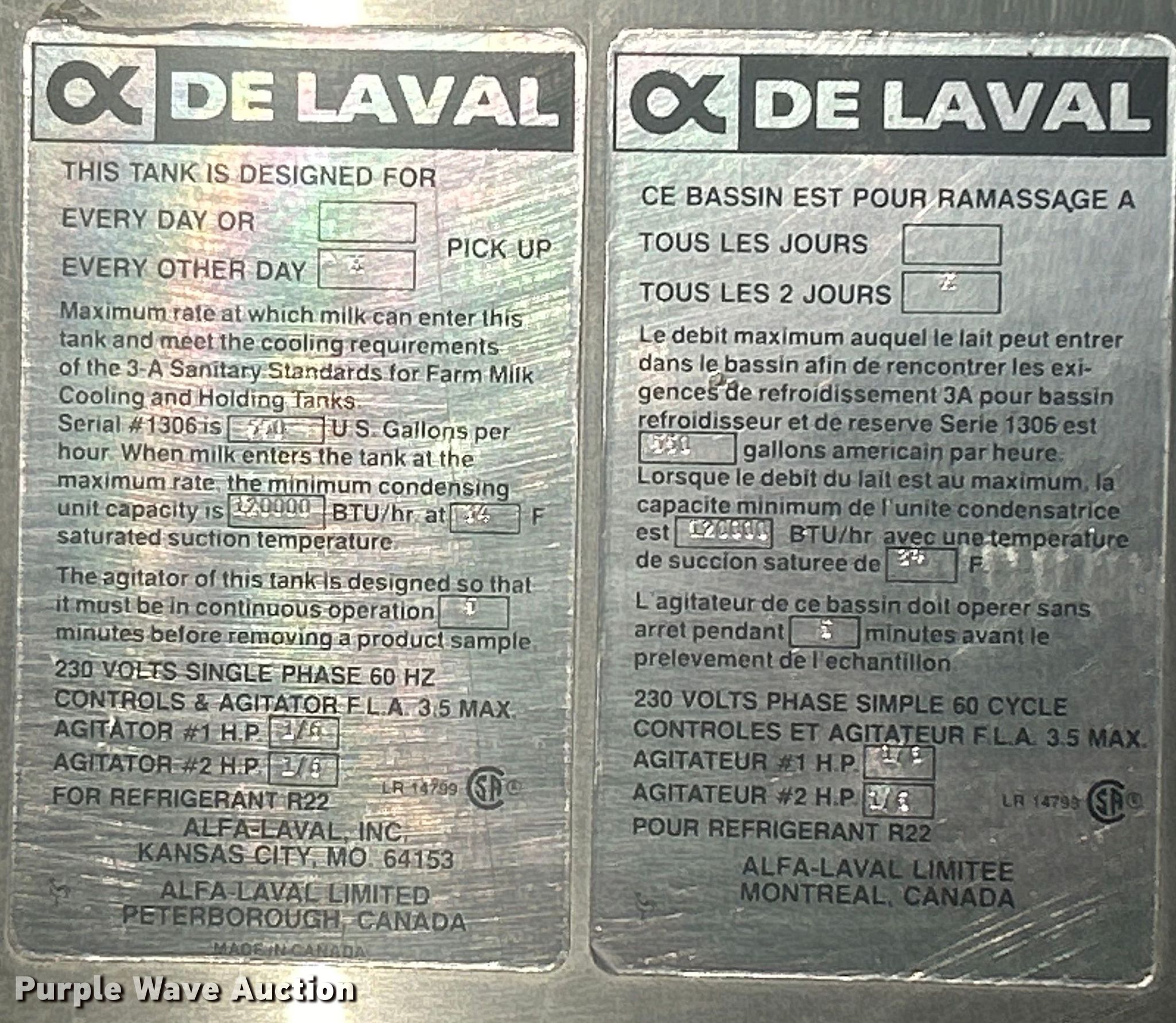 Purple Wave is selling a used Livestock Equip. in Oklahoma. This item is a Alfa Laval Model AC3000 Stainless steel milk tank with the following: Serial: 82718, Sale #: 2439-KP