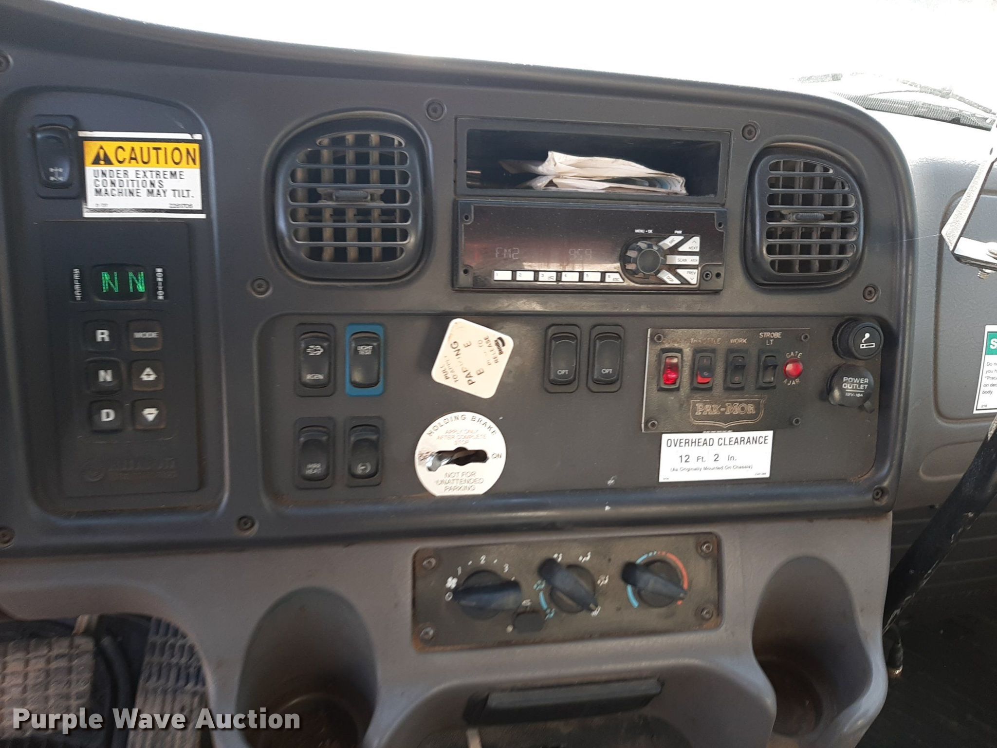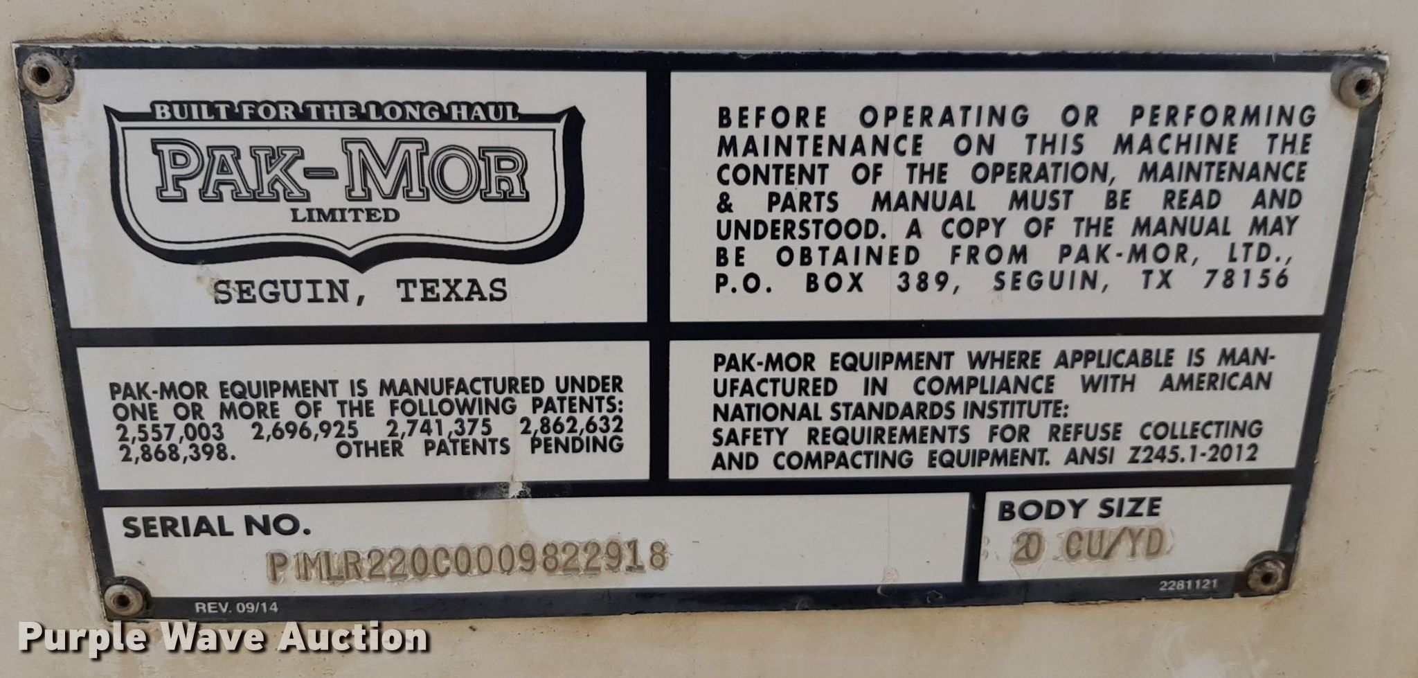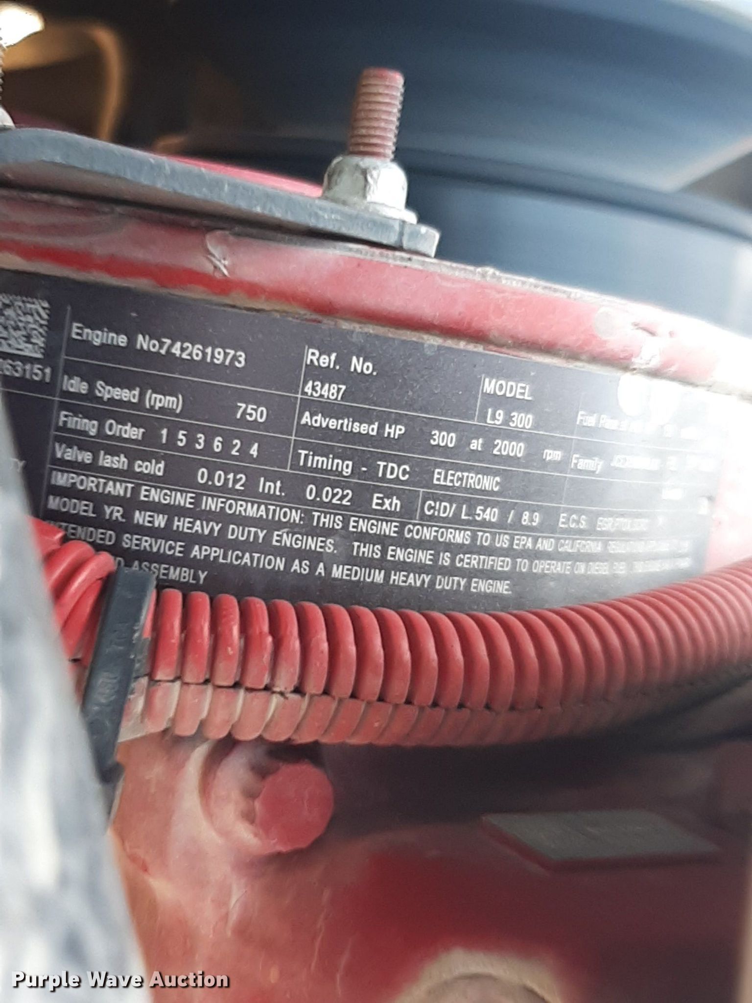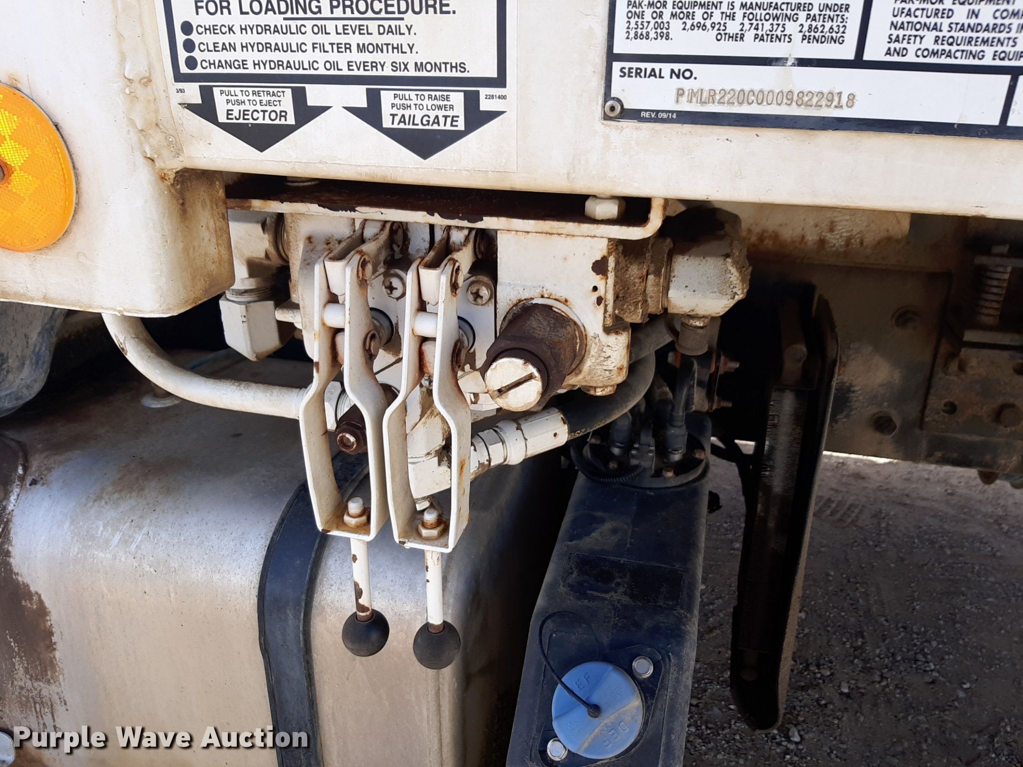 2019 Freightliner Business Class M2 106 refuse truck. Miles: 100,174 on odometer, Hours: 7,703 on meter, VIN: 1FVACXFE3KHKD7867. Engine Cummins L9 300, Displacement: 8.9L, Cylinders: 6, Fuel type: Diesel. Transmission Automatic. Chassis Axles: Single, Suspension: Spring, Brakes: Air, PTO, GVWR: 33,000 lbs. Interior AC, Heat, Heated mirrors, Cruise control. Features Refuse bed Pak-Mor, Capacity: 20 cu.yd., Load: Rear, Cart tipper, Winch. Tires Size: 11R22.5. Notes Windshield chipped or cracked. Kansas title. Title distribution may be delayed up to 14 days from verification of funds. Chautauqua County. Sedan, KS 67361
