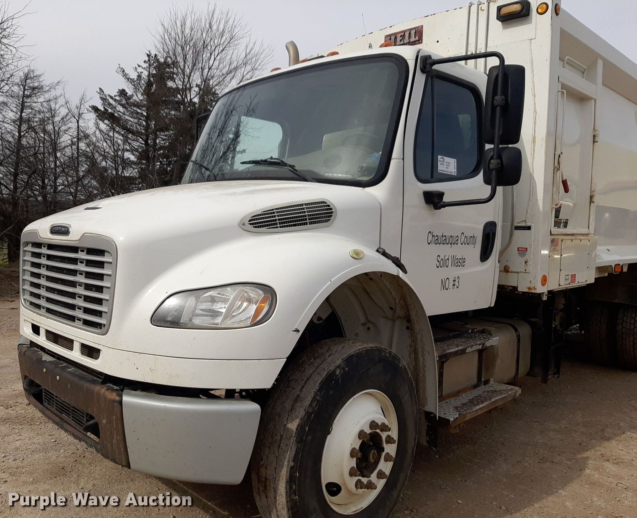 2015 Freightliner Business Class M2 106 refuse truck. Miles: 154,607 on odometer, Hours: 10,010 on meter, VIN: 1FVACYCY8FHGN0871. Engine Cummins, Displacement: 8.9L, Cylinders: 6, Fuel type: Diesel. Transmission Automatic. Chassis Axles: Single, Suspension: Spring, Brakes: Air, PTO, GVWR: 36,020 lbs. Interior AC, Heat, Heated mirrors, Cruise control. Features Refuse bed Heil Formula 4000, Capacity: Approx. 20 cu.yd., Load: Rear, Cart tipper, Winch. Tires Size: 11R22.5. Kansas title. Title distribution may be delayed up to 14 days from verification of funds. Chautauqua County. Sedan, KS 67361