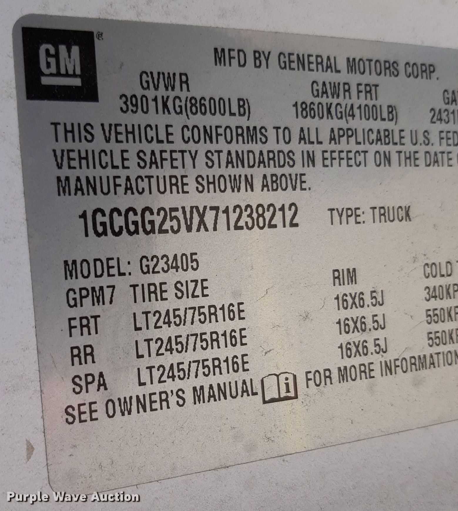 2007 Chevrolet Express 2500 van. Miles: 96,136 on odometer, VIN: 1GCGG25VX71238212, Unit #: 20-439. Engine Displacement: 4.8L V8 OHV, Cylinders: 8, Fuel type: Gas. Transmission Automatic. Interior AC, Heat. Tires Size: 245/75R16. Notes Dash warning indicator: Check engine. Kansas title. Wichita Public Schools - USD 259. Wichita, KS 67219