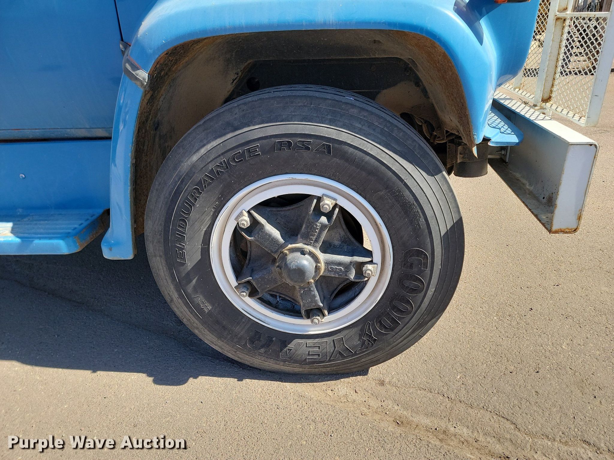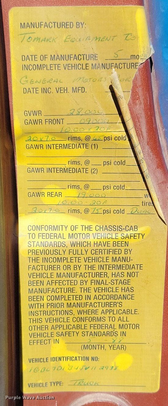 1988 Chevrolet C70 dump flatbed truck. Miles: 27,954 on odometer, VIN: 1GBL7D1B4JV112938, Unit #: 51-30. Engine GM, Displacement: 7.4L, Cylinders: 8, Fuel type: Gas. Transmission Automatic. Chassis Axles: Single, Suspension: Spring, Brakes: Hydraulic, PTO, GVWR: 28,000 lbs. Interior Heat. Features Dump flatbed 14' L x 96" W, Removable sides, Concrete mixer Honda engine, HP: 8. Tires Front: 11R22.5, Rear: 10.00R20. Notes Dead battery. South Dakota title. City of Sioux Falls - Open Inspection April 25. 1000 East Chambers Street. Sioux Falls, SD 57104