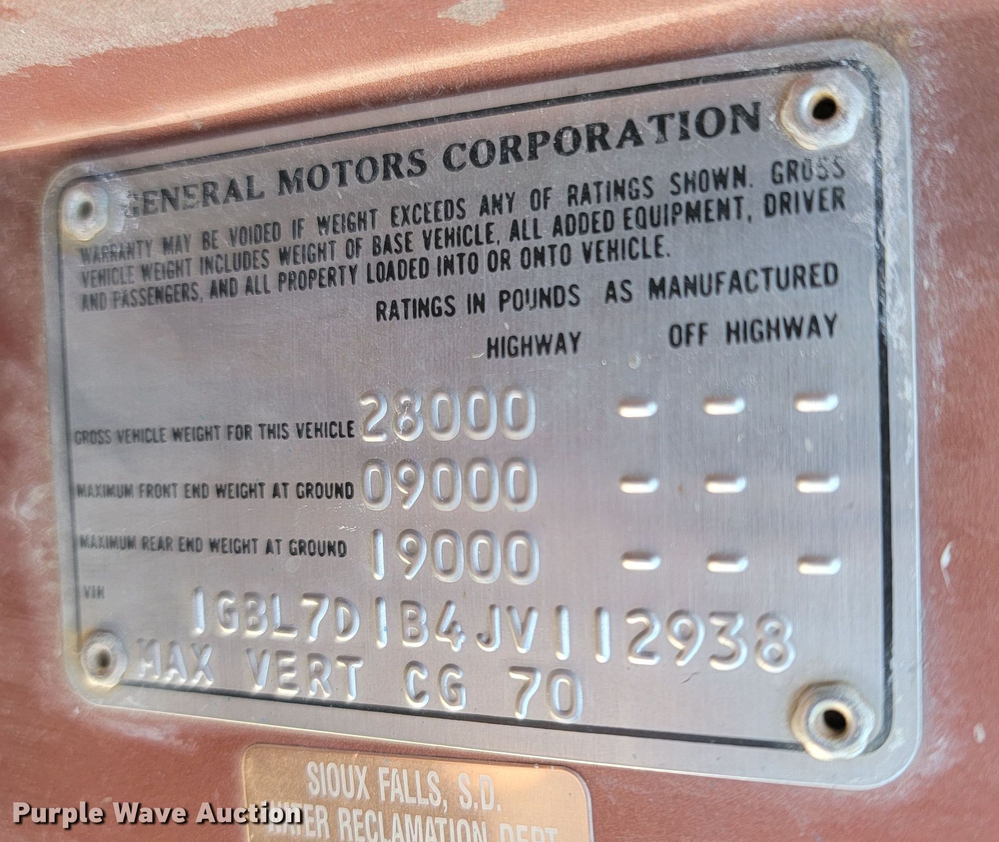 Purple Wave is selling a used Flat Bed Truck in South Dakota. This item is a 1988 Chevrolet C70 dump flatbed truck with the following: Miles: 27,954 on odometer, VIN: 1GBL7D1B4JV112938, Unit #: 51-30
