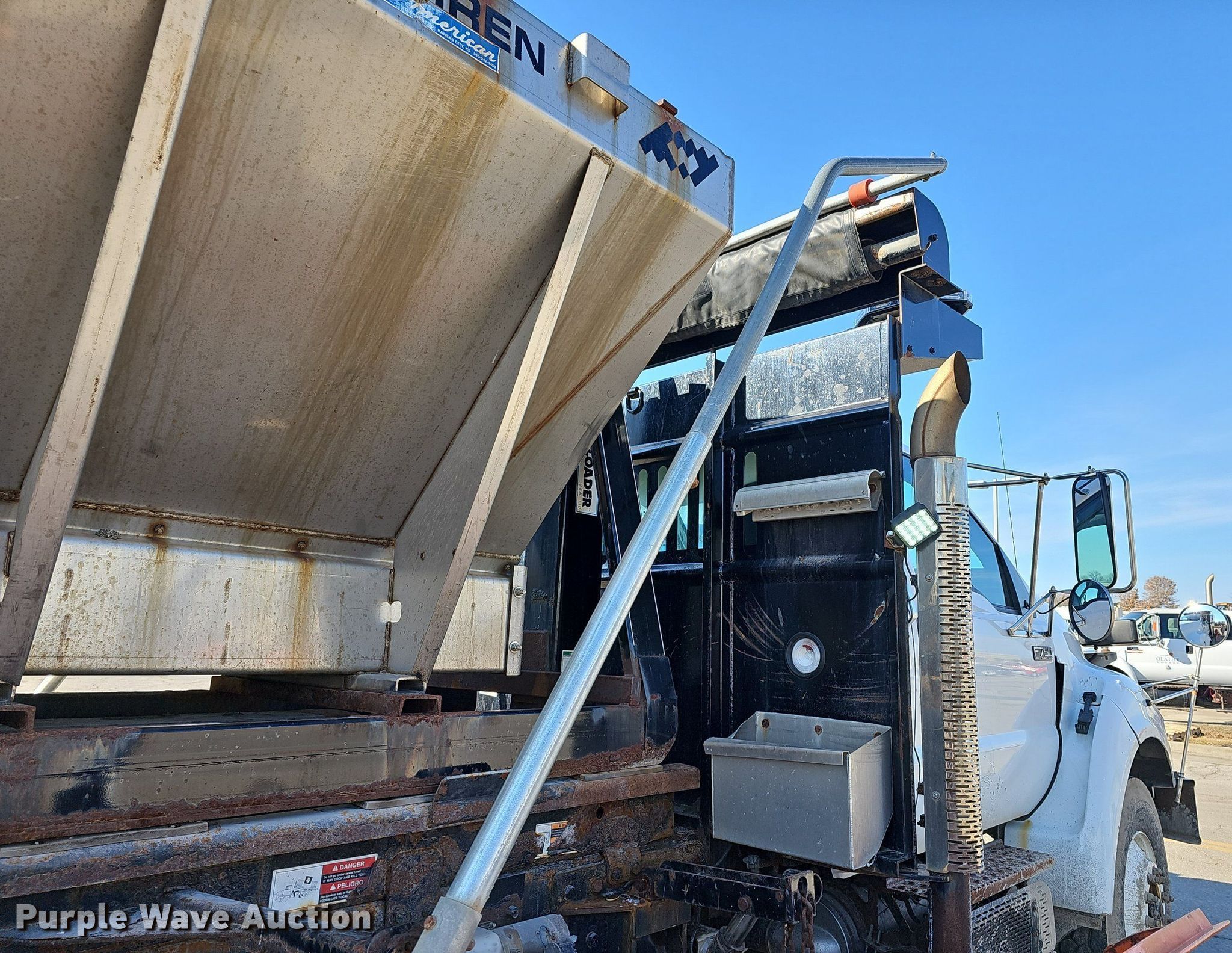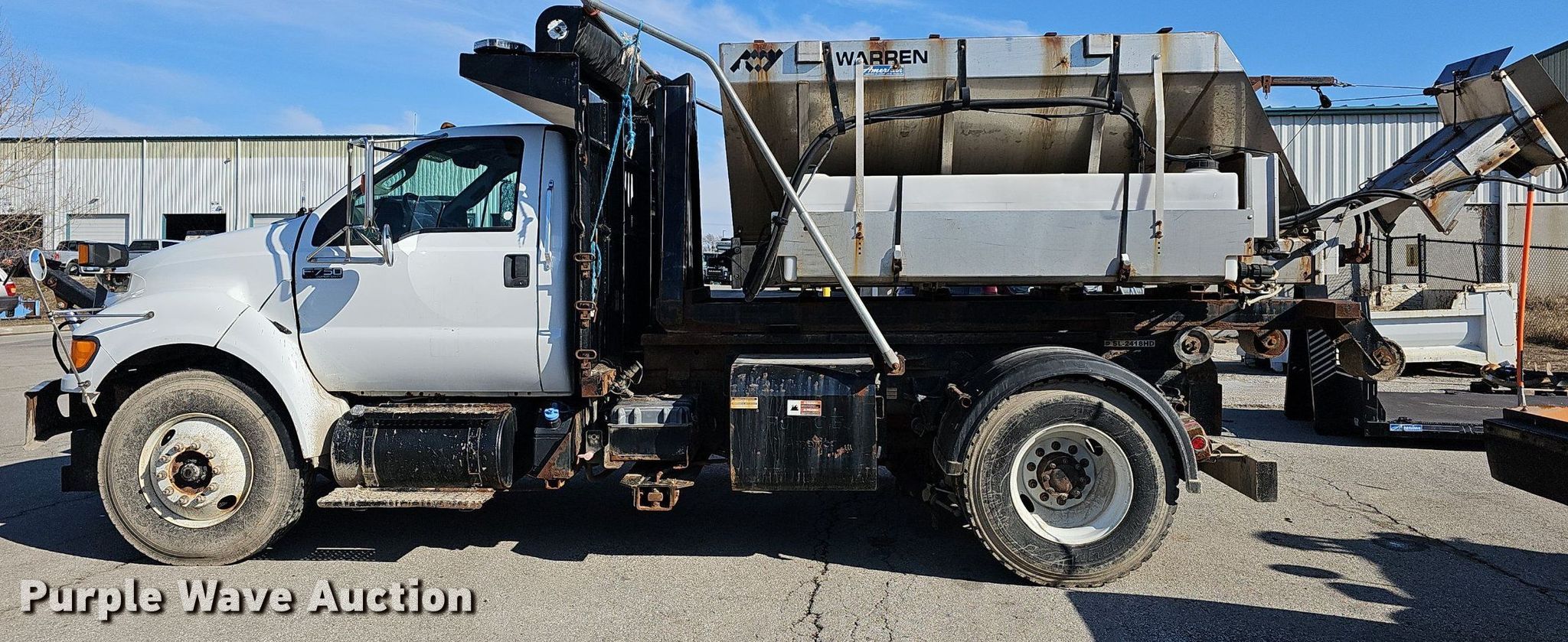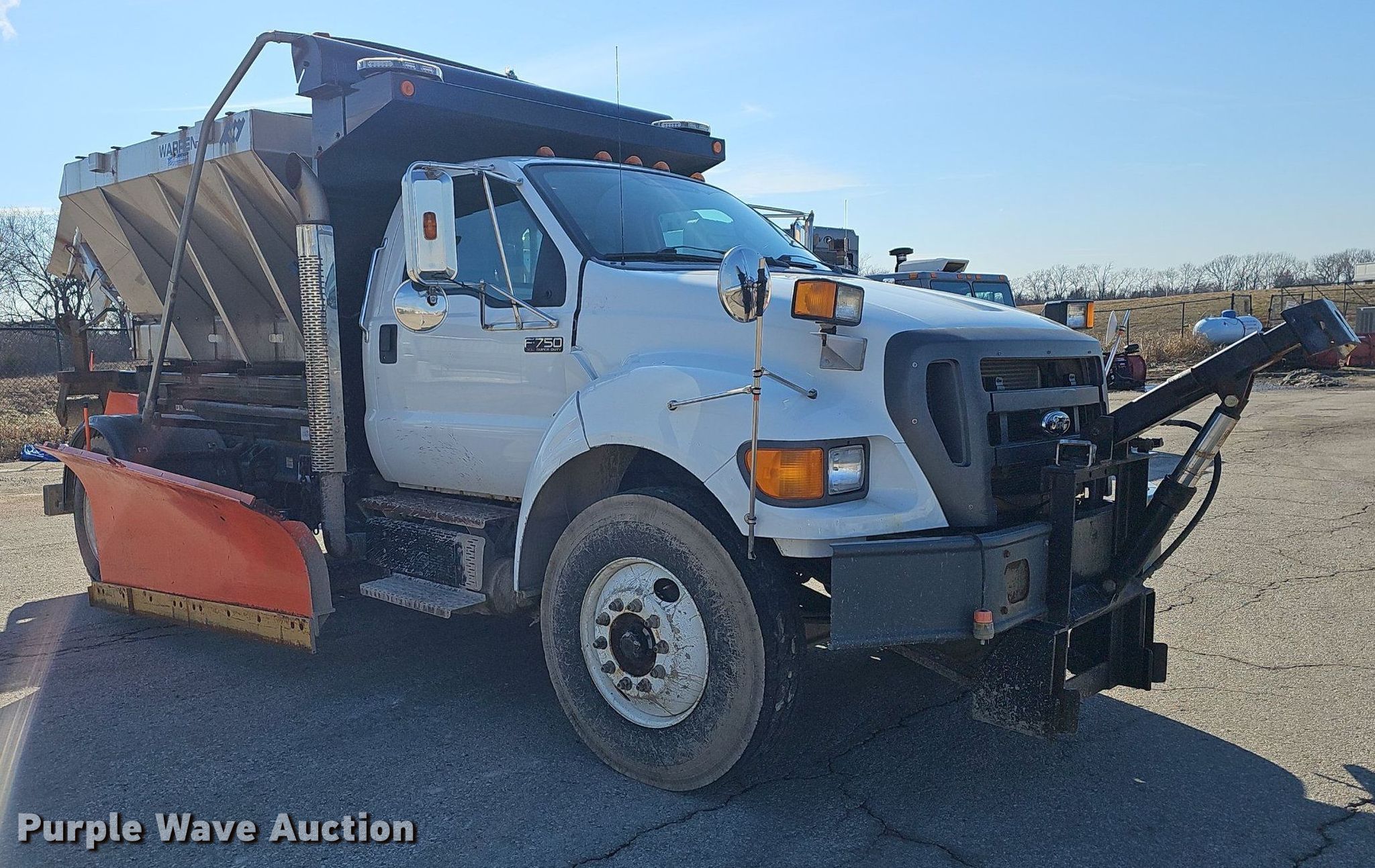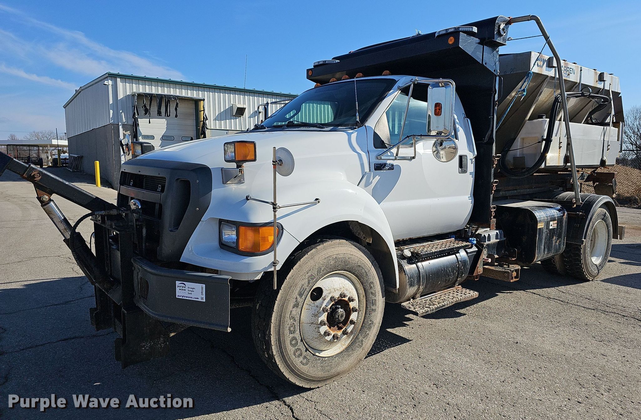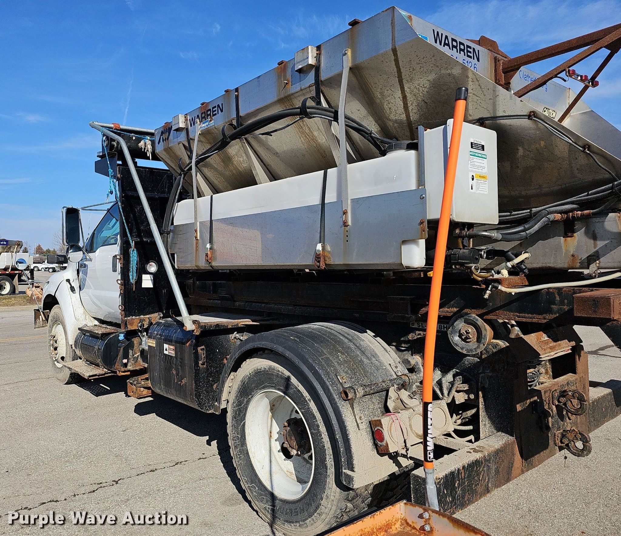 2013 Ford F750 Super Duty XL hook lift truck. Hours: 5,285 on meter, Miles: Unknown, VIN: 3FRXF7FJ8DV770792, Unit #: 6497. Engine Displacement: 6.7L, Cylinders: 6, Fuel type: Diesel. Transmission Allison, Automatic. Chassis Axles: Single, Suspension: Spring, Brakes: Air, GVWR: 33,000 lbs, Wheelbase: 176". Interior Heat, Cruise control. Features Hook lift bed Swaploader, Serial: SL2418HD, 13' L x 41.5" W, Roll tarp, Ram: Double, Warren S.S. V-box spreader Liquid salt tank, Henke wing snow plow Width: 8'. Tires Size: 11R22.5. Notes Non-operational dash clusters. Kansas title. City of Olathe. Olathe, KS 66061