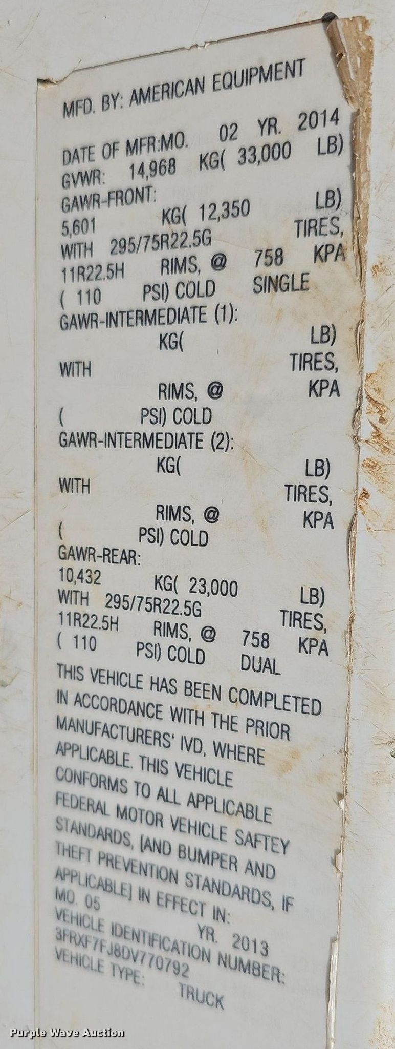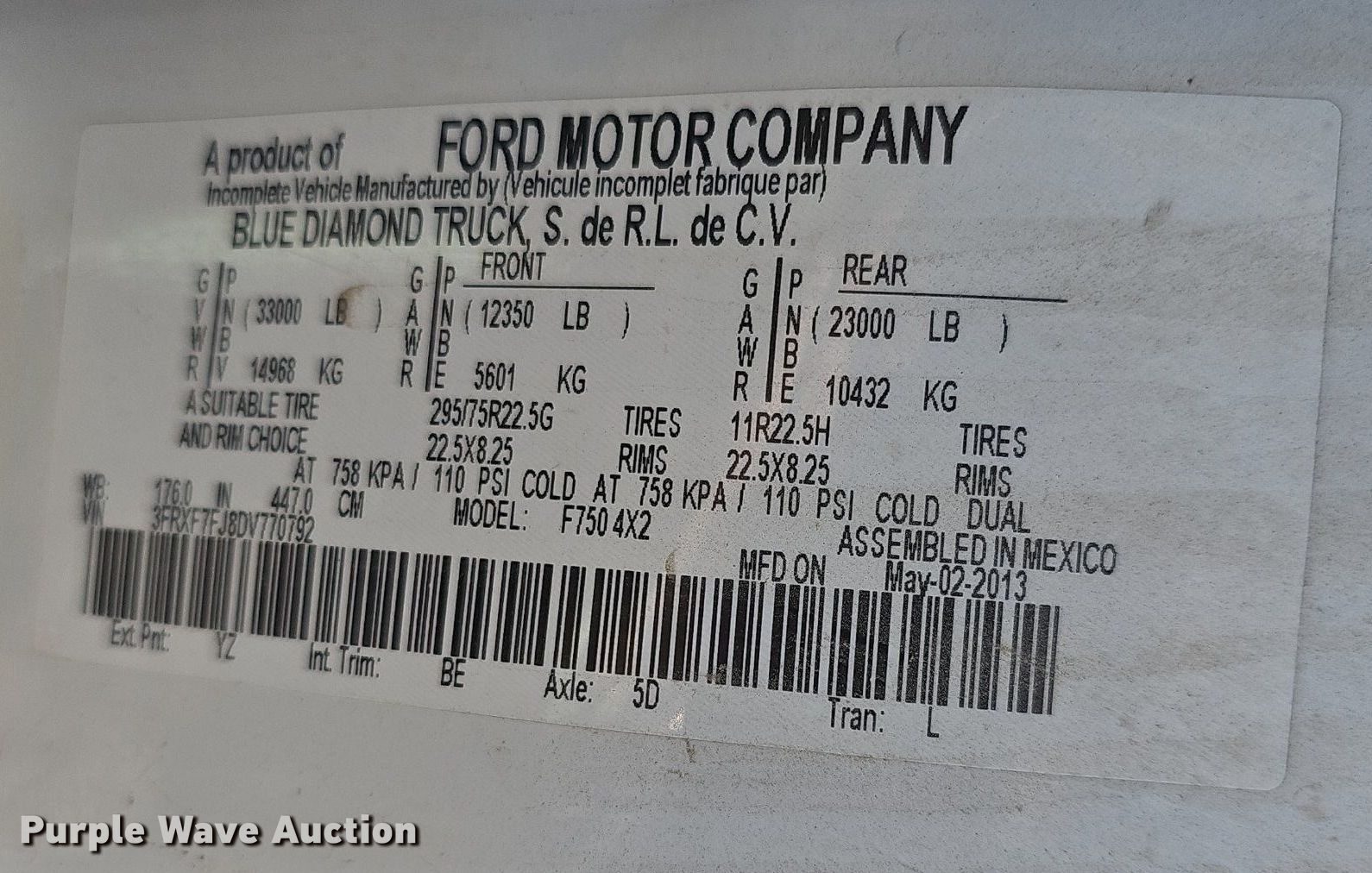 Purple Wave is selling a used Rollback or Tow Truck in Kansas. This item is a 2013 Ford F750 Super Duty XL hook lift truck with the following: Hours: 5,285 on meter, Miles: Unknown, VIN: 3FRXF7FJ8DV770792, Unit #: 6497
