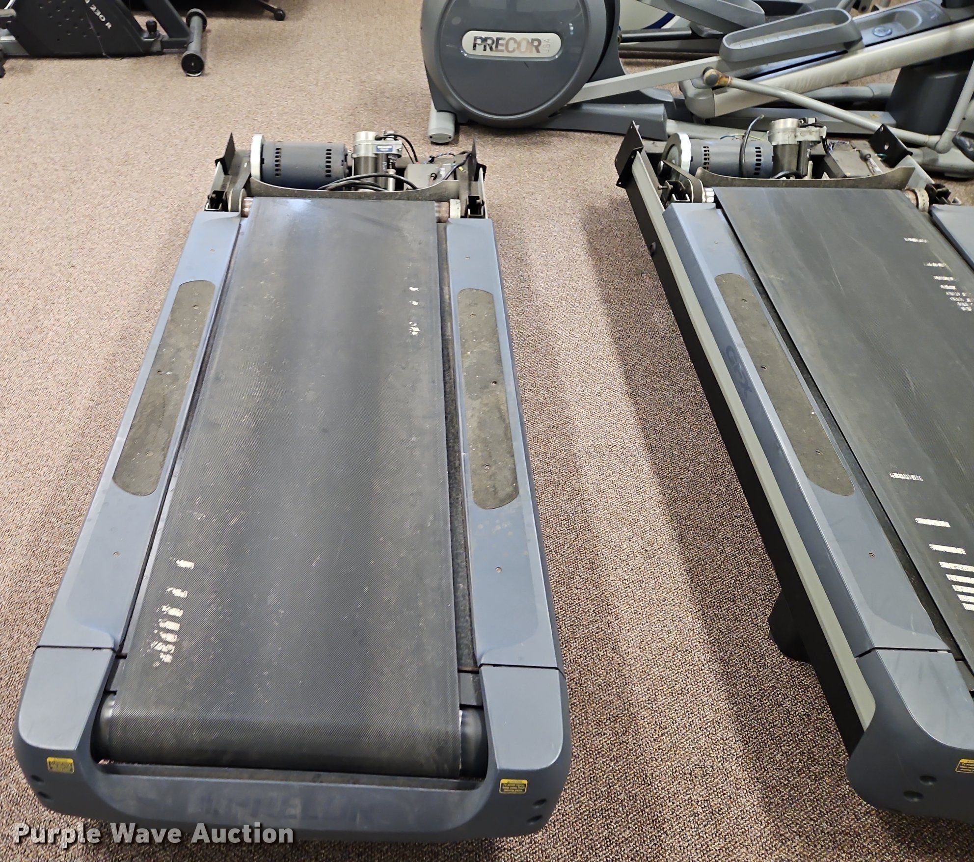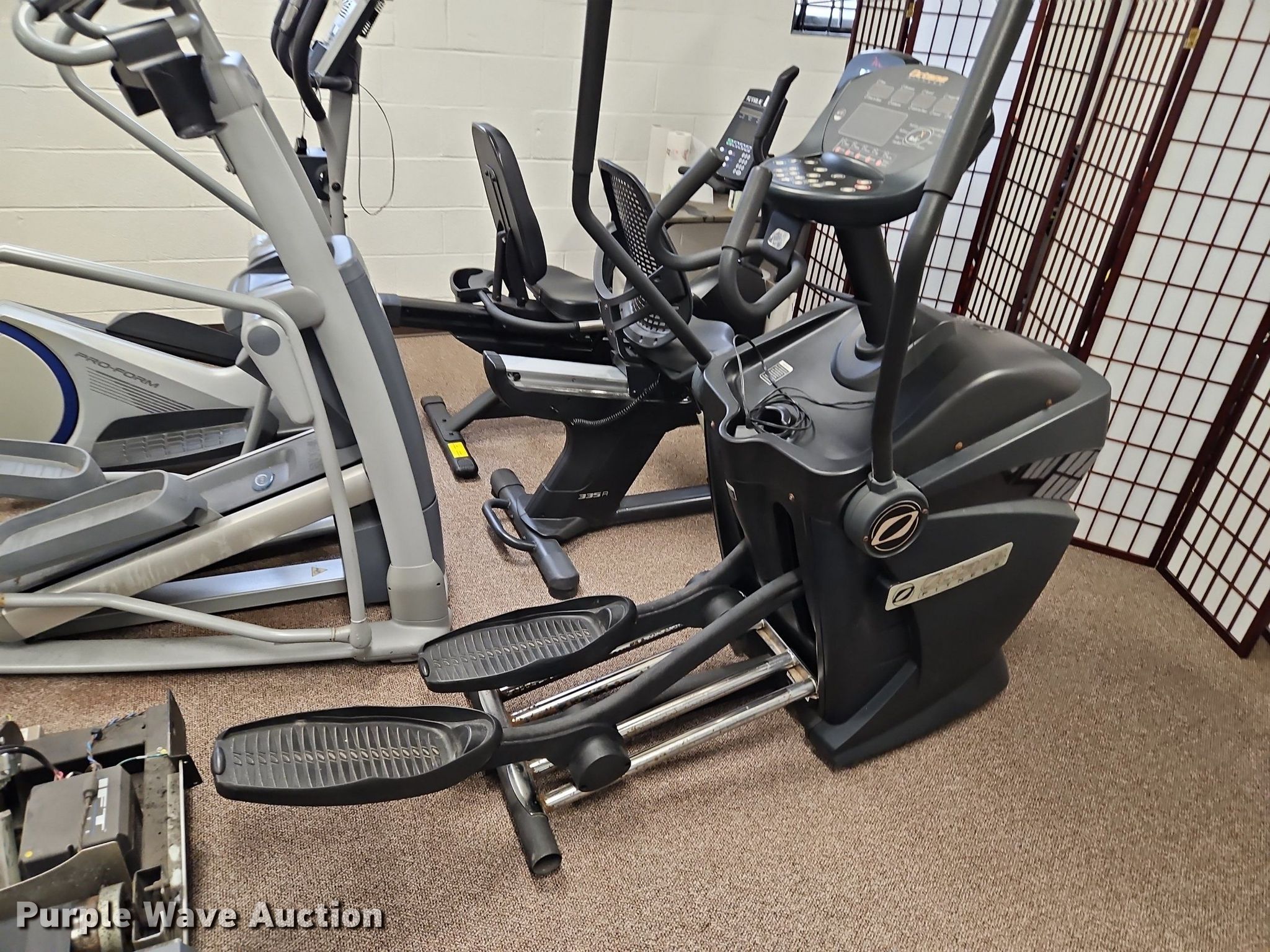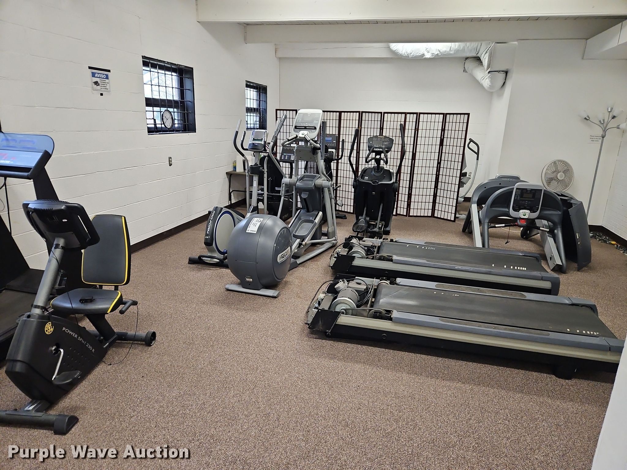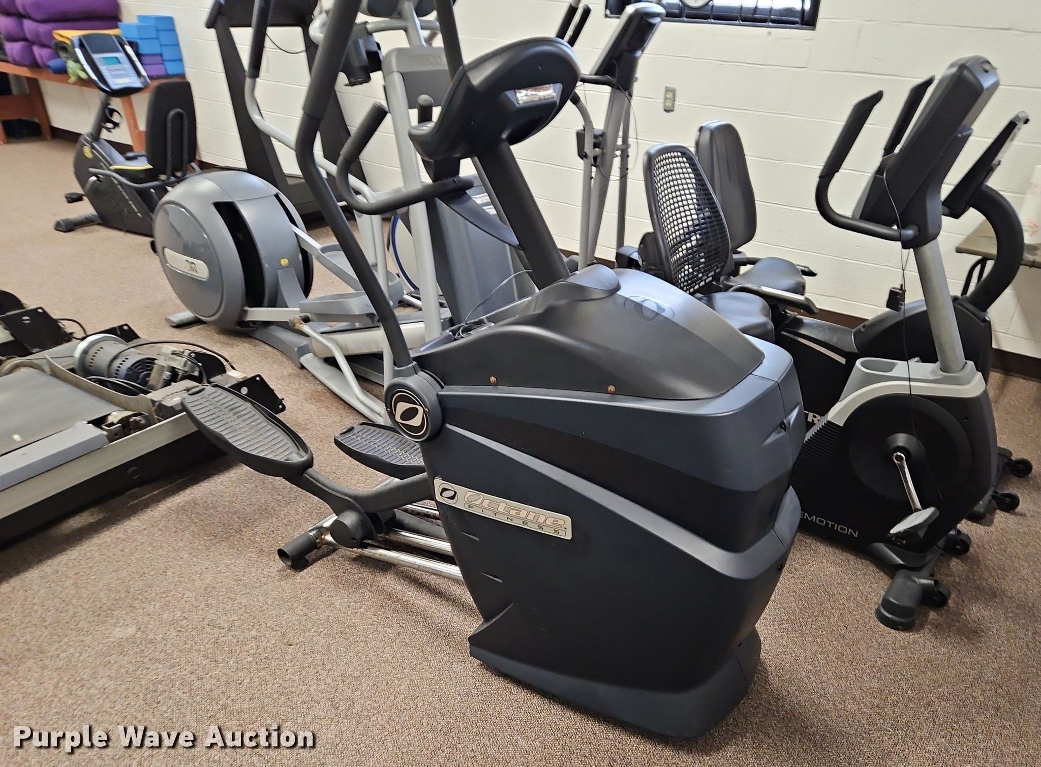 Purple Wave is selling a used Sporting Goods in Kansas. This item is a Exercise equipment with the following: (3) treadmills, (2) dissembled, (3) stationary bikes, (2) elliptical machines, Tuff Stuff leg press machine