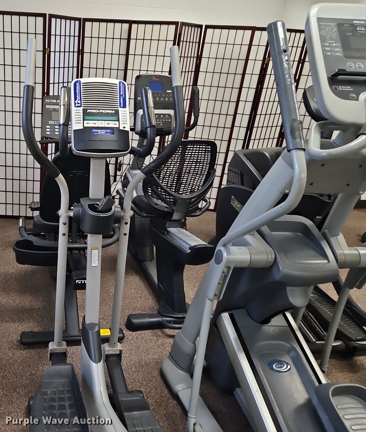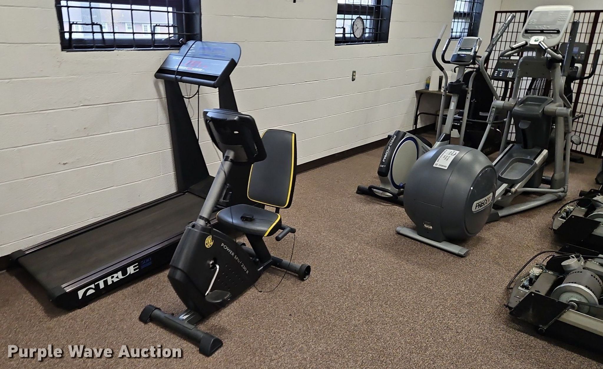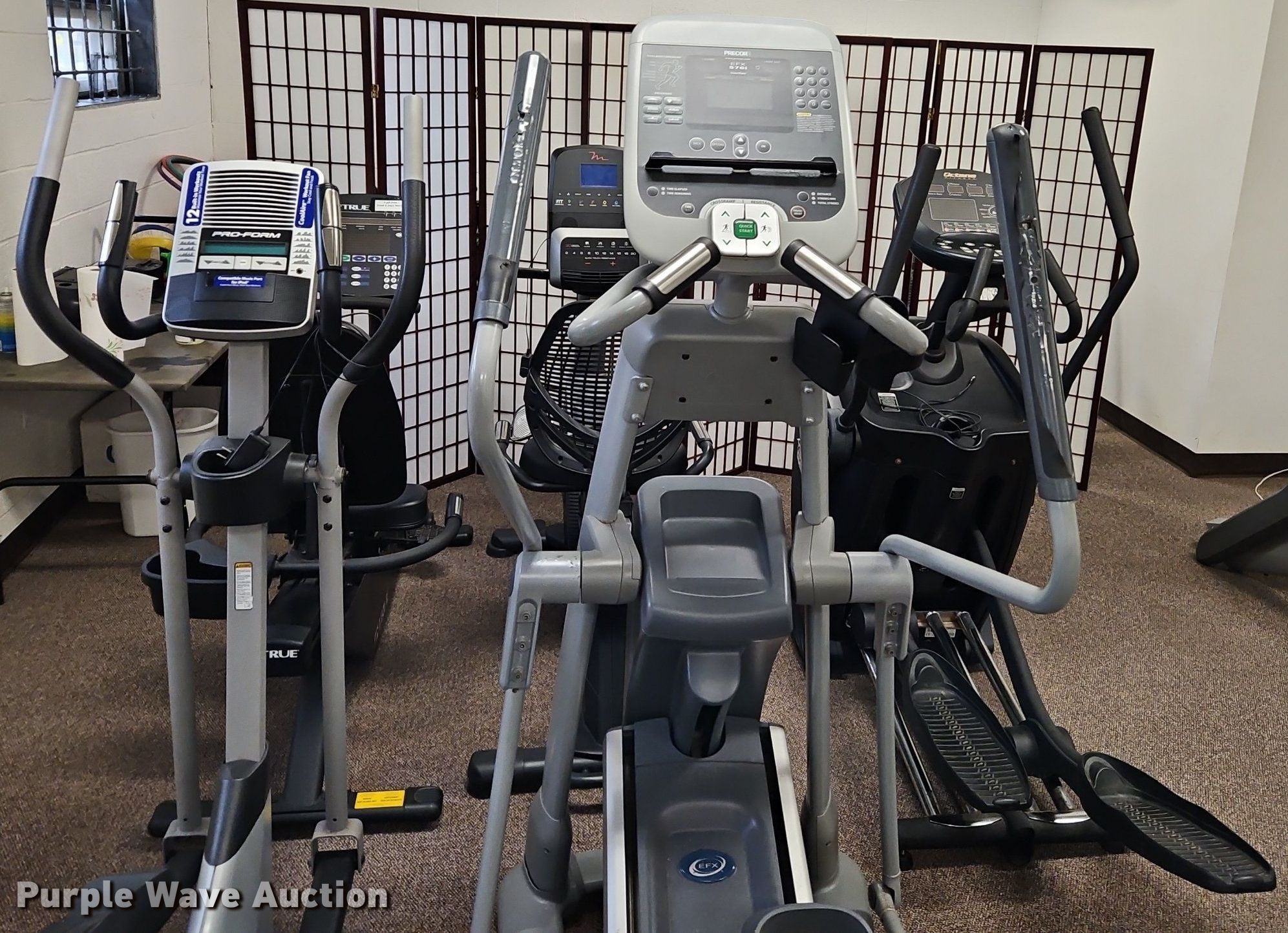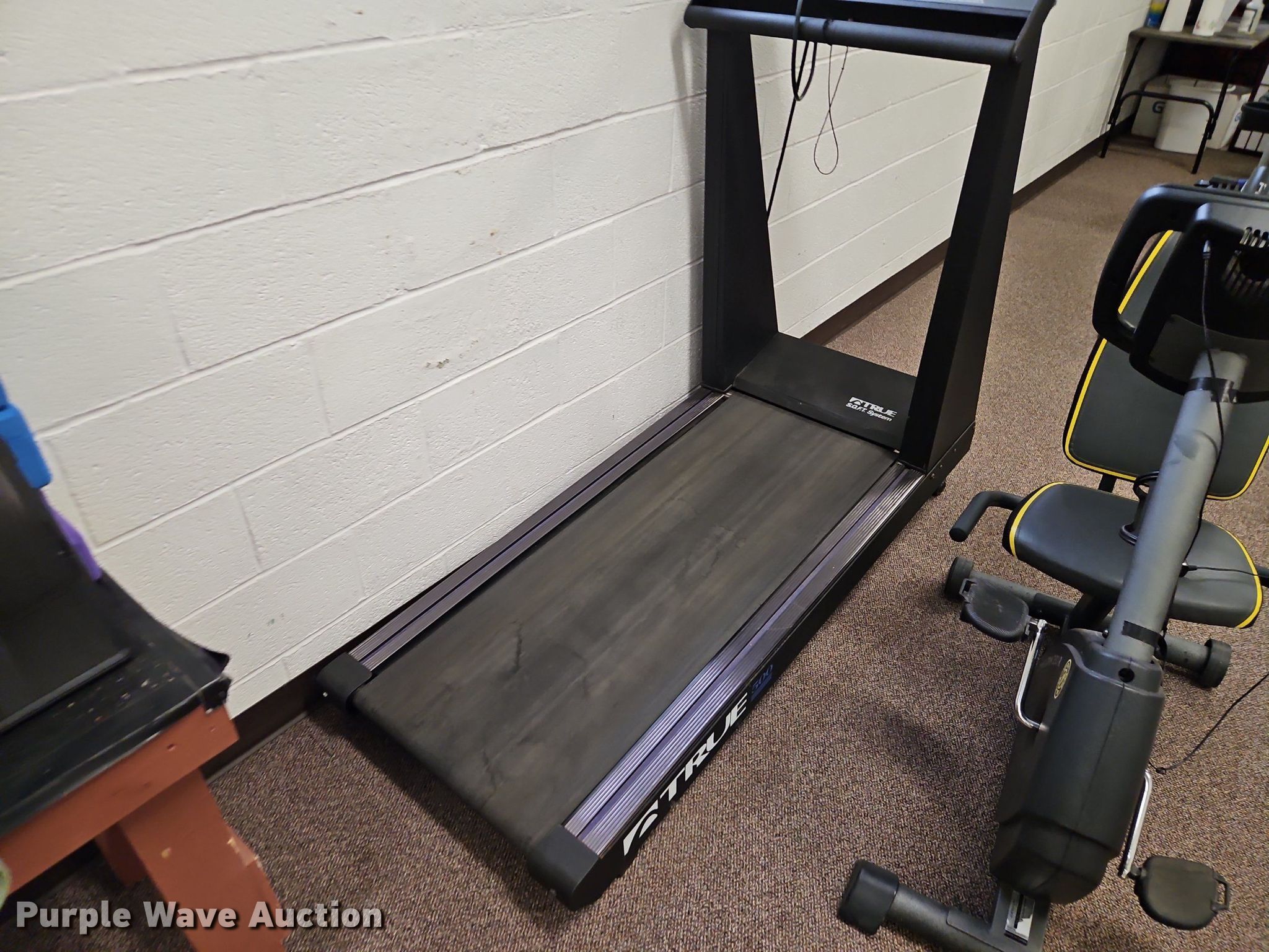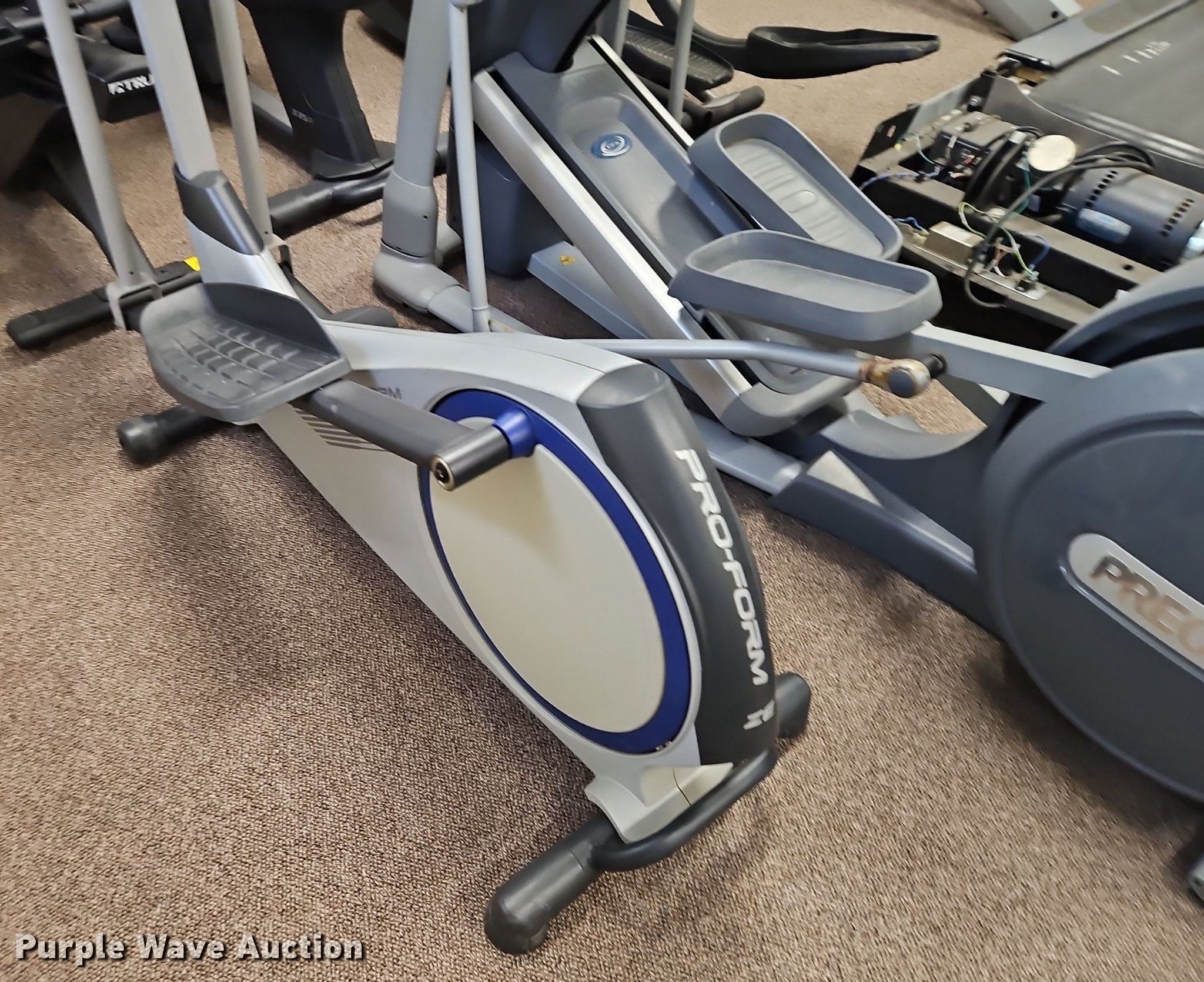 Purple Wave is selling a used Sporting Goods in Kansas. This item is a Exercise equipment with the following: (3) treadmills, (2) dissembled, (3) stationary bikes, (2) elliptical machines, Tuff Stuff leg press machine