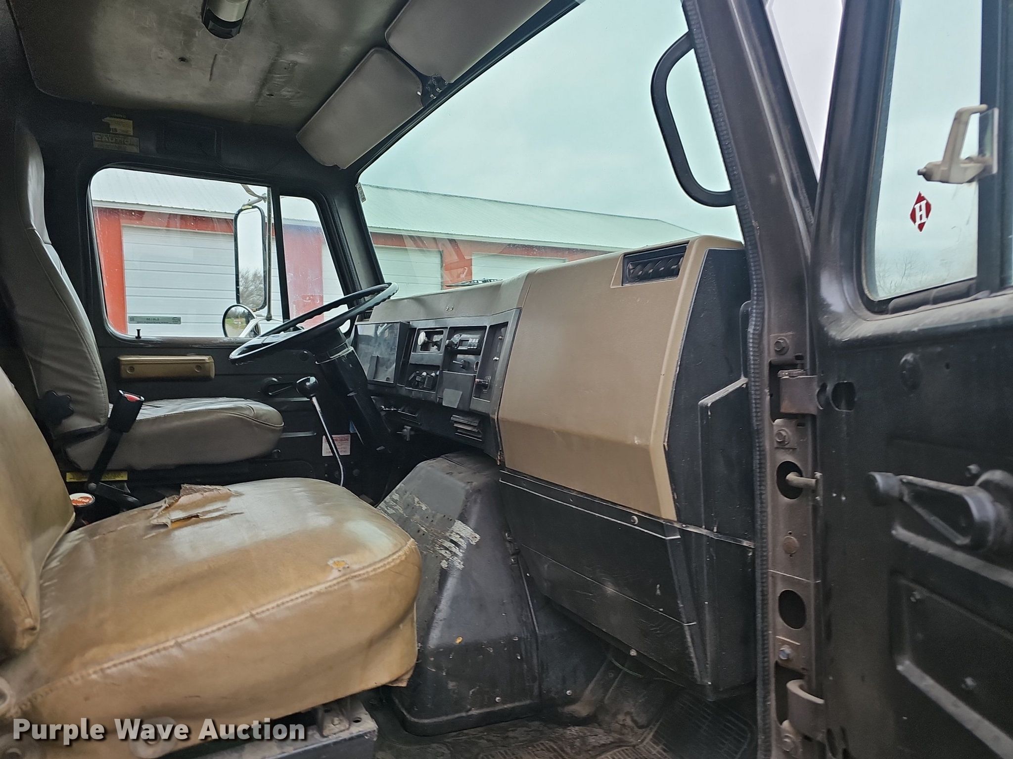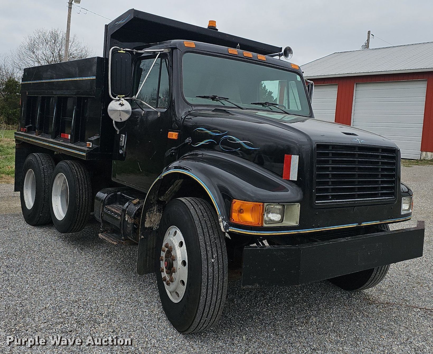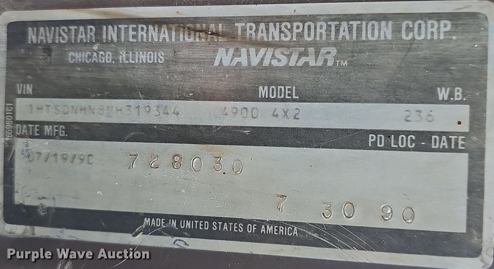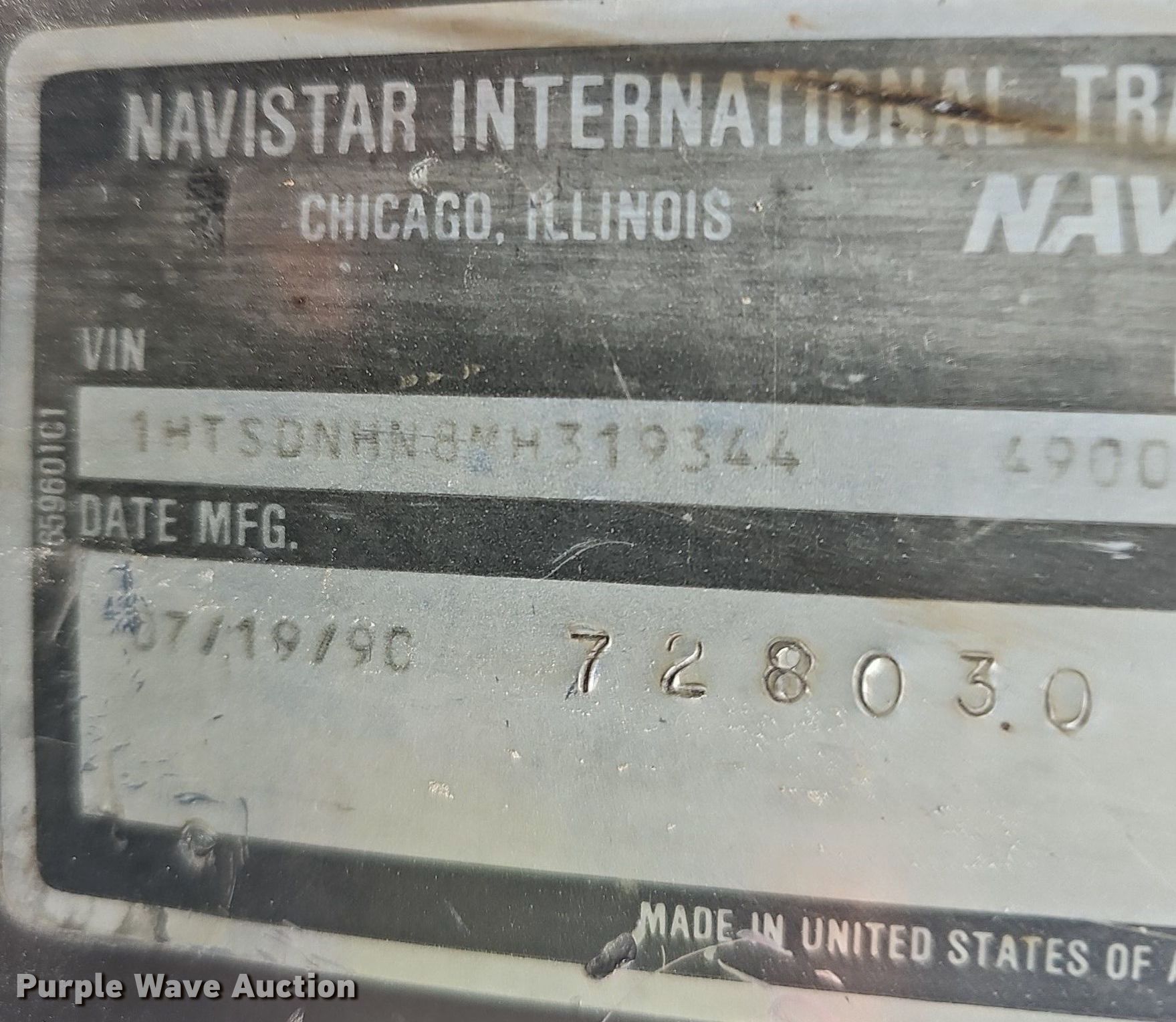 1991 International 4900 dump truck. Miles: 91,283 on odometer, VIN: 1HTSDNHN8MH319344. Engine Displacement: 7.6L, Cylinders: 6, Fuel type: Diesel. Transmission Manual, Speed: 7. Chassis Axles: Tandem, Pusher axle, Suspension: Spring, Brakes: Air, PTO, Wheelbase: 236". Interior AC, Heat. Features Dump bed 9' 10" L x 92" W, Side height: 45", Bed type: Steel, Ram: Single, End gate: Air operated. Tires Size: 11R22.5, Lift axle: 255/70R22.5. Missouri title. Title distribution may be delayed up to 14 days from verification of funds. Lawrence County, MO. 339 North Dogwood Drive. Ash Grove, MO 65604