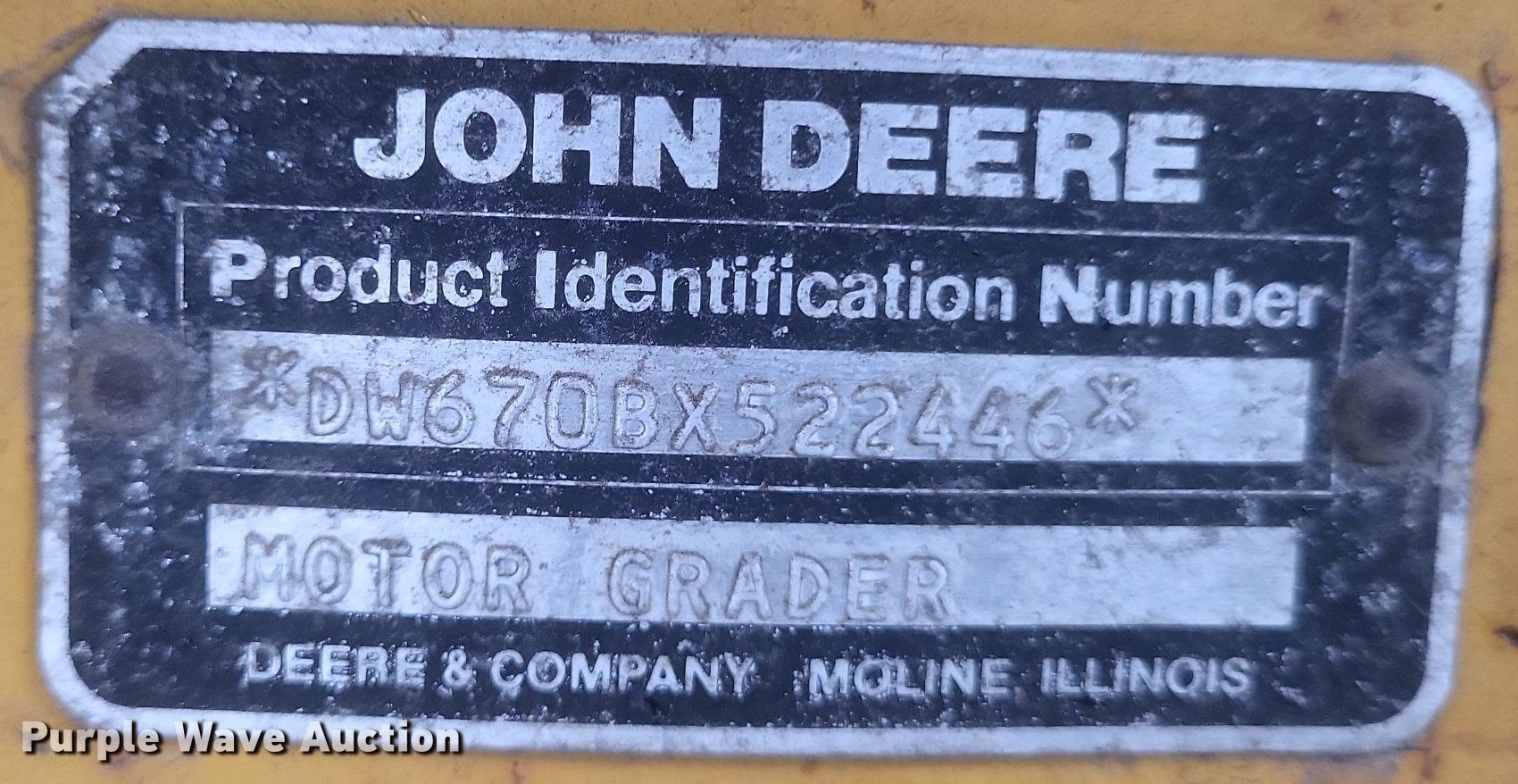 Purple Wave is selling a used Motor Grader in Missouri. This item is a 1989 John Deere 670B motor grader with the following: Hours: 651 on meter, Hour meter replaced at 8,000 hours, Serial: DW670BX522446, Unit #: G7341