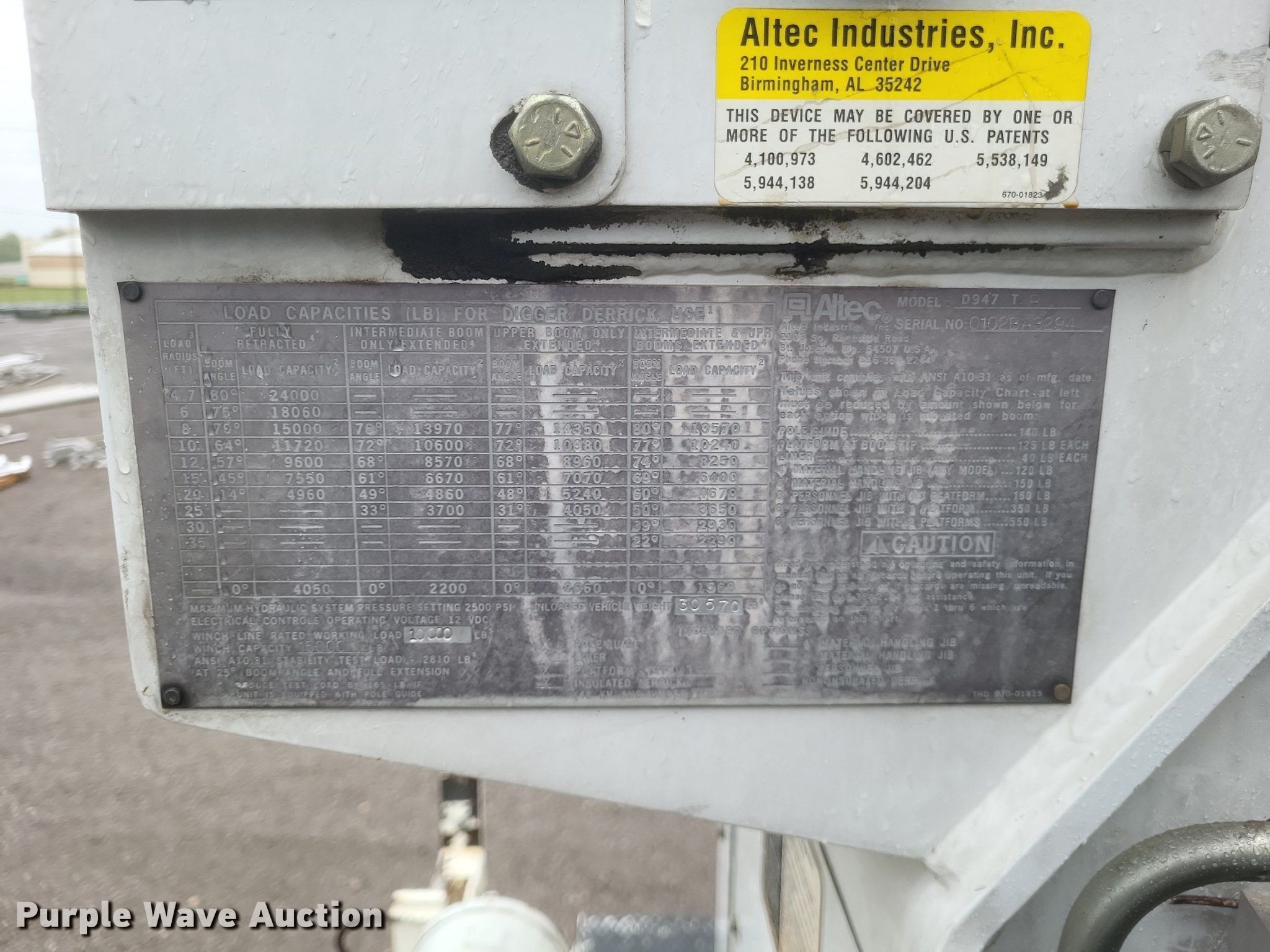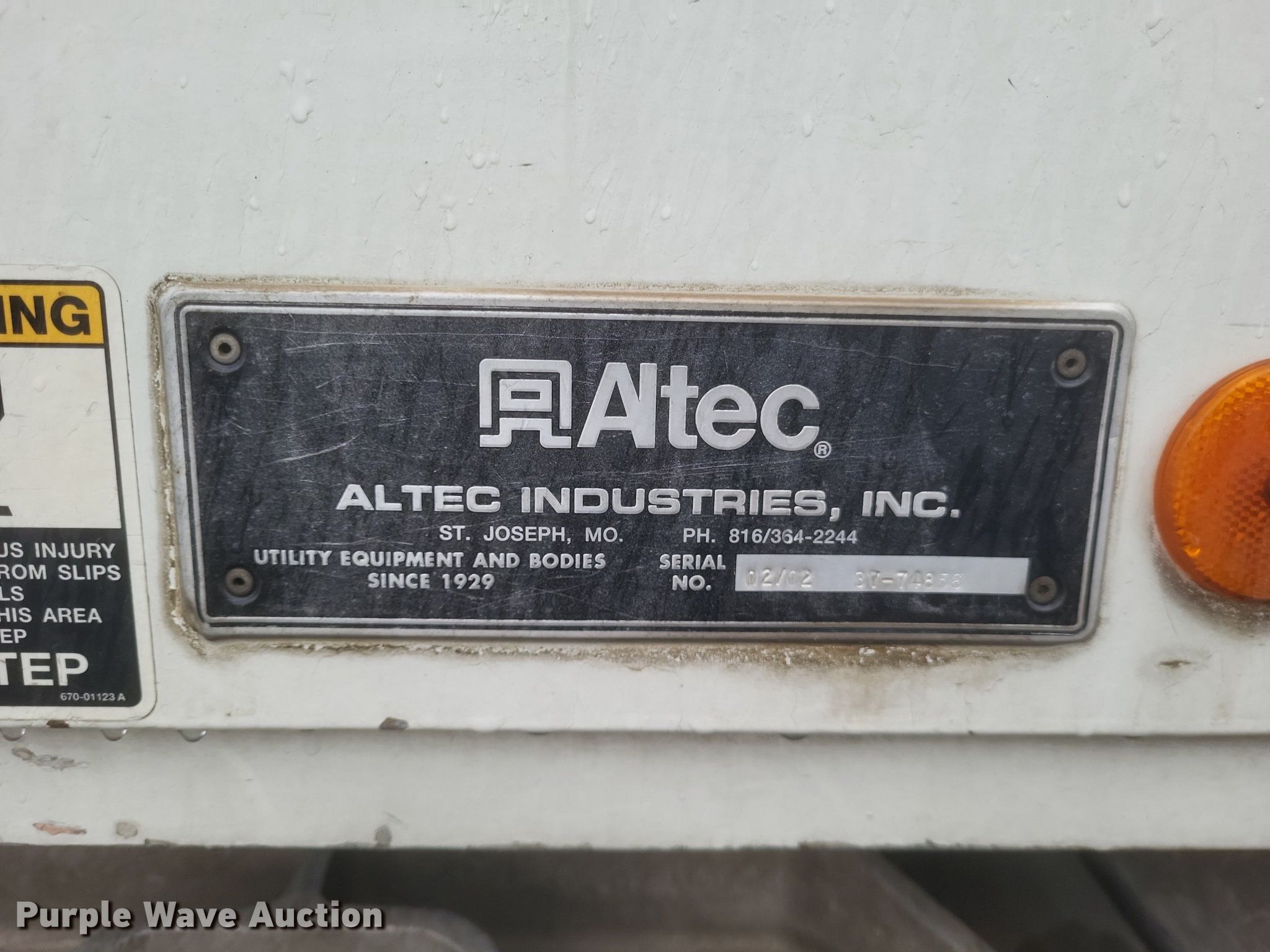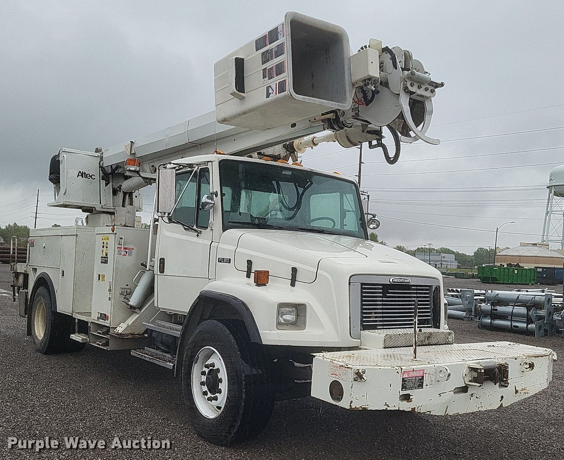 2002 Freightliner FL80 digger derrick truck. Miles: 96,517 on odometer, Hours: 4,743 on meter, VIN: 1FVABXAK62HJ57497, Unit #: 21. Engine Caterpillar 3126, Serial: CKM33625, Displacement: 7.2L, Cylinders: 6, Fuel type: Diesel. Transmission Manual, Speed: 6, plus 2. Chassis Axles: Single, Suspension: Spring, Brakes: Air, PTO, GVWR: 41,000 lbs. Interior Heat, Heated mirrors, Cruise control, Brake controller. Features Bed Altec, Serial: 37-74856, 15' 11" L x 93" W, Boom Altec D947 TR, Serial: 0102BA3294, Boom length: 35', Maximum lift capacity: 24,000 lbs, Boom type: Articulating, Telescopic, Man basket, Boom controls Ground, Platform/ basket, Pressure digger, Pole guide, Auger Diameter: 18", Certification valid through: 5/2024. Tires Front: 315/80R22.5, Rear: 11R22.5. Missouri title. Title distribution may be delayed up to 30 days from verification of funds. Sikeston Board of Municipal Utilities. 391 North West Street. Sikeston, MO 63801