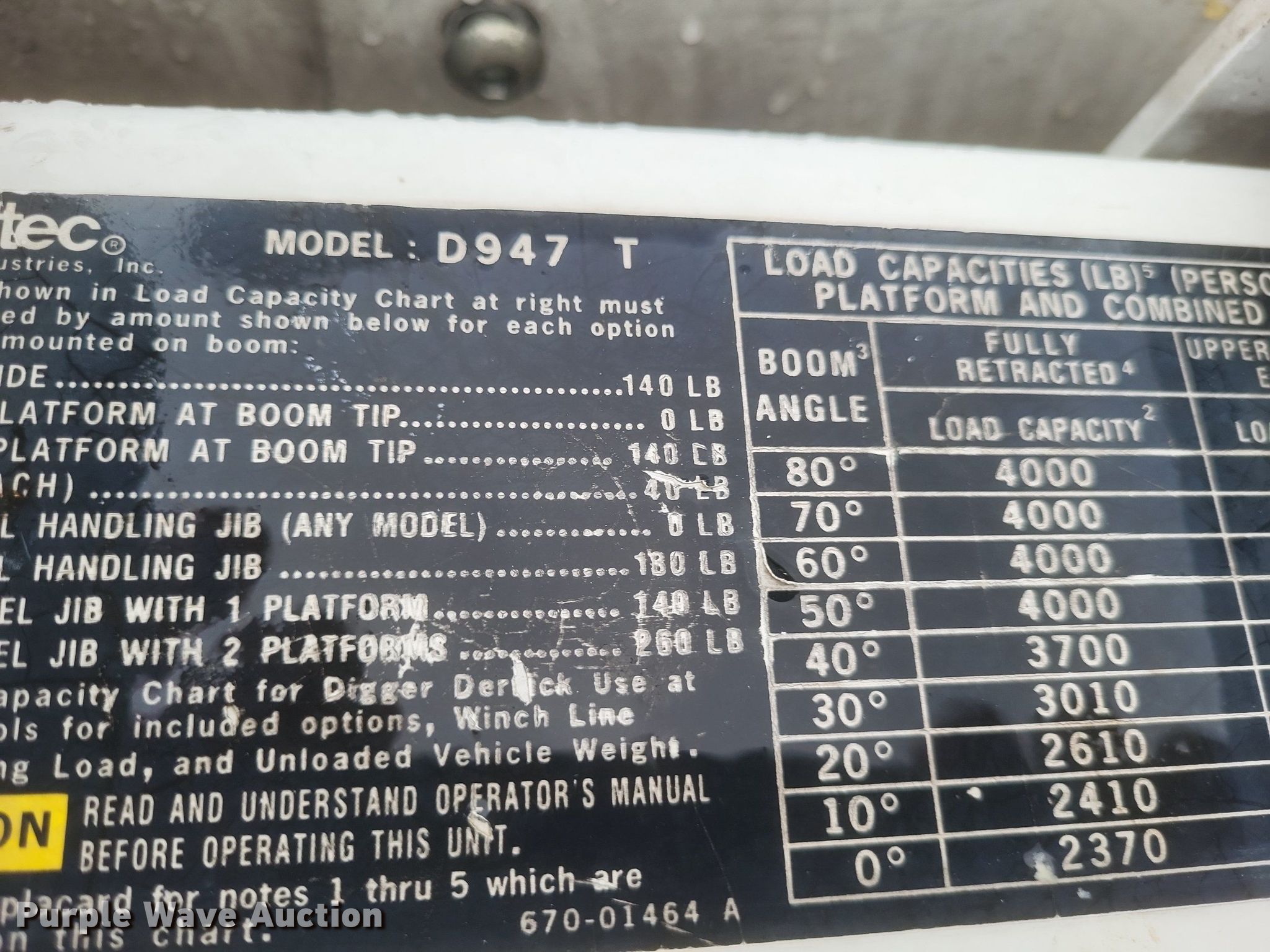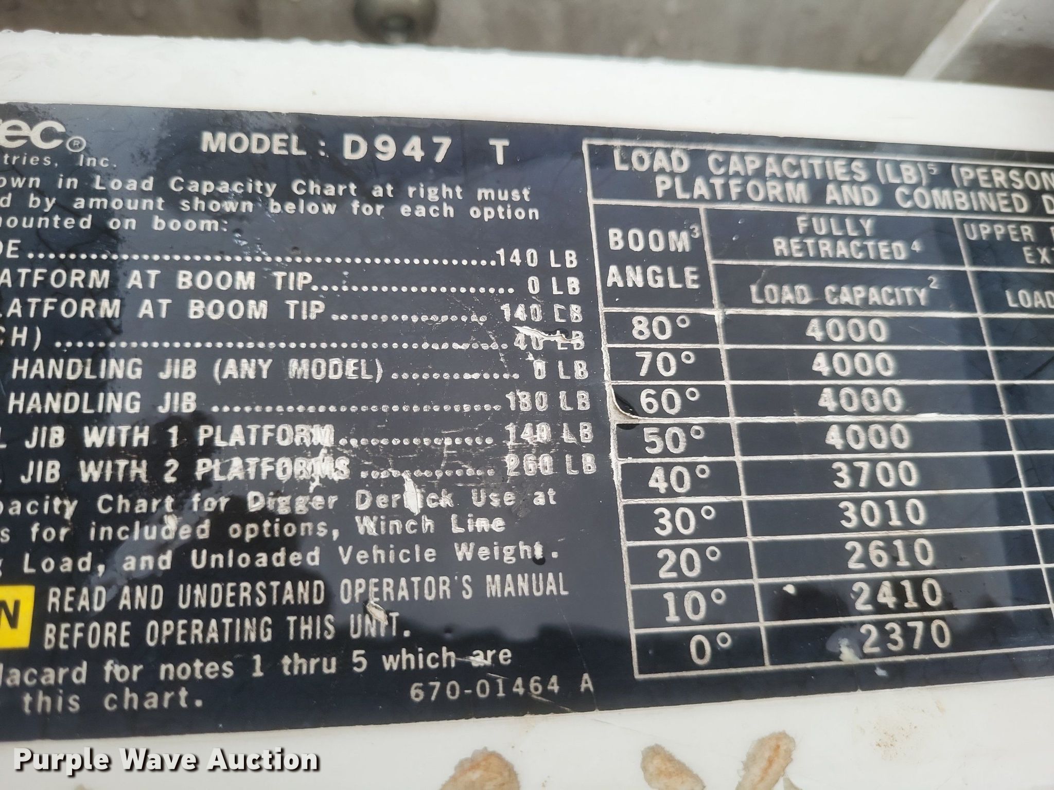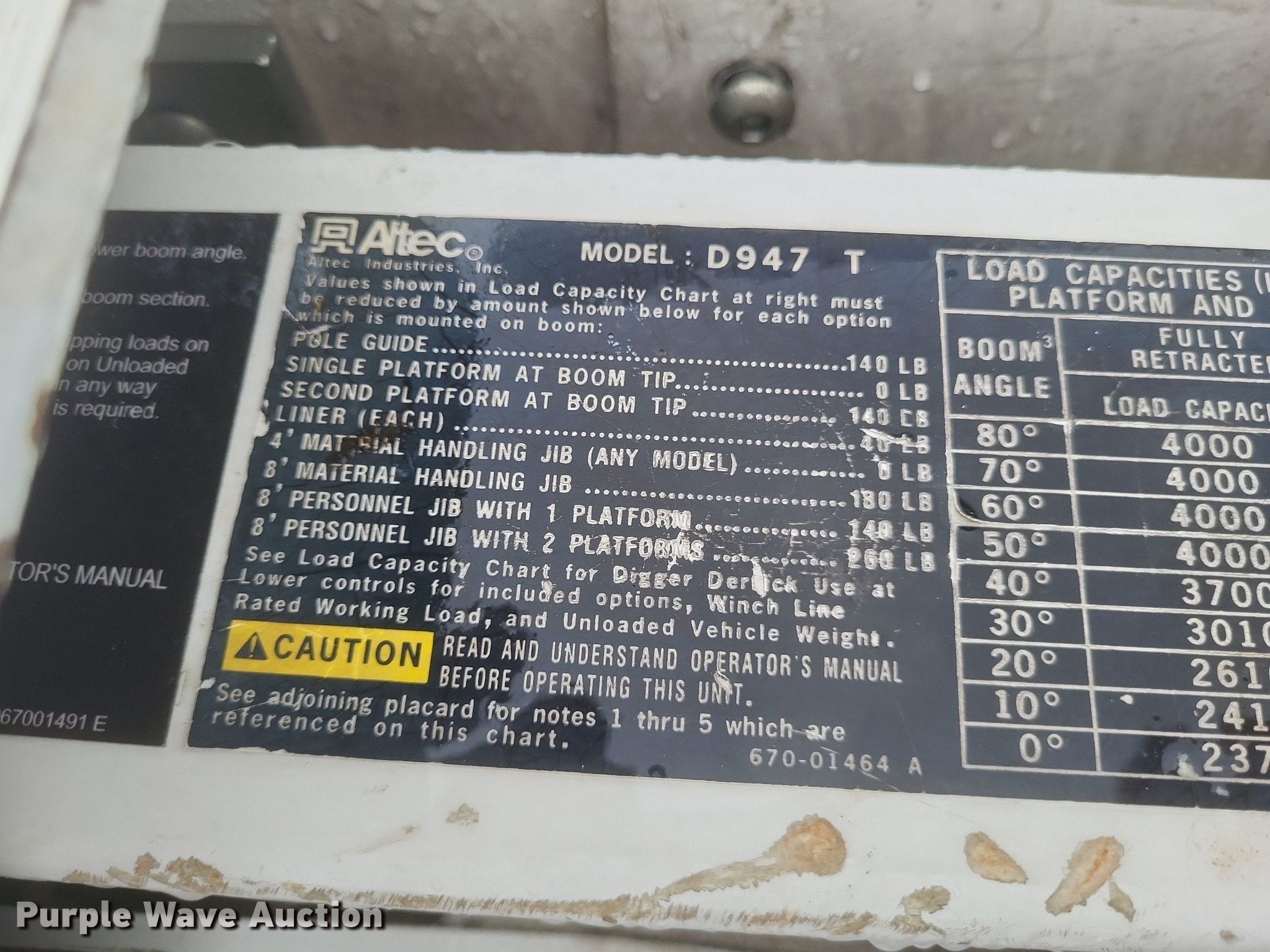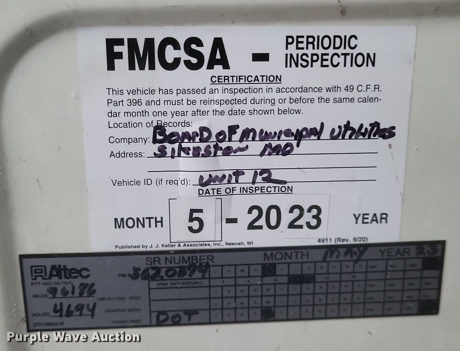 2002 Freightliner FL80 digger derrick truck. Miles: 96,517 on odometer, Hours: 4,743 on meter, VIN: 1FVABXAK62HJ57497, Unit #: 21. Engine Caterpillar 3126, Serial: CKM33625, Displacement: 7.2L, Cylinders: 6, Fuel type: Diesel. Transmission Manual, Speed: 6, plus 2. Chassis Axles: Single, Suspension: Spring, Brakes: Air, PTO, GVWR: 41,000 lbs. Interior Heat, Heated mirrors, Cruise control, Brake controller. Features Bed Altec, Serial: 37-74856, 15' 11" L x 93" W, Boom Altec D947 TR, Serial: 0102BA3294, Boom length: 35', Maximum lift capacity: 24,000 lbs, Boom type: Articulating, Telescopic, Man basket, Boom controls Ground, Platform/ basket, Pressure digger, Pole guide, Auger Diameter: 18", Certification valid through: 5/2024. Tires Front: 315/80R22.5, Rear: 11R22.5. Missouri title. Title distribution may be delayed up to 30 days from verification of funds. Sikeston Board of Municipal Utilities. 391 North West Street. Sikeston, MO 63801