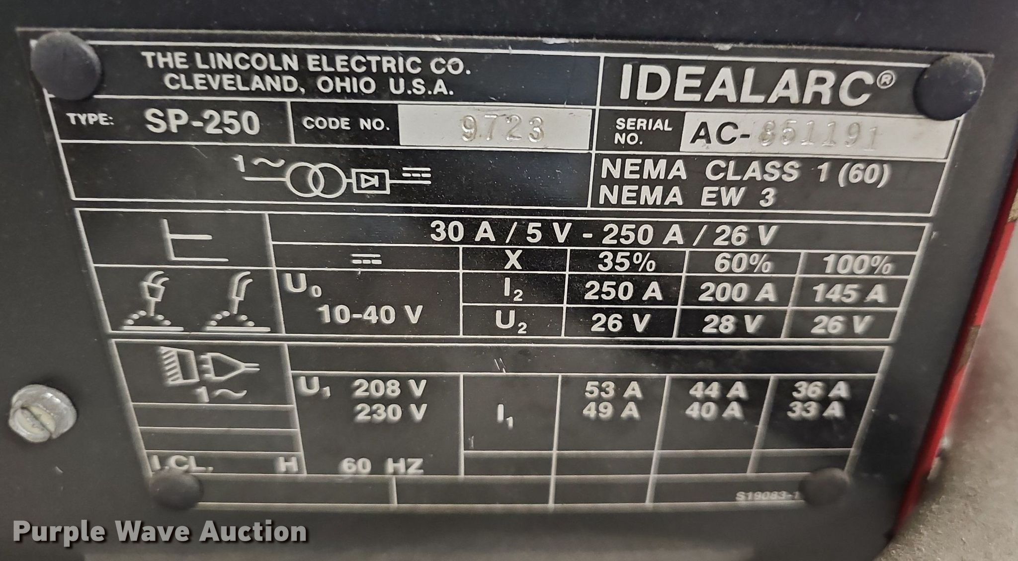 Purple Wave is selling a used Welder (Manual) in Kansas. This item is a Lincoln Electric IdealArc SP250 welder with the following: Serial: AC851191, Phase: Single