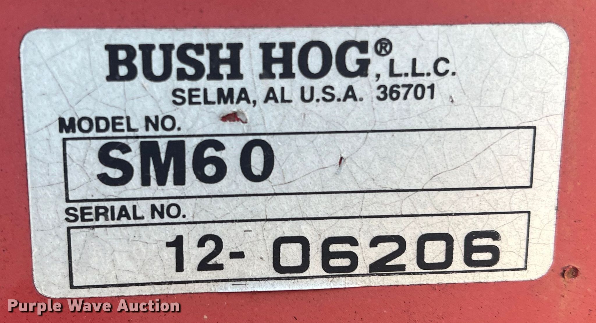 Purple Wave is selling a used Mower, Cutter, Shredder in Texas. This item is a Bush Hog SM60 side boom rotary mower with the following: Serial: 12-06206